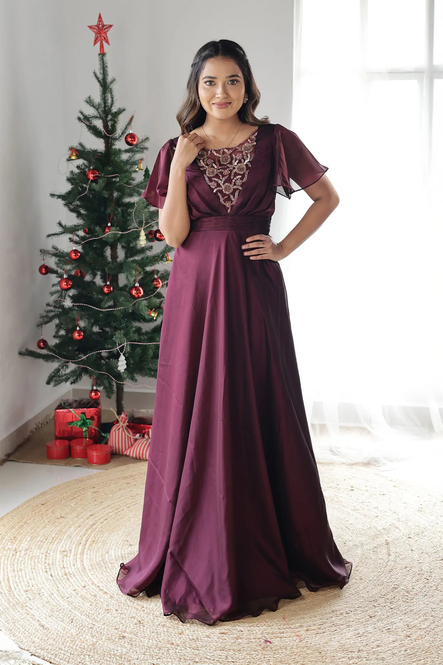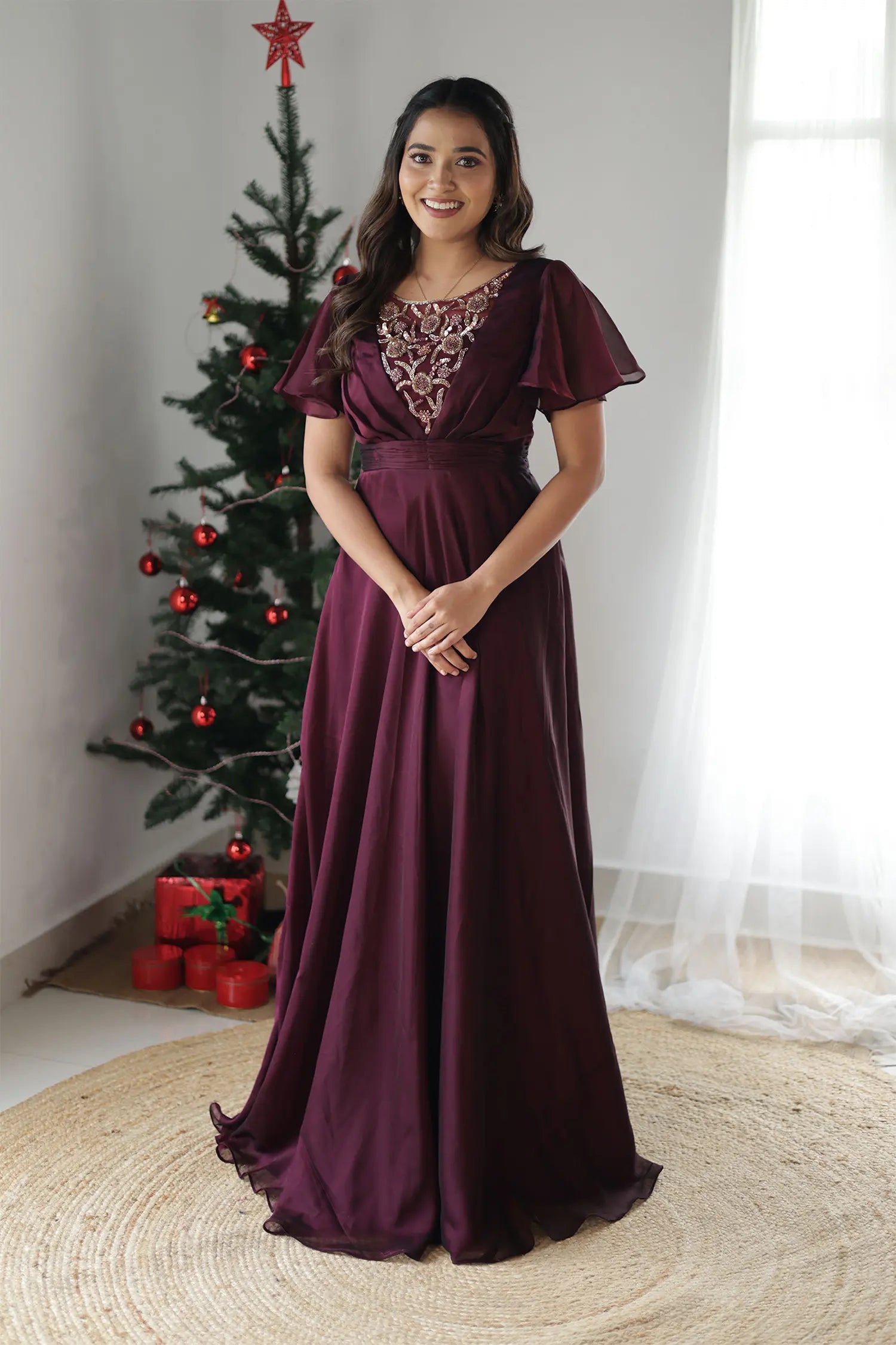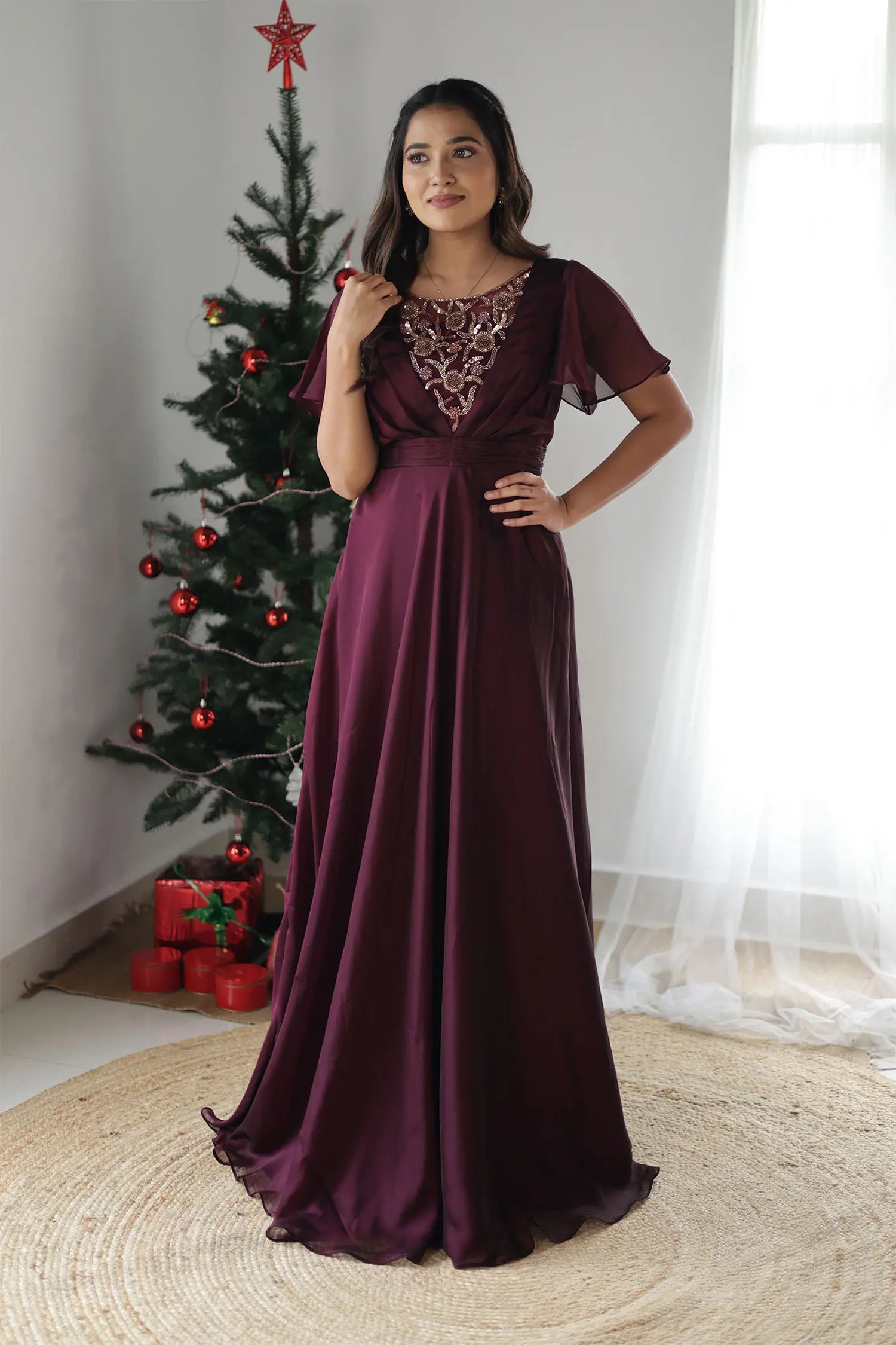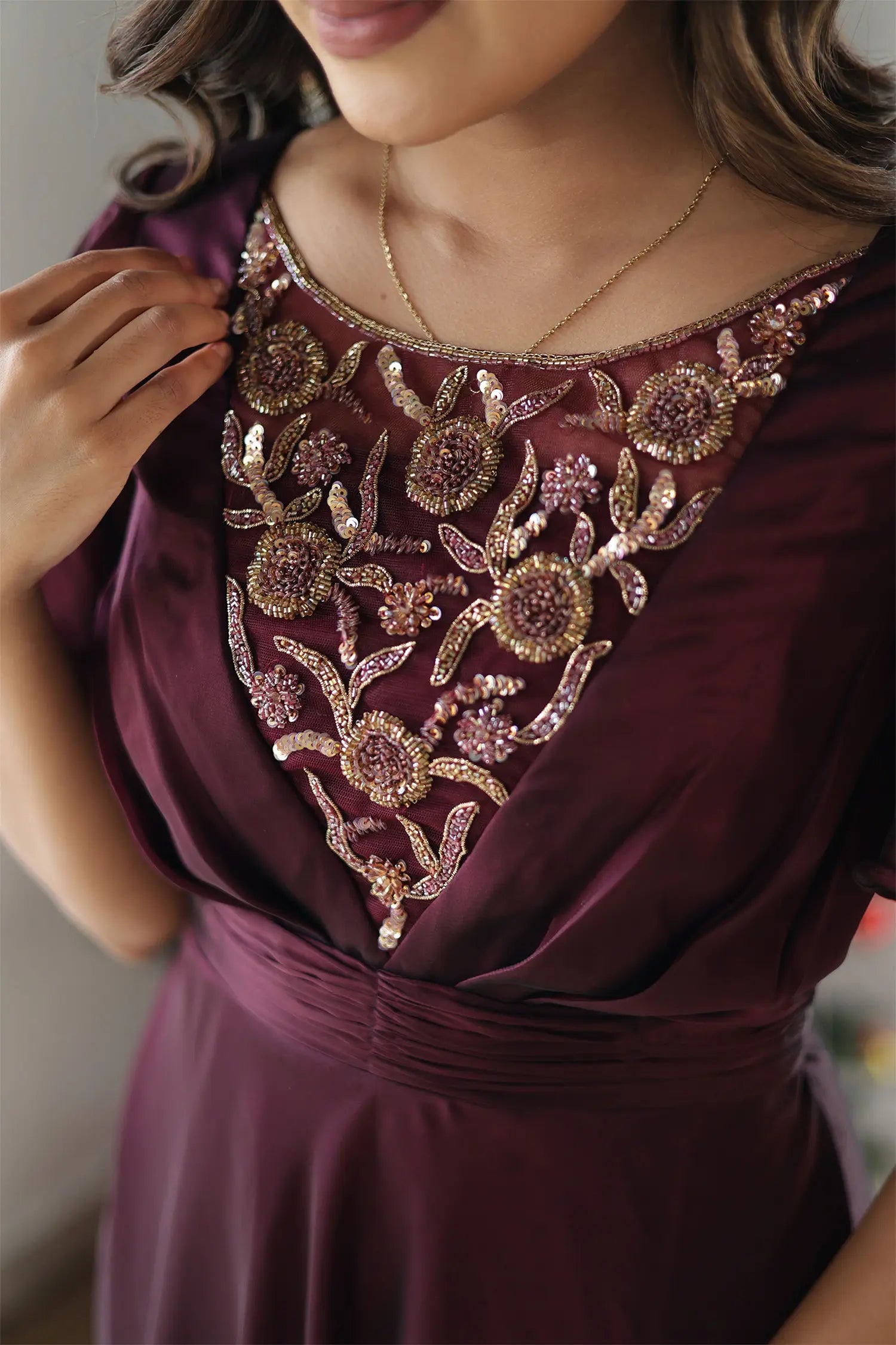| Style | Evening gown in wine shade with handwork detailing on neckline and butterfly sleeves |