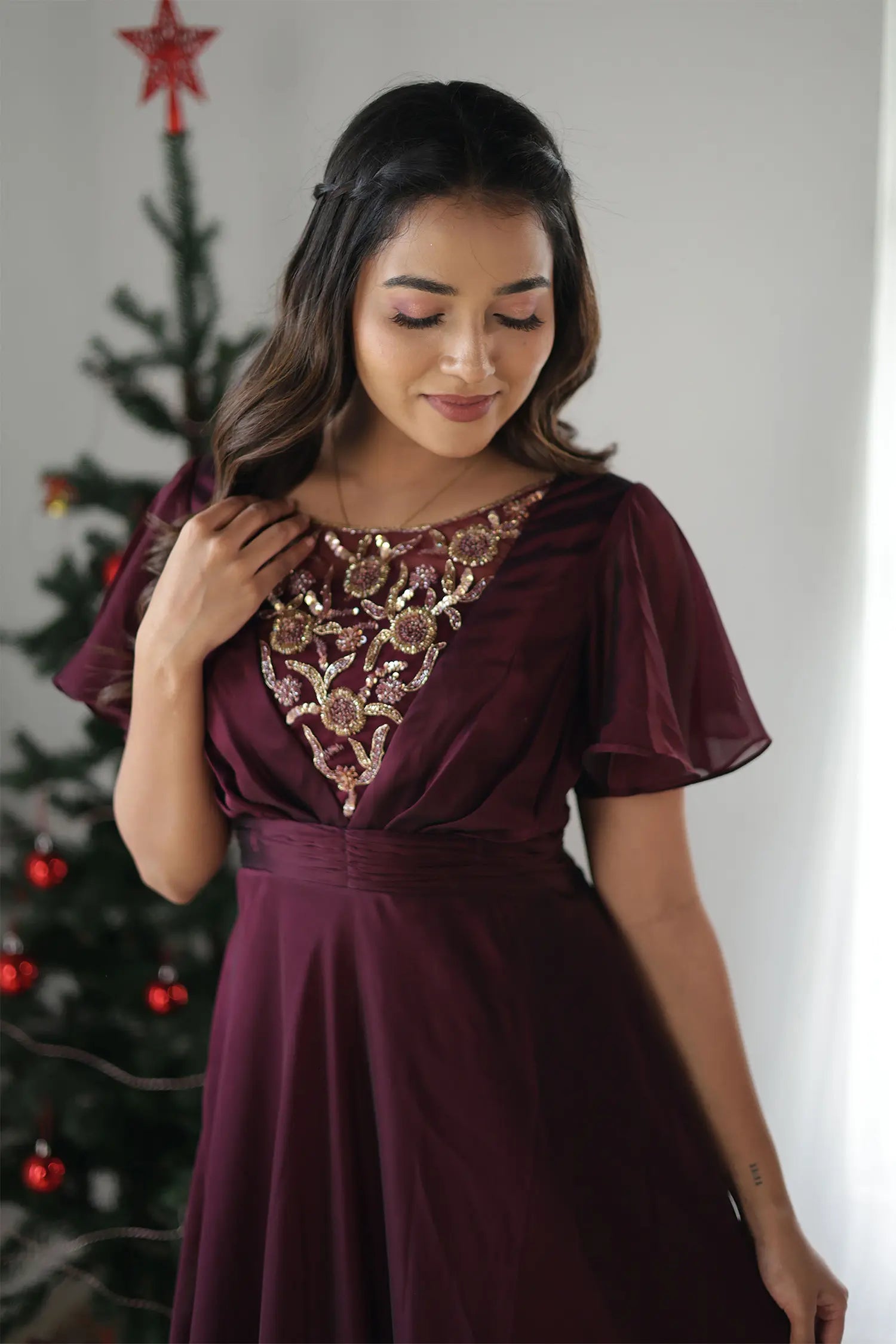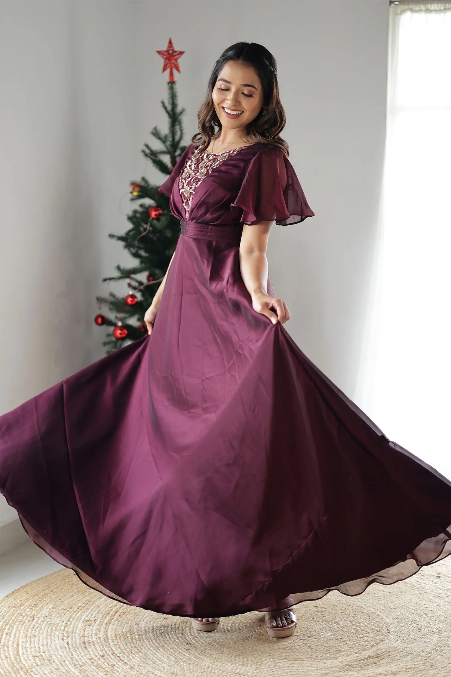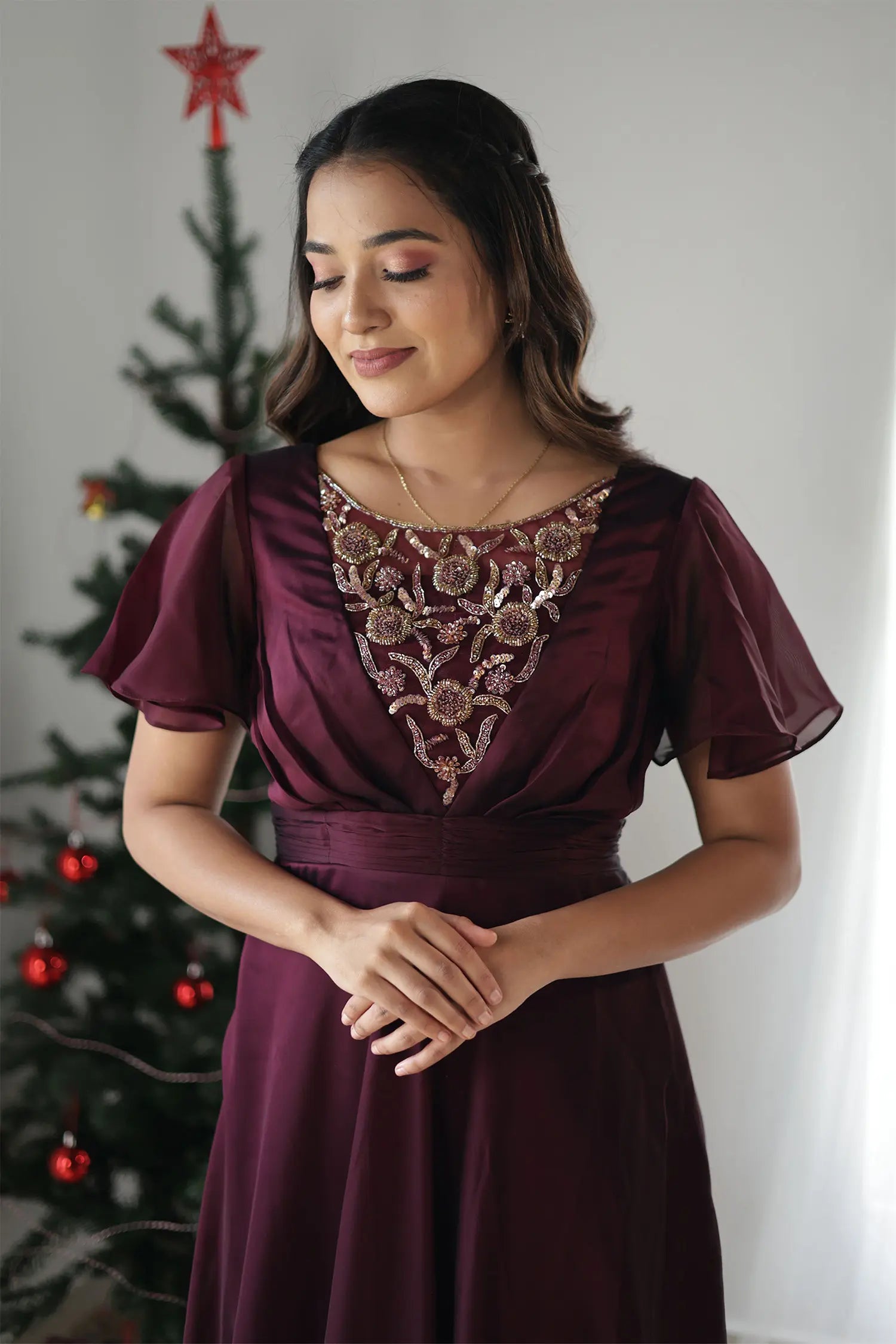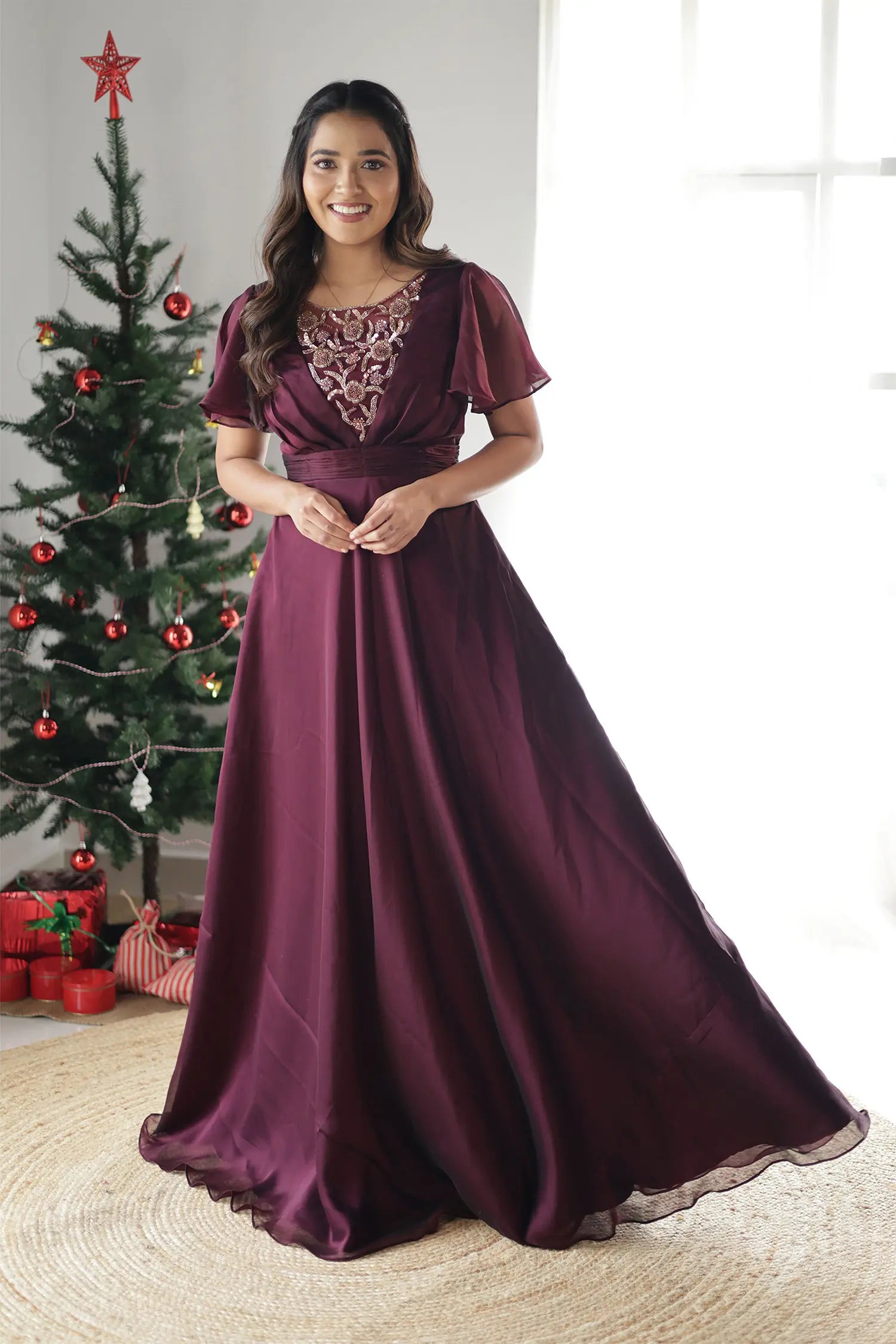 | Style | Evening gown in wine shade with handwork detailing on neckline and butterfly sleeves |