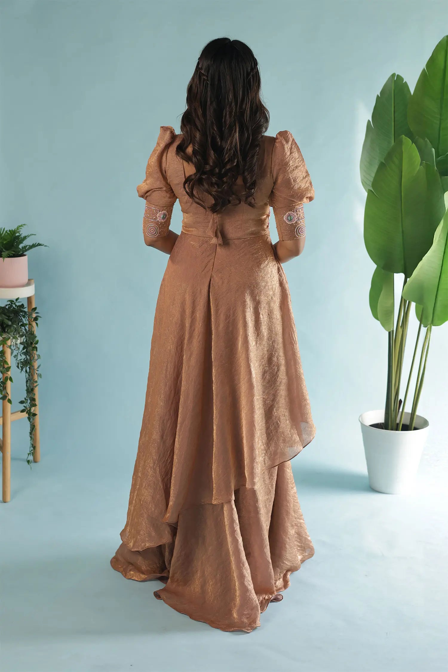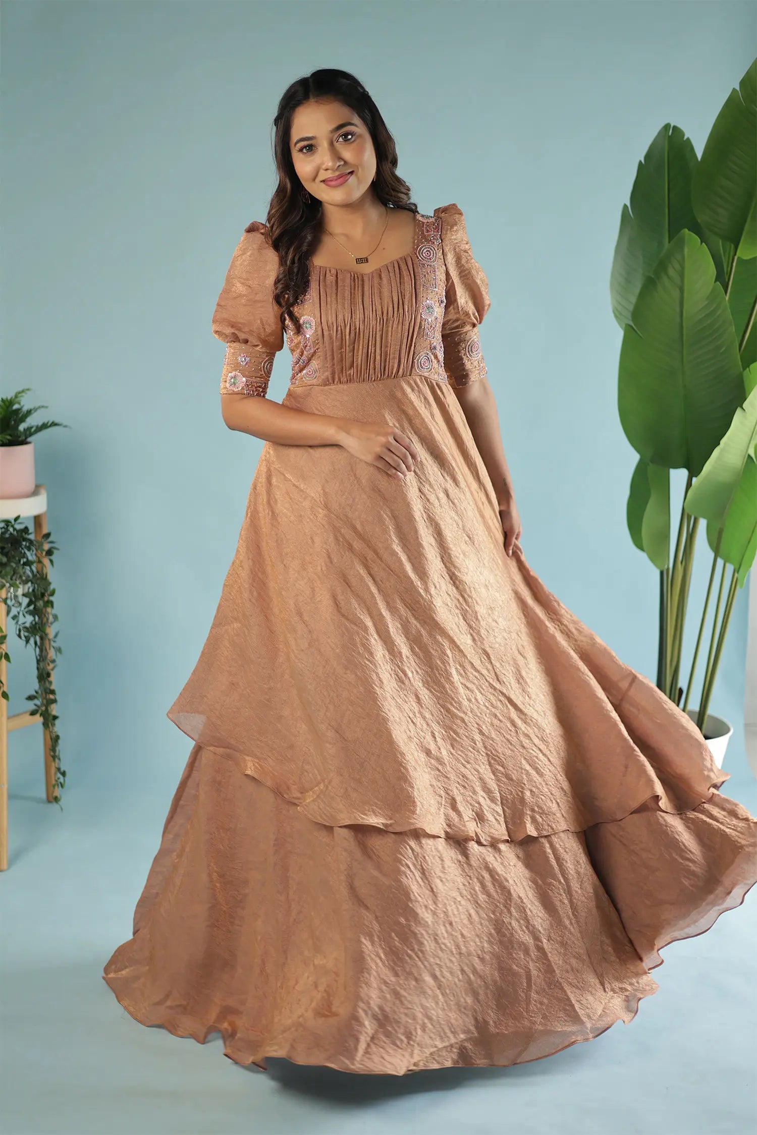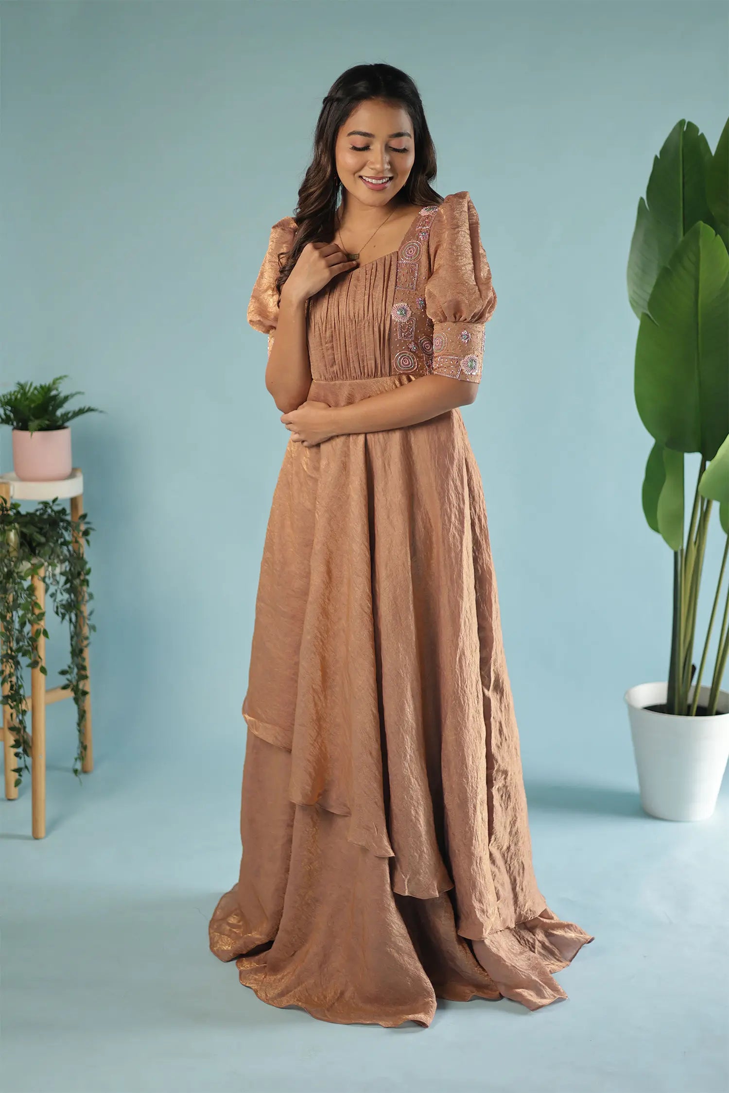| Style | Layered dual-tone Fendi silk gown in gold shade with beadwork detailing on yoke and sleeves |
