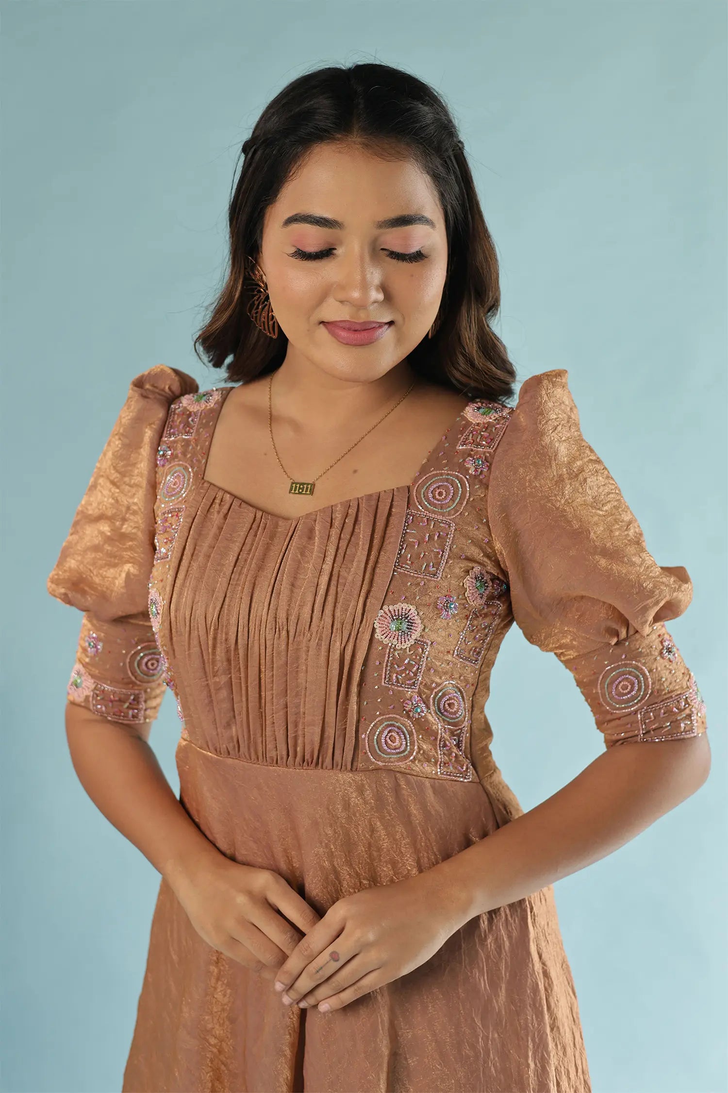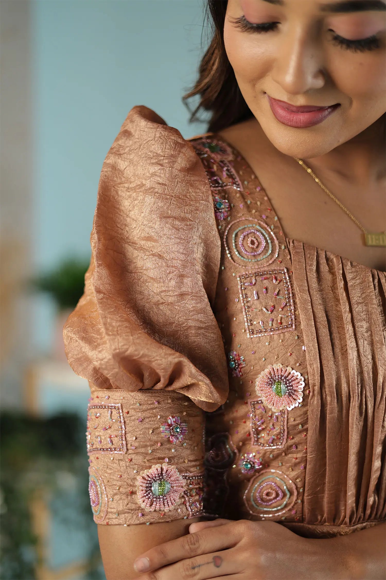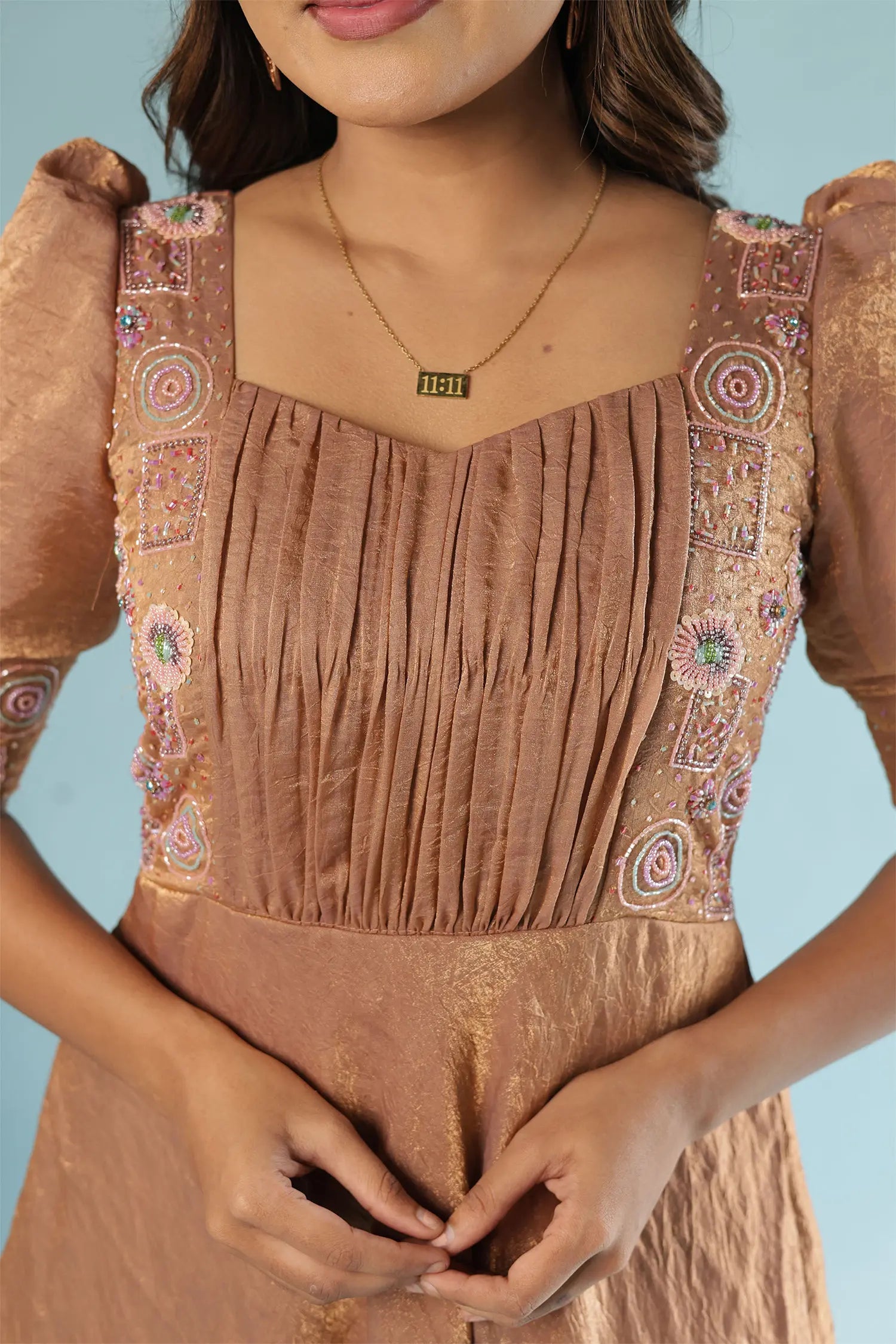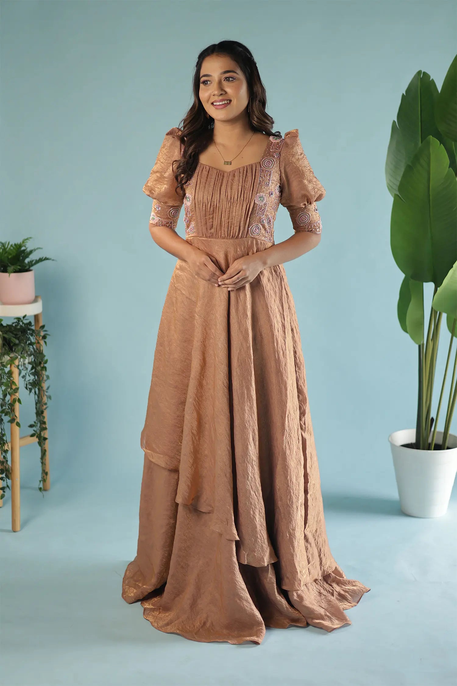 | Style | Layered dual-tone Fendi silk gown in gold shade with beadwork detailing on yoke and sleeves |