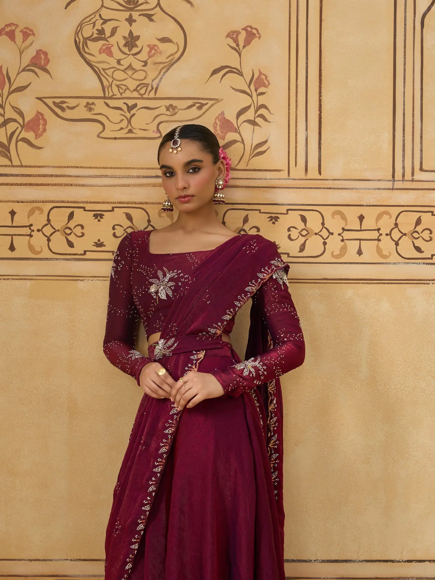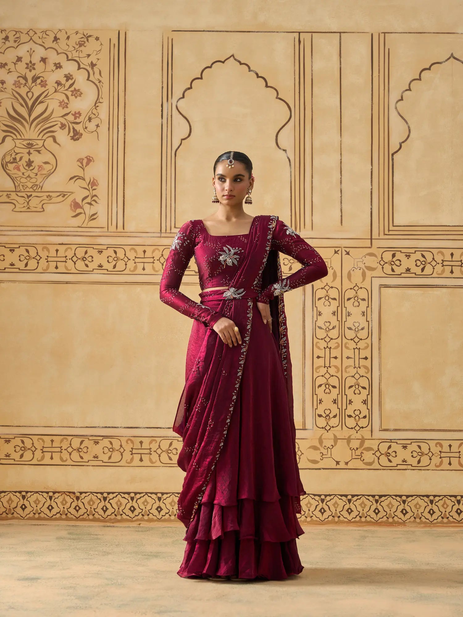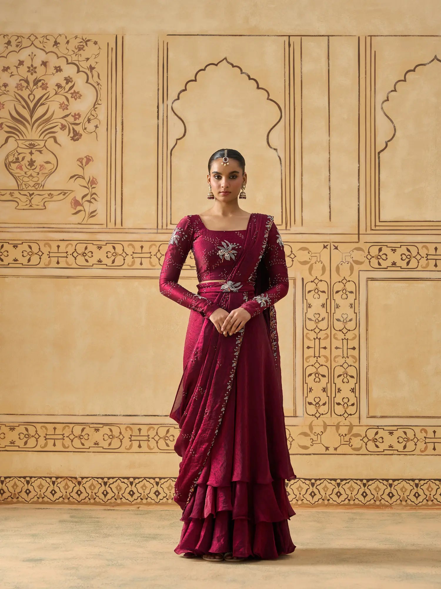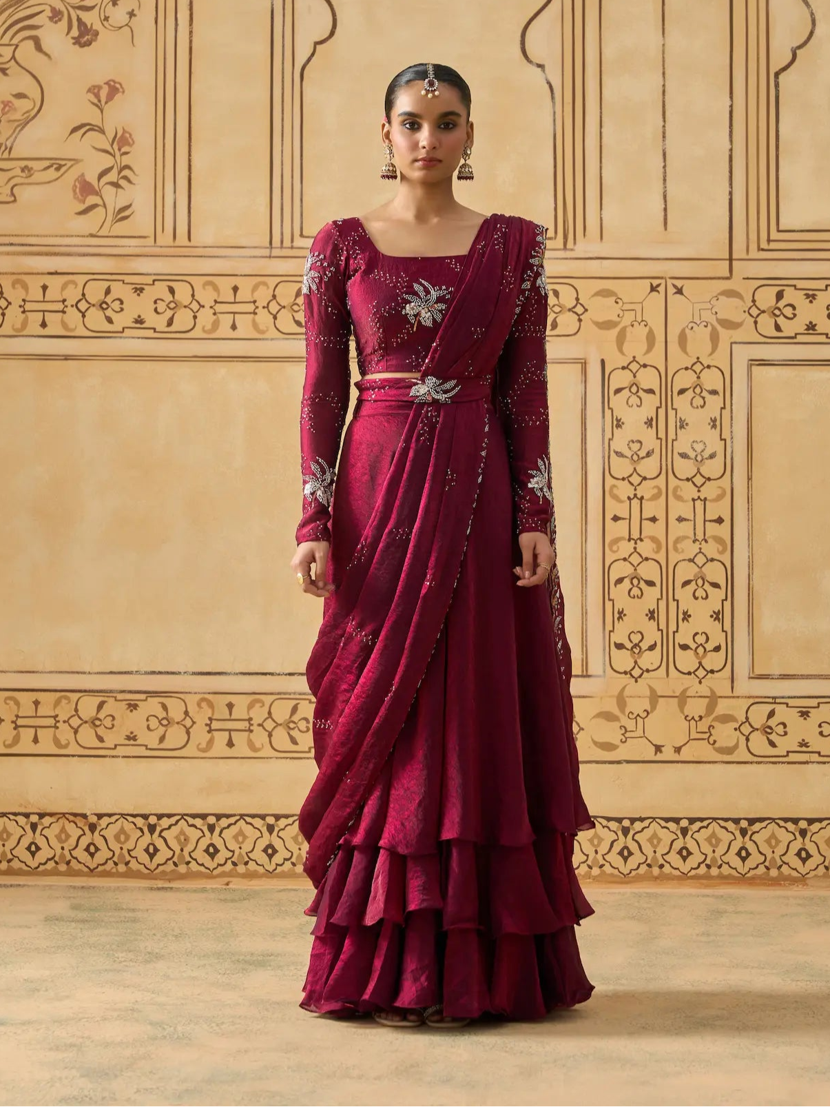 | Description | A striking fusion of modern draping and traditional embroidery, this crimson lehenga set is crafted in a textured silk blend with a rich fall. The fitted crop top features a square neckline and full sleeves, adorned with intricate thread embroidery, sequins, and cutdana detailing. The highlight is the pre-draped lehenga, designed with cascading layers and an attached pallu-style drape, cinched elegantly at the waist with hand-embroidered motifs. The layered hemline adds drama and movement, making it a statement look for grand celebrations. |