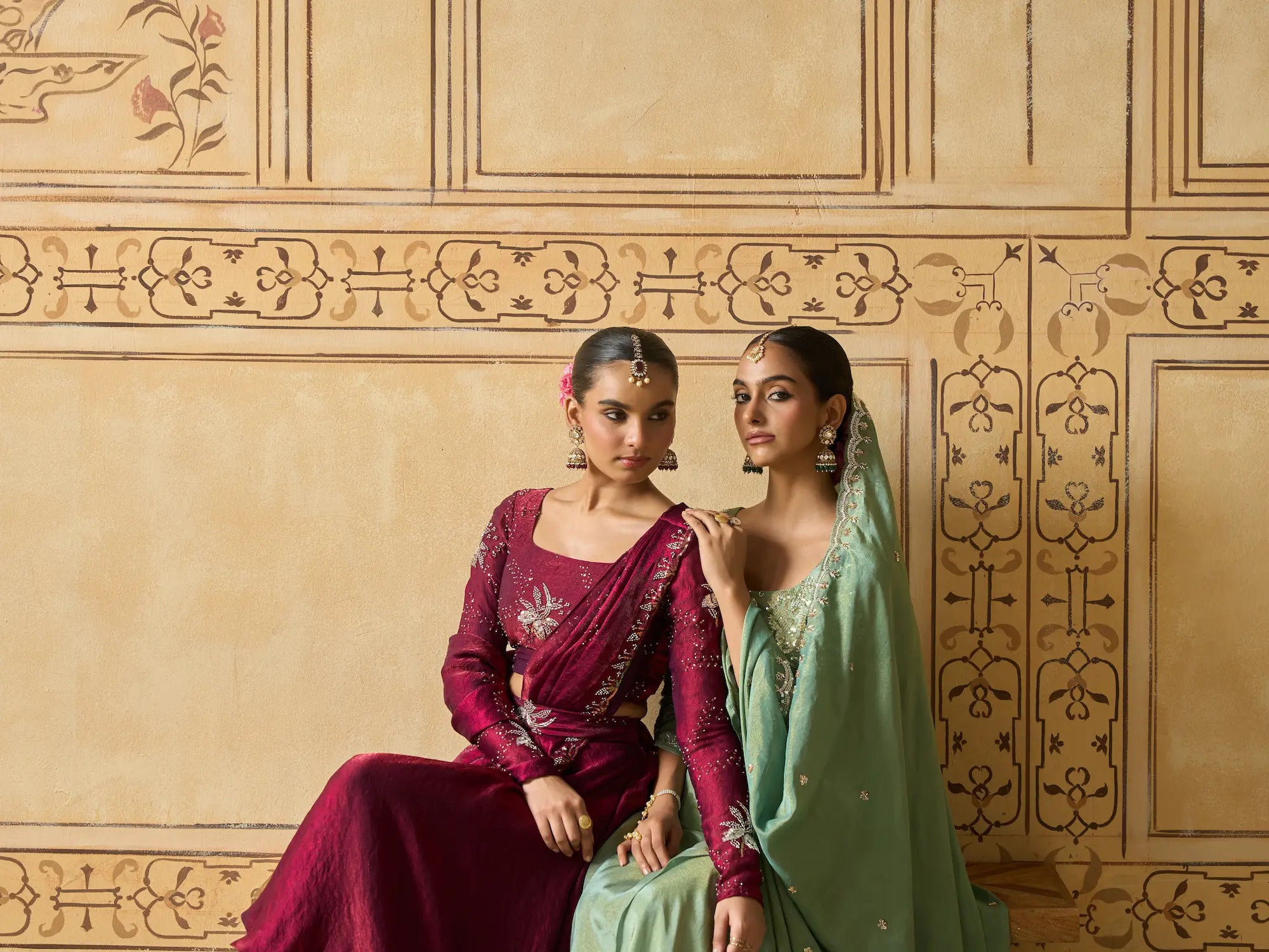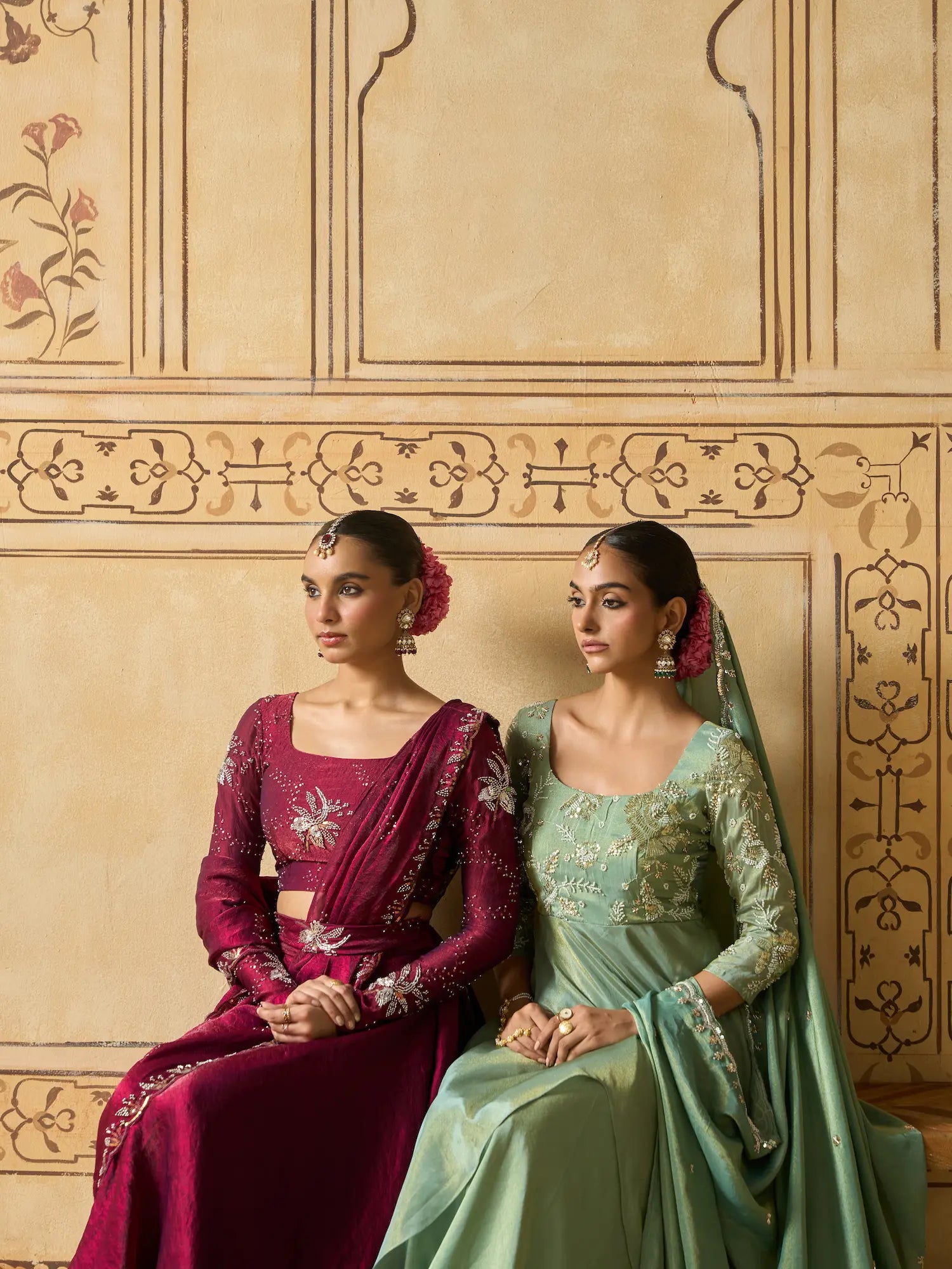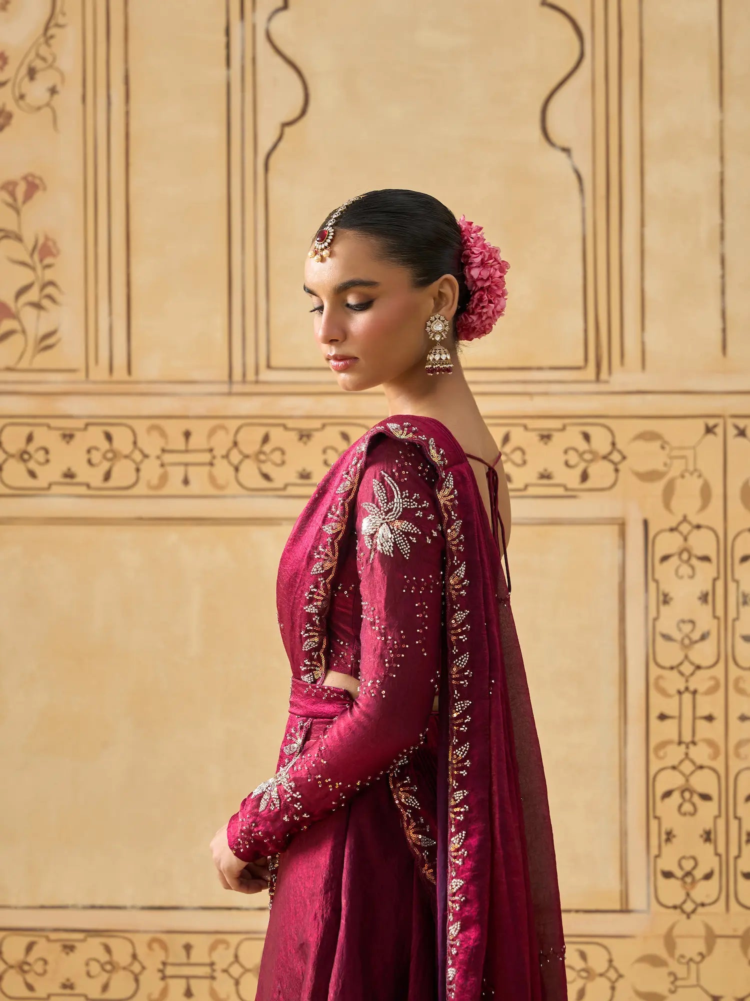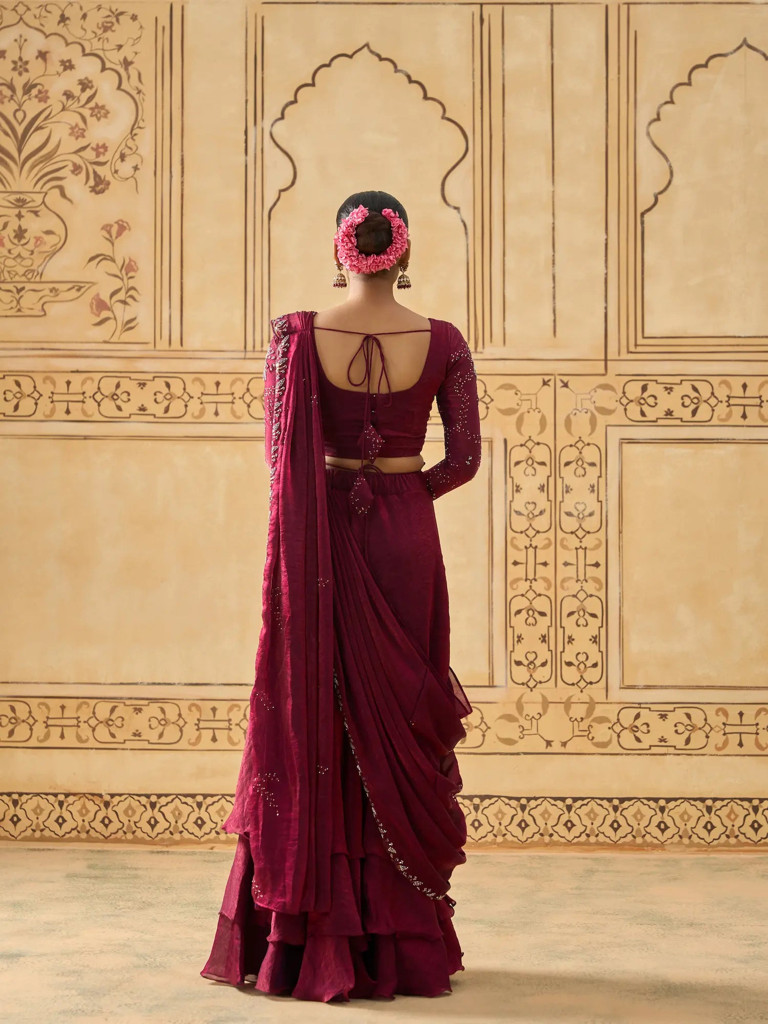 | Description | A striking fusion of modern draping and traditional embroidery, this crimson lehenga set is crafted in a textured silk blend with a rich fall. The fitted crop top features a square neckline and full sleeves, adorned with intricate thread embroidery, sequins, and cutdana detailing. The highlight is the pre-draped lehenga, designed with cascading layers and an attached pallu-style drape, cinched elegantly at the waist with hand-embroidered motifs. The layered hemline adds drama and movement, making it a statement look for grand celebrations. |
