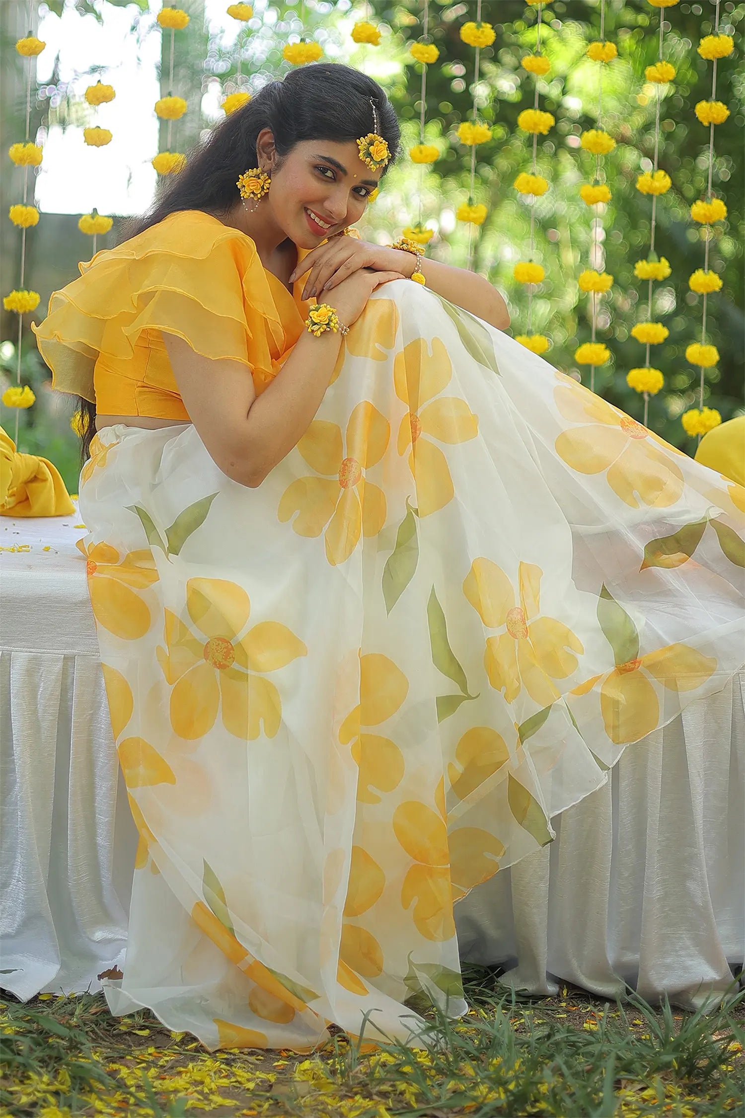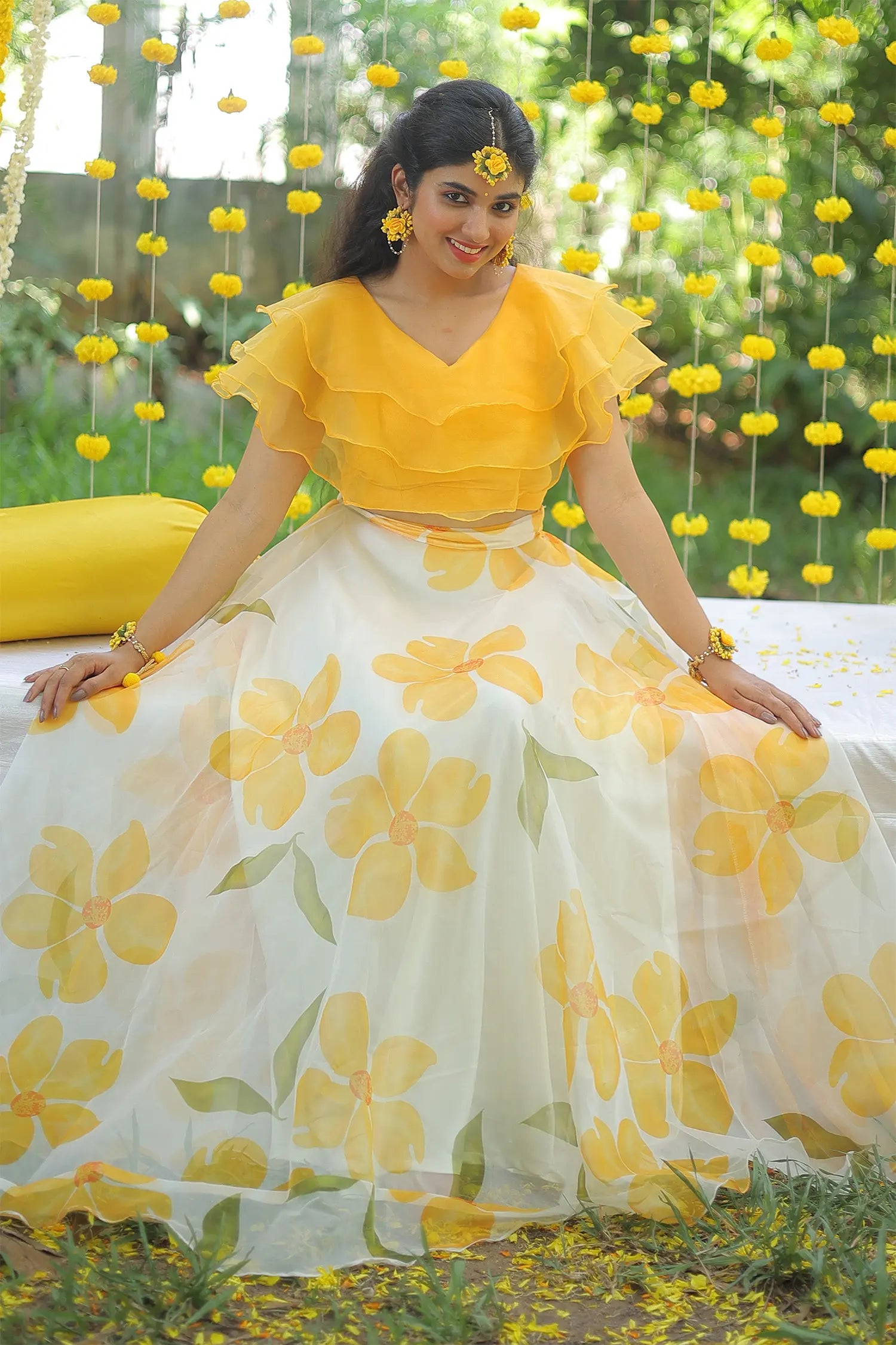| Description | Halter top paired with a flared floral skirt, designed as a stylish and vibrant Haldi set for pre-wedding celebrations. |