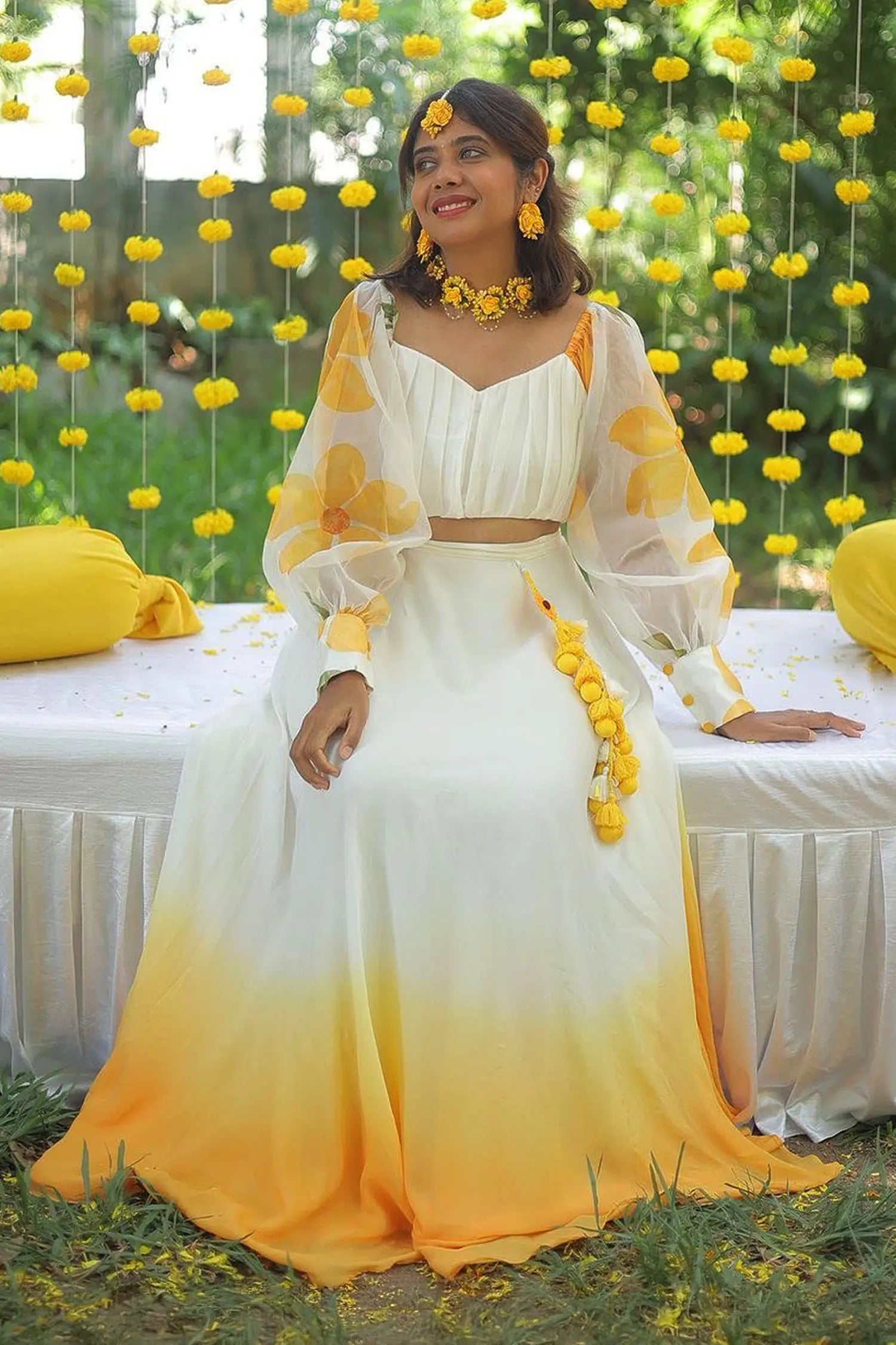 | Description | Balloon-sleeved pleated top paired with a flowing ombre skirt, creating a graceful and elegant silhouette perfect for festive occasions. |