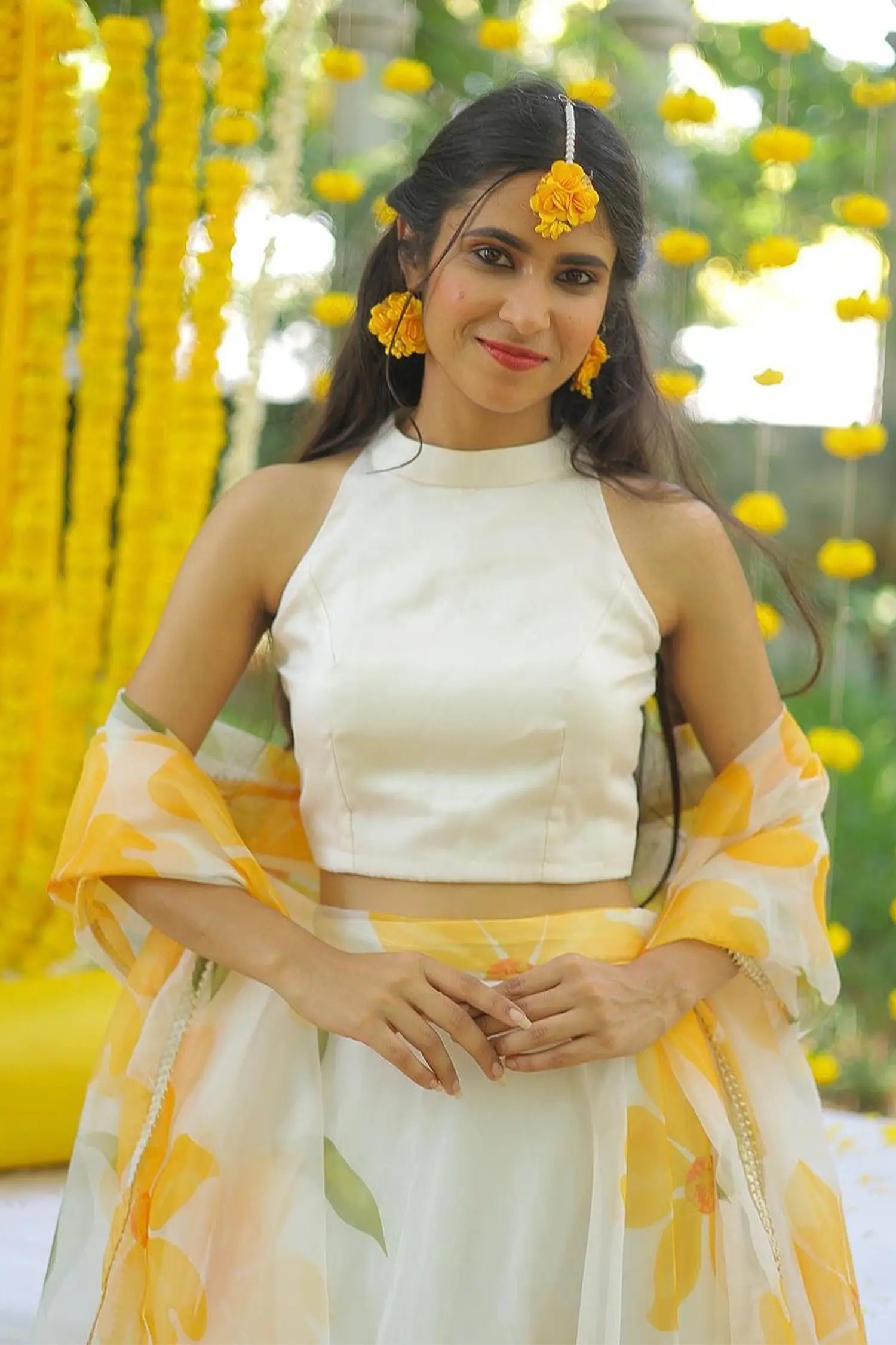 | Description | Ruffled top paired with a flared floral skirt, designed as a vibrant and festive Haldi set for pre-wedding celebrations. |