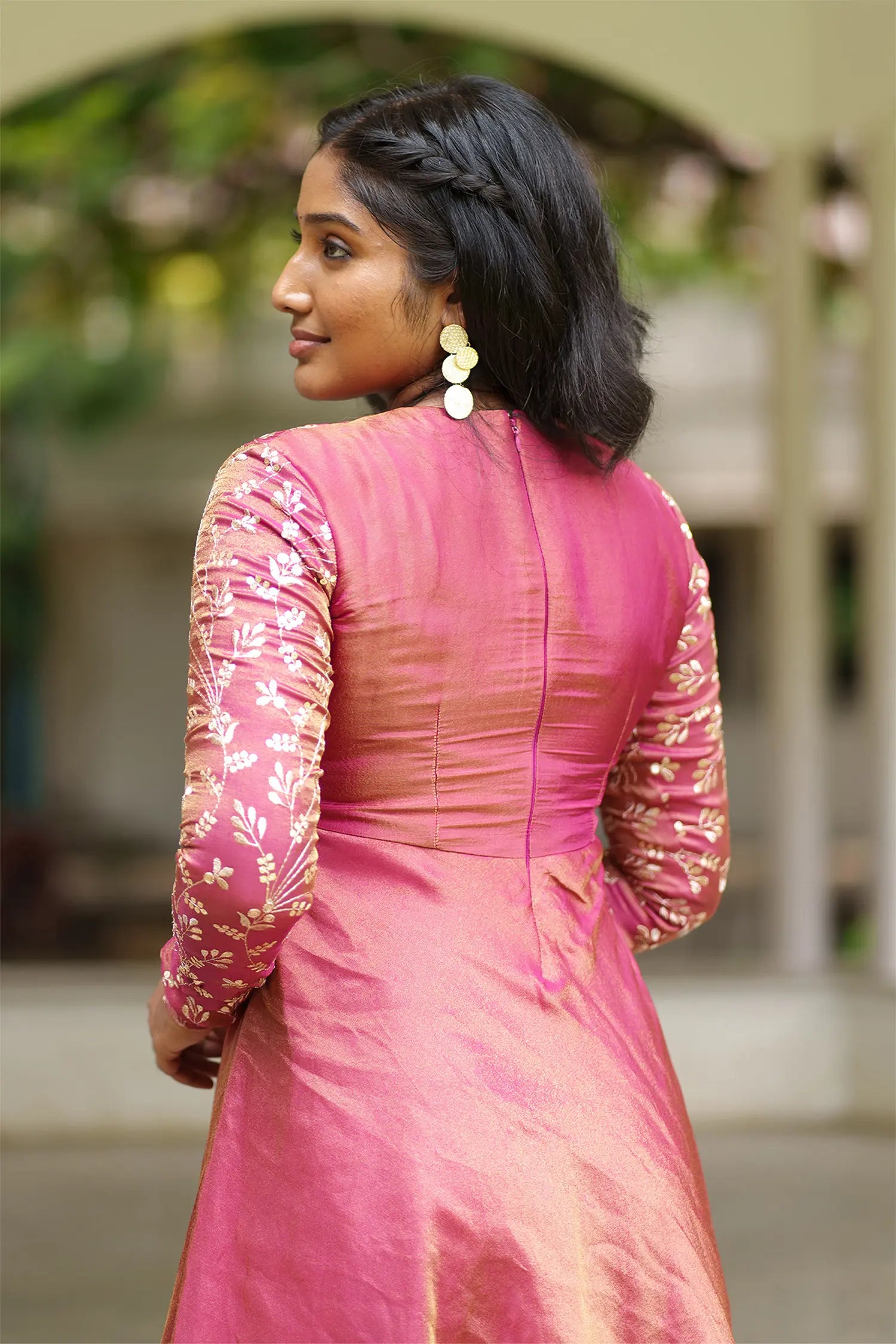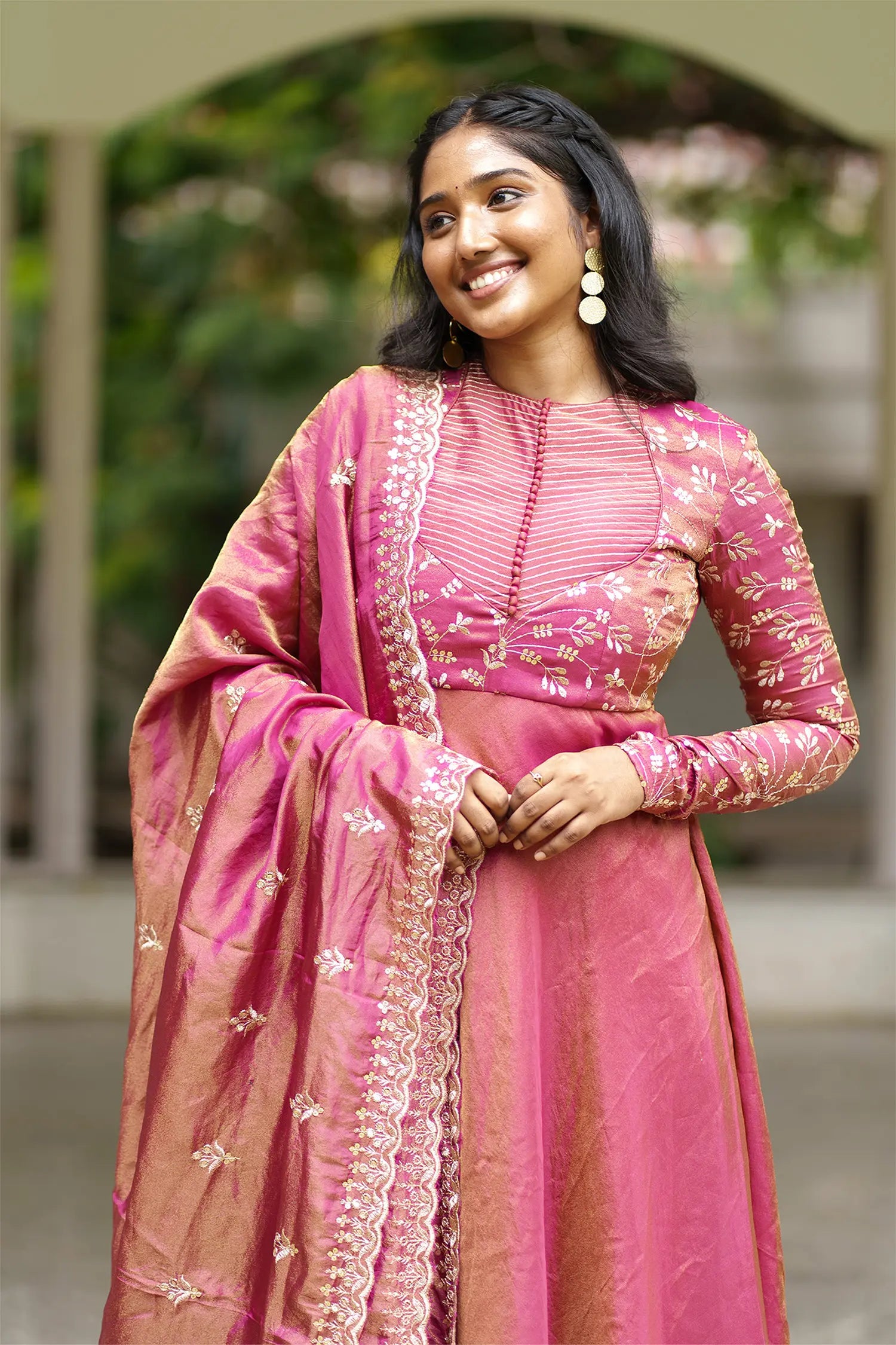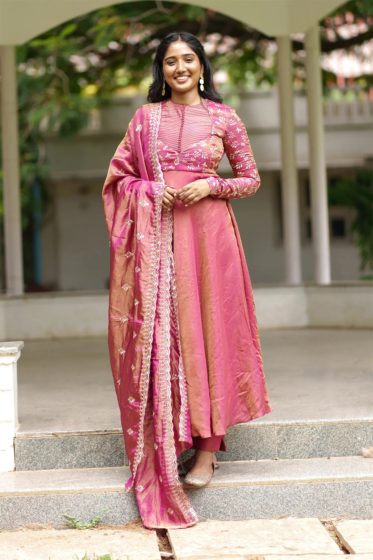 | Description | A traditional yet elegant Anarkali dress in magenta Cosmo silk featuring a machine-embroidered yoke. Paired with an embroidered dupatta and pants, this set blends classic charm with modern practicality — perfect for festive occasions or formal events. |