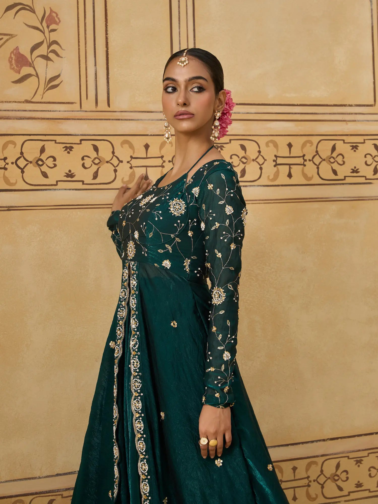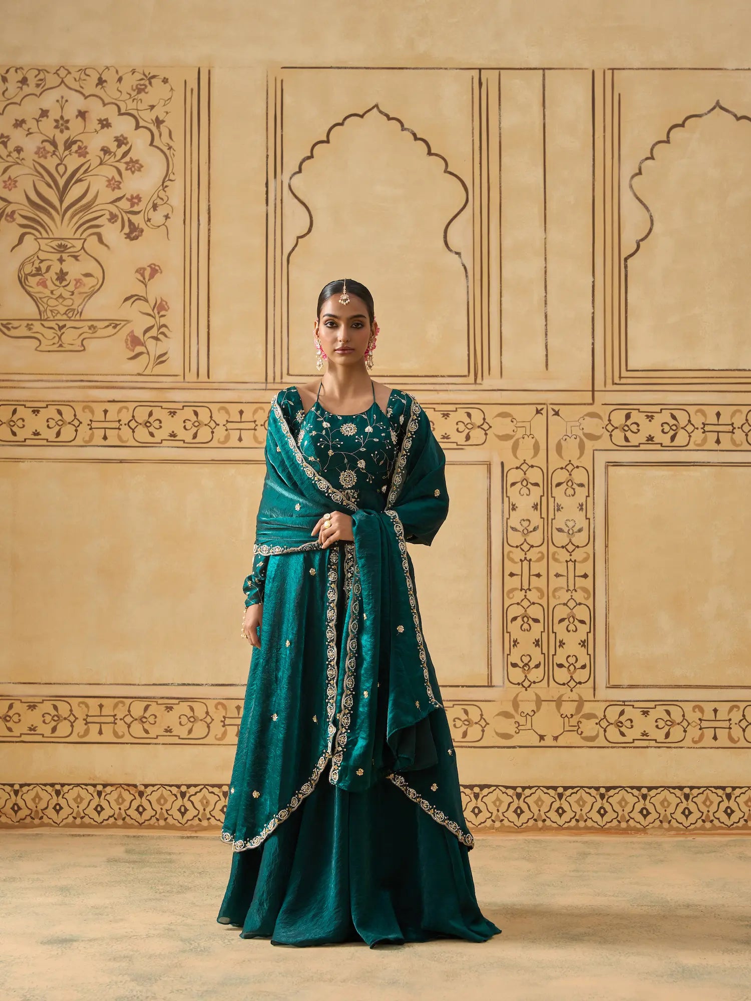 | Description | Striking and refined, this emerald green slit high-low Anarkali set is crafted in luxurious textured fabric, offering a rich drape with contemporary movement. Designed with a signature Masaba-inspired neckline, the bodice and sleeves feature delicate gold embroidery, while the high-slit front reveals a matching skirt that enhances the layered silhouette. Paired with a coordinating dupatta featuring embroidered borders, this ensemble fuses traditional elegance with modern structure — making it a standout choice for weddings, sangeets, or festive evenings. |