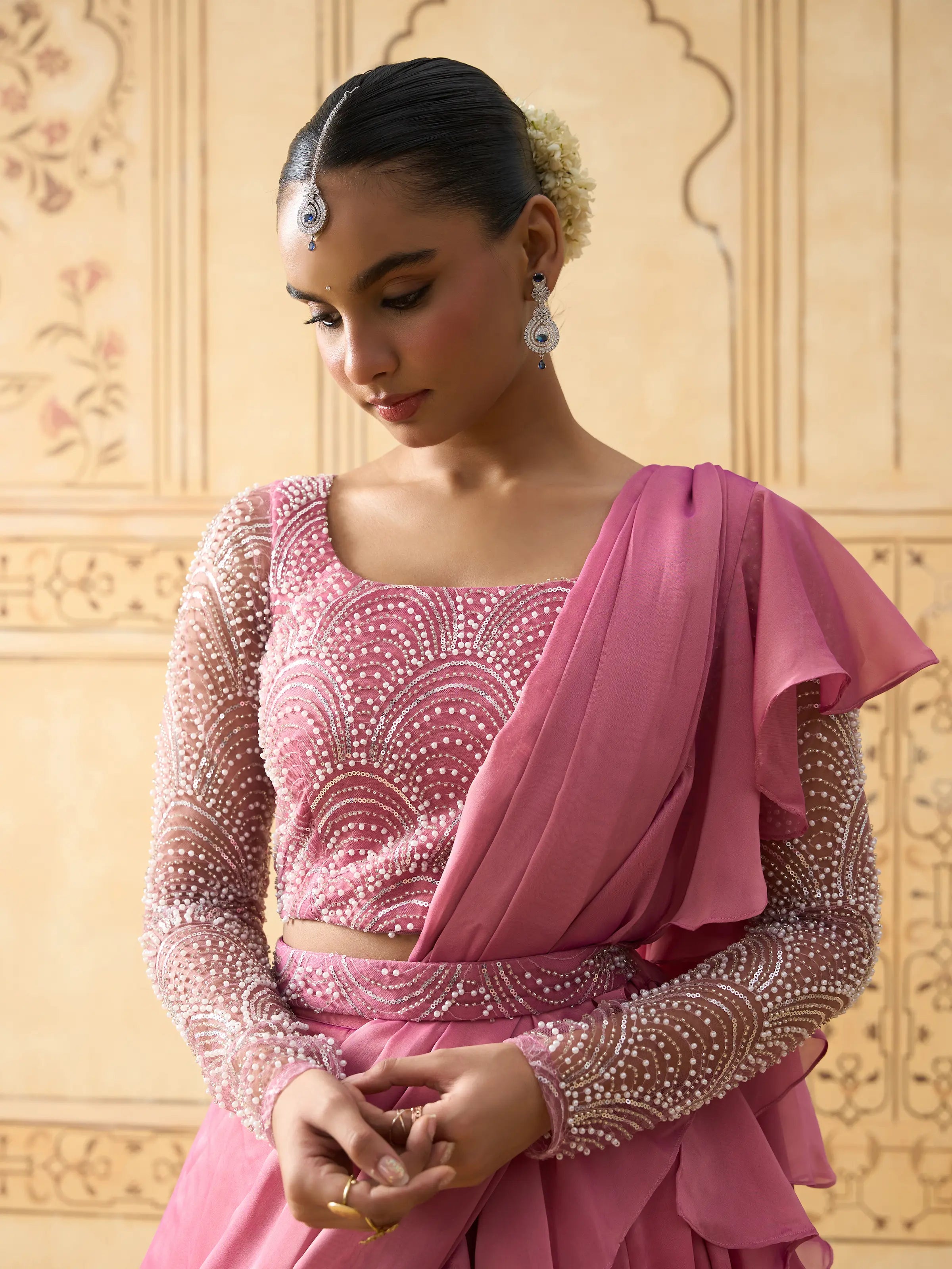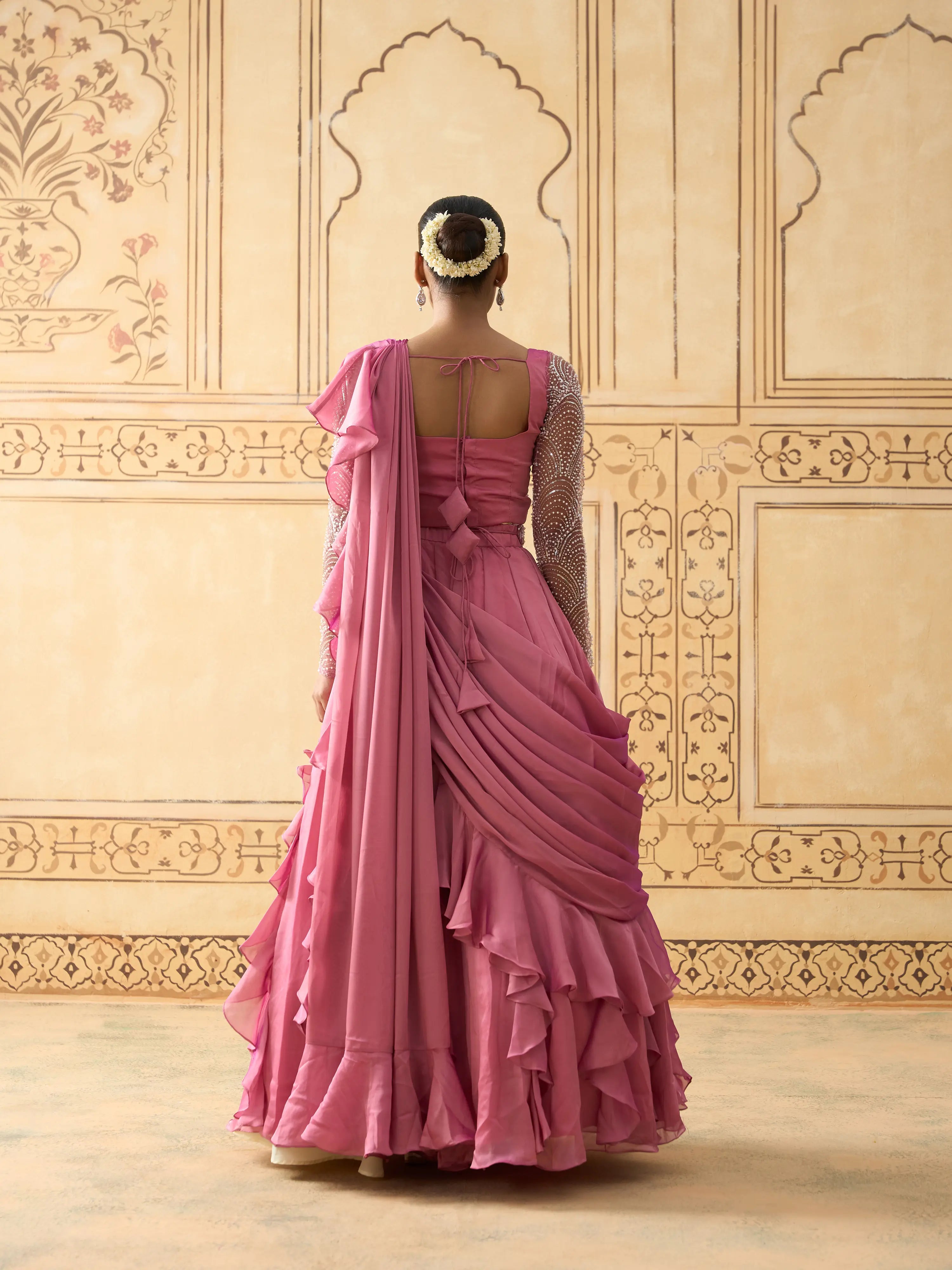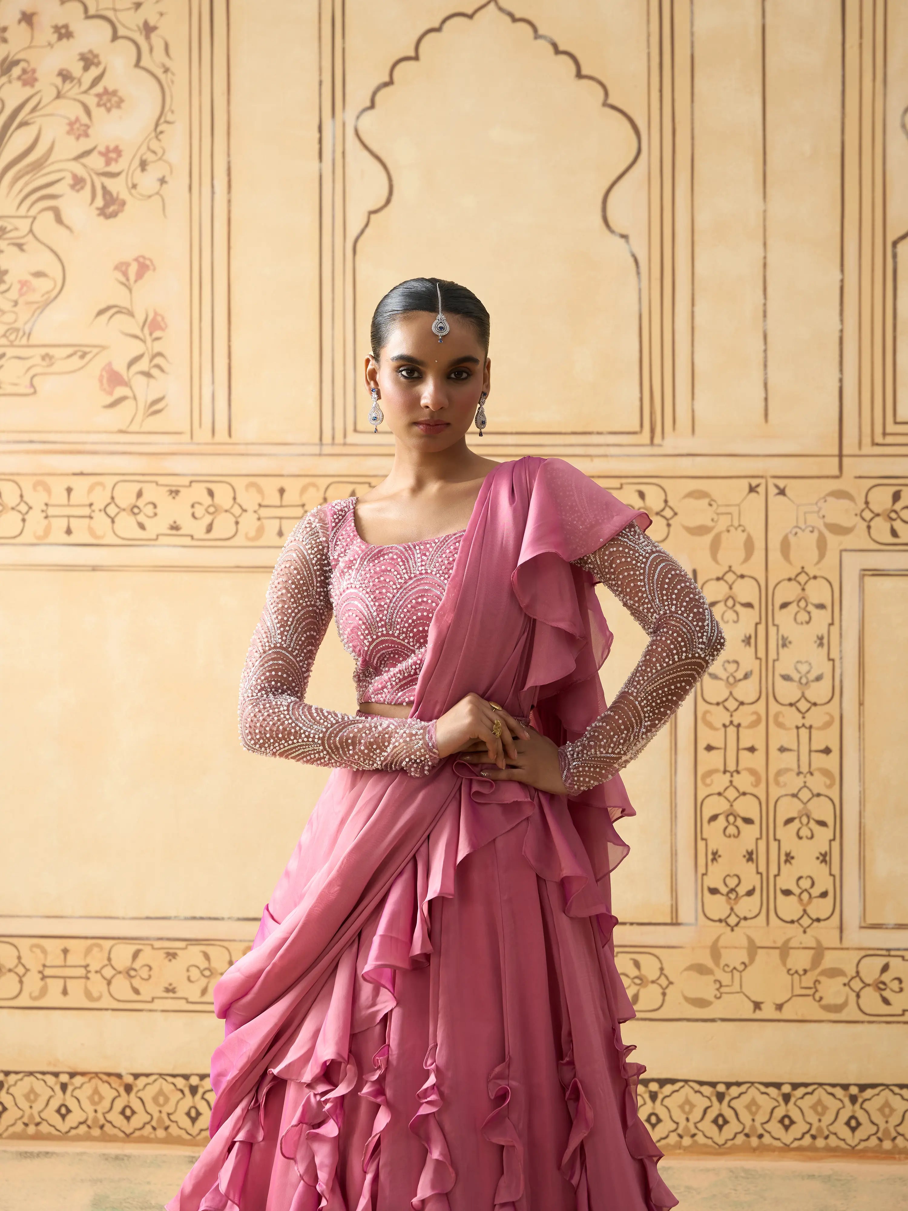 | Description | Exuding modern princess charm, this lehenga set features a pearl and bead embellished blouse with a sheer full-sleeve yoke for added sophistication. The lehenga showcases cascading 3D ruffles that bring movement and drama, paired with a coordinated drape dupatta. Back hook and zip closure. A perfect balance of grace and glamour, this ensemble is ideal for cocktail parties, sangeet nights, and destination weddings. Best styled with minimal diamond or pearl jewelry. |