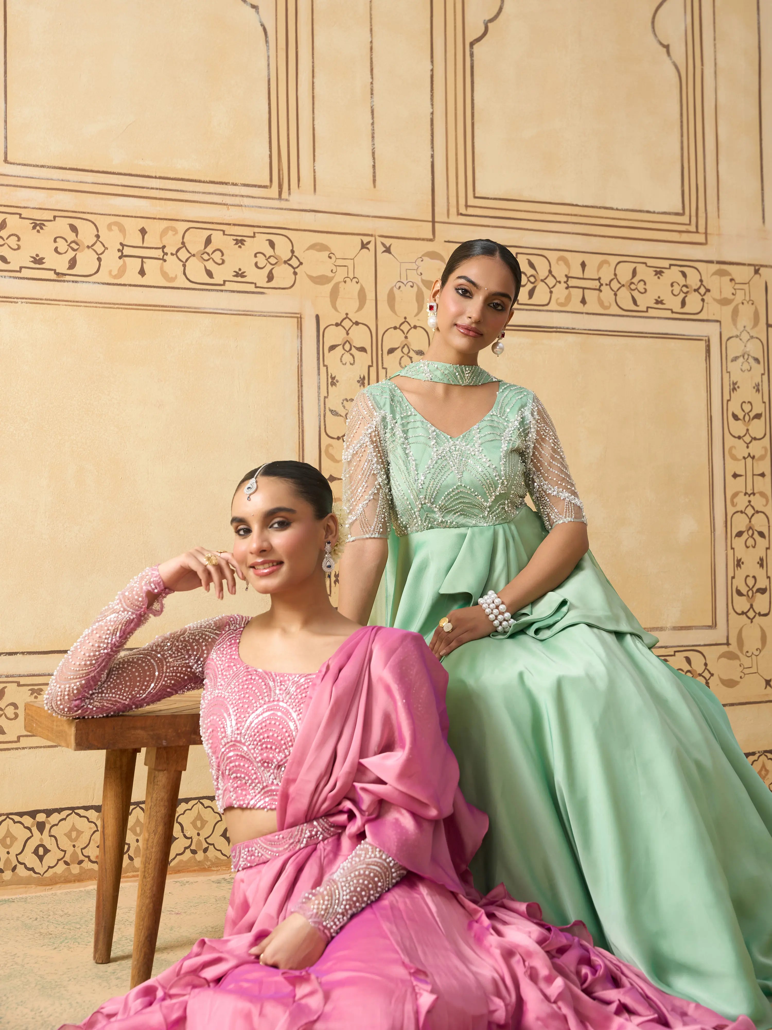 | Fabric | Blouse – Imported Pearl-Work Net Lehenga & Dupatta – Satin Georgette Lining – Soft Crepe |
