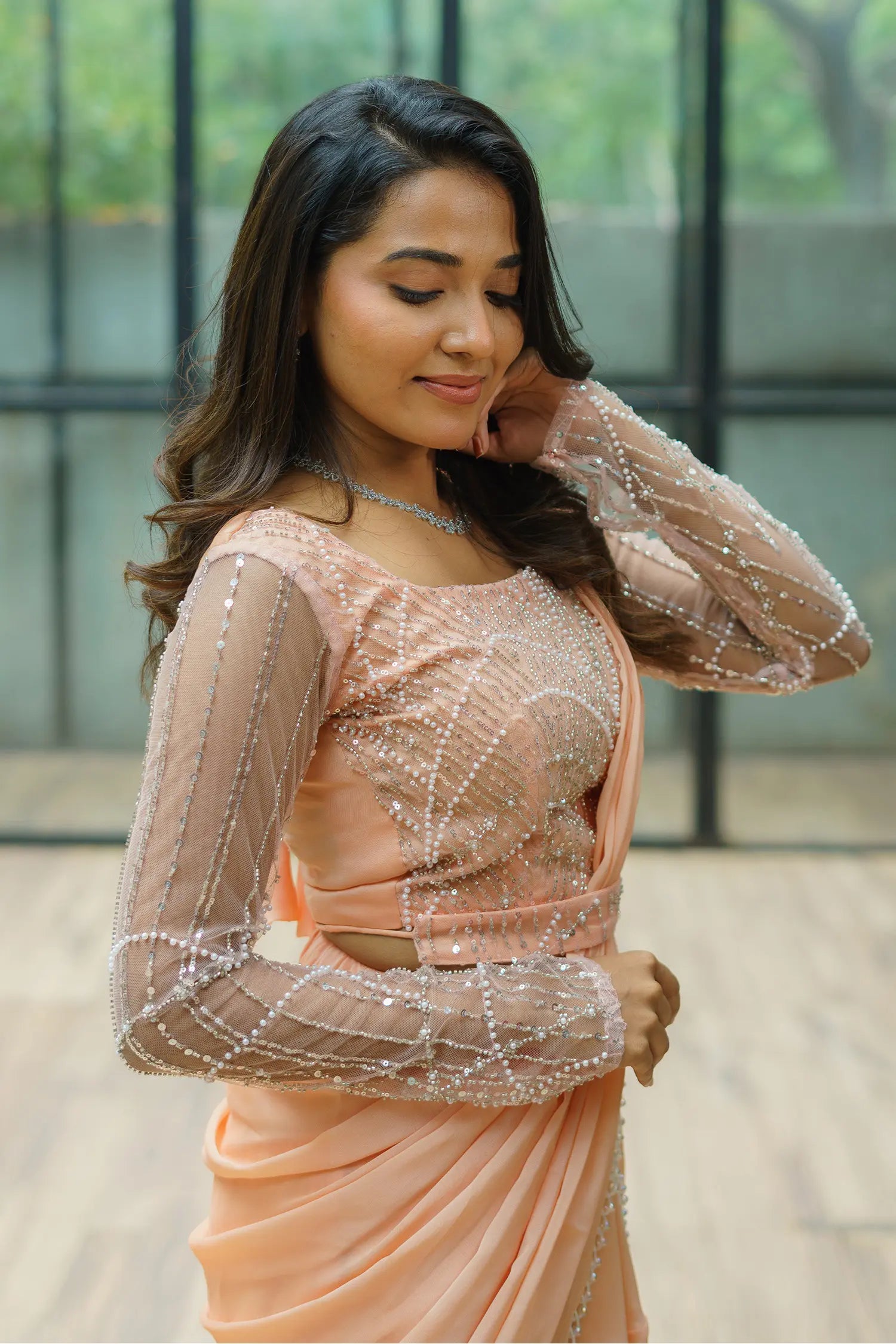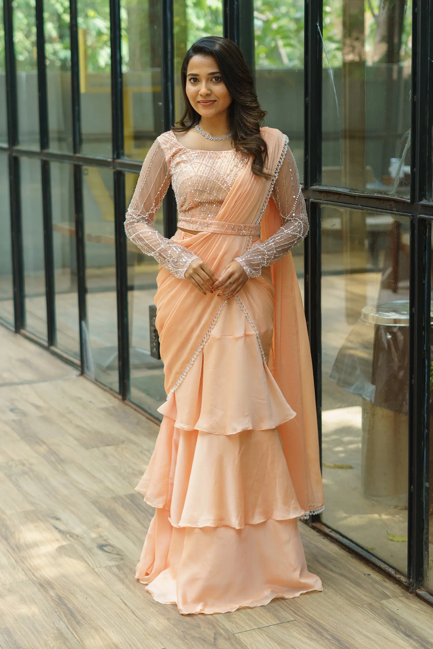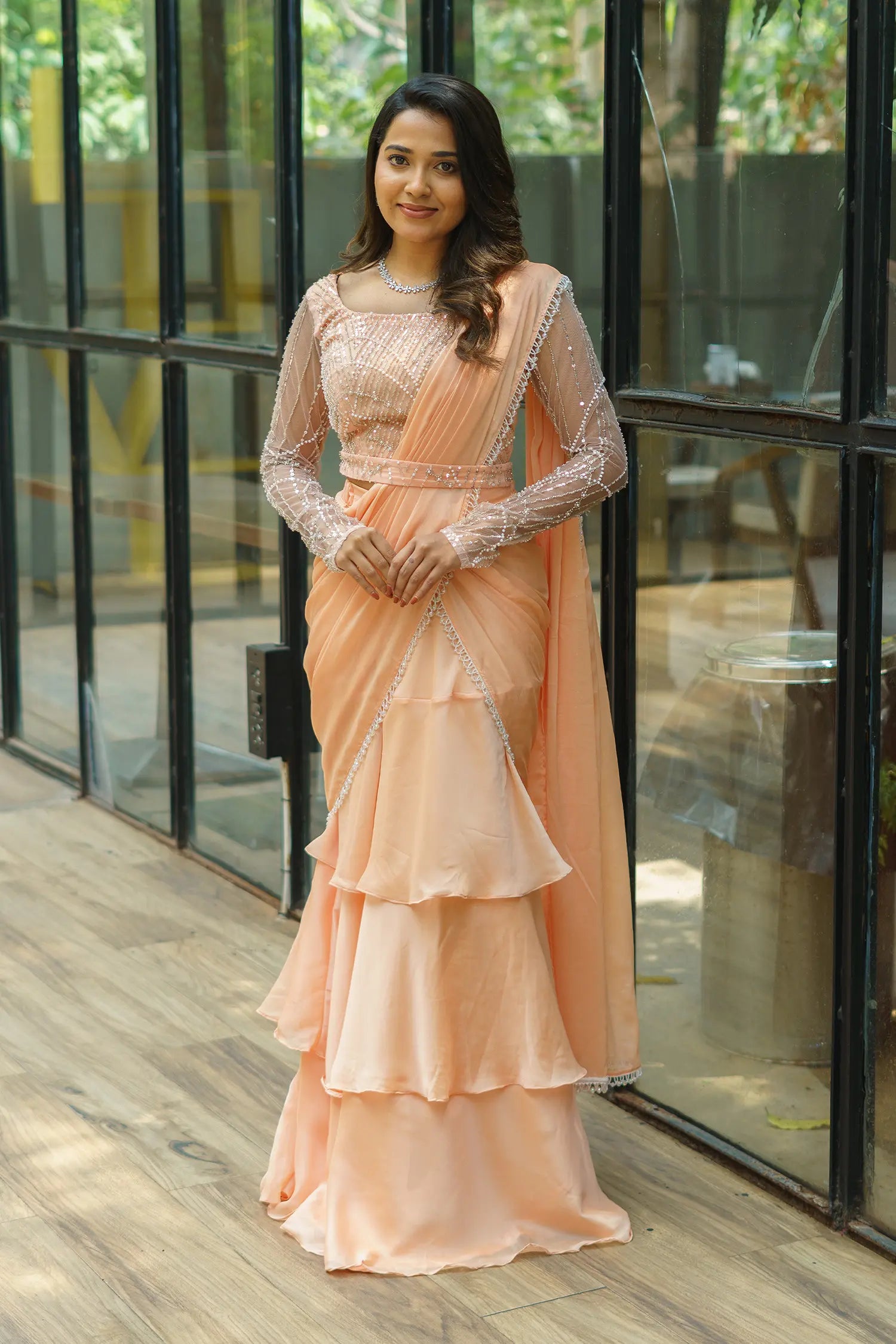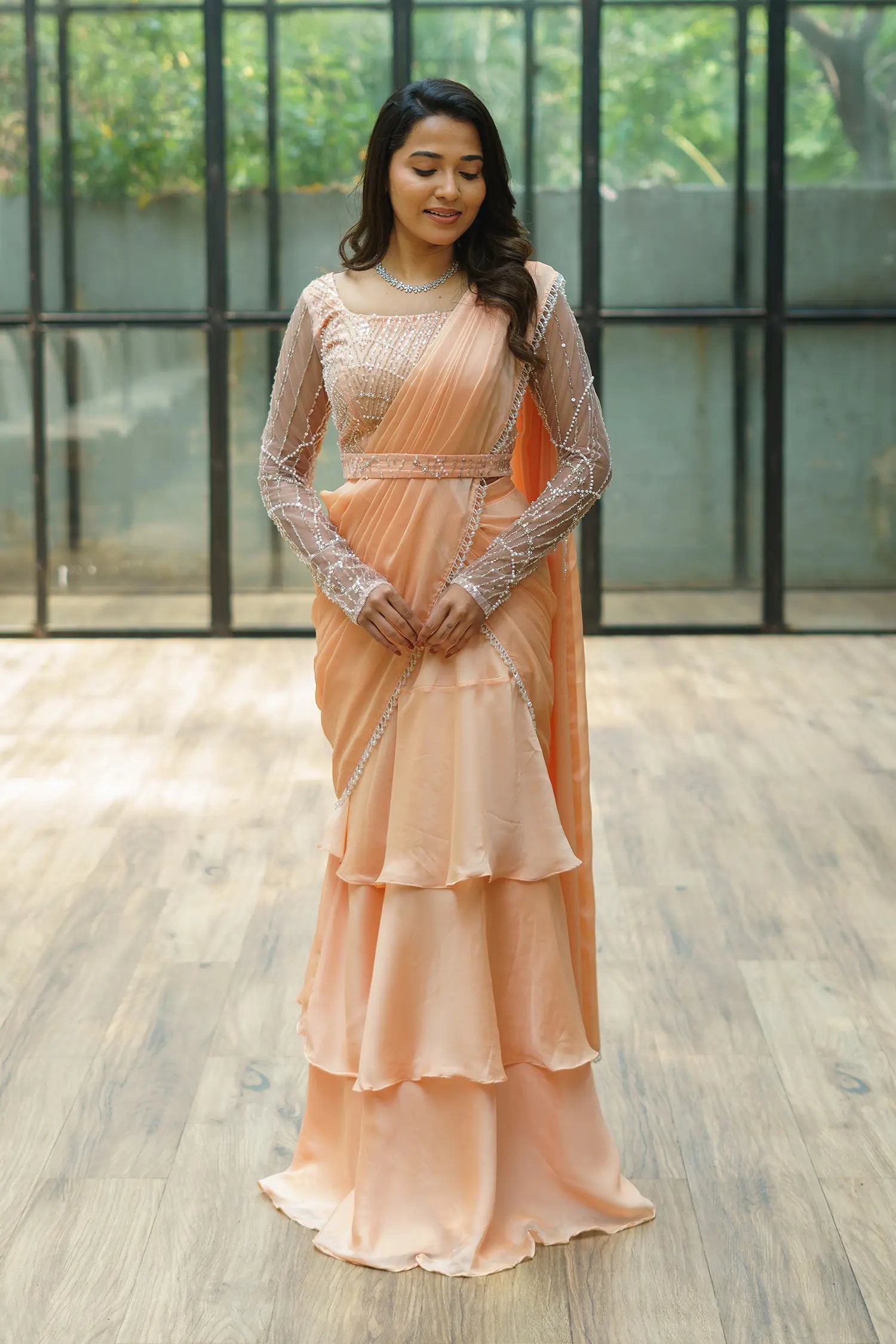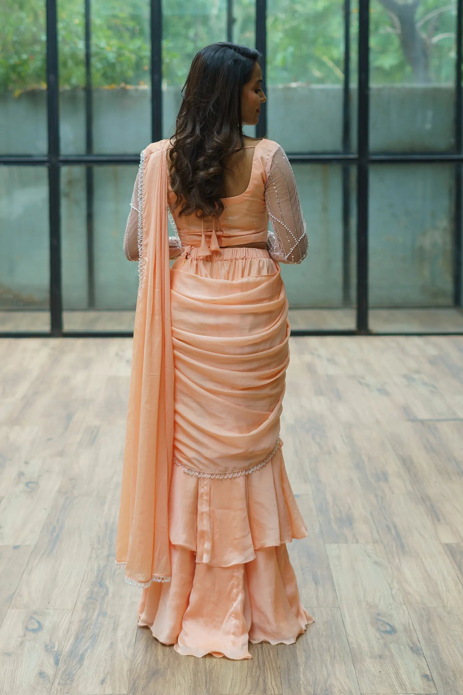 | Description | Top featuring full pearl work paired with a three-layered skirt and draped hanging dupatta. This set combines intricate embellishments with a flowing, elegant silhouette. |