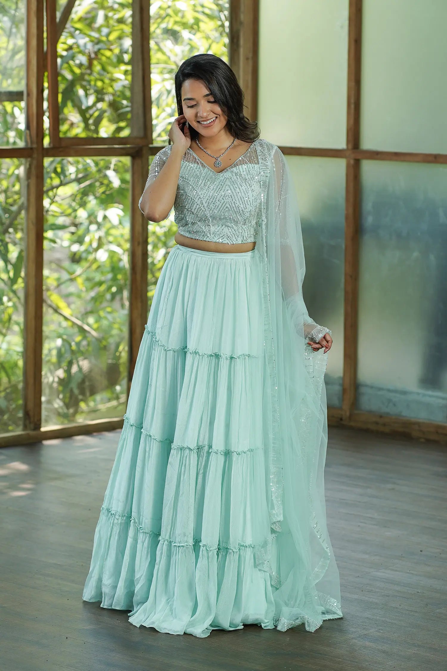 | Includes | 1 Top, 1 Panel Ruffle Skirt, 1 Draped Frill Dupatta |