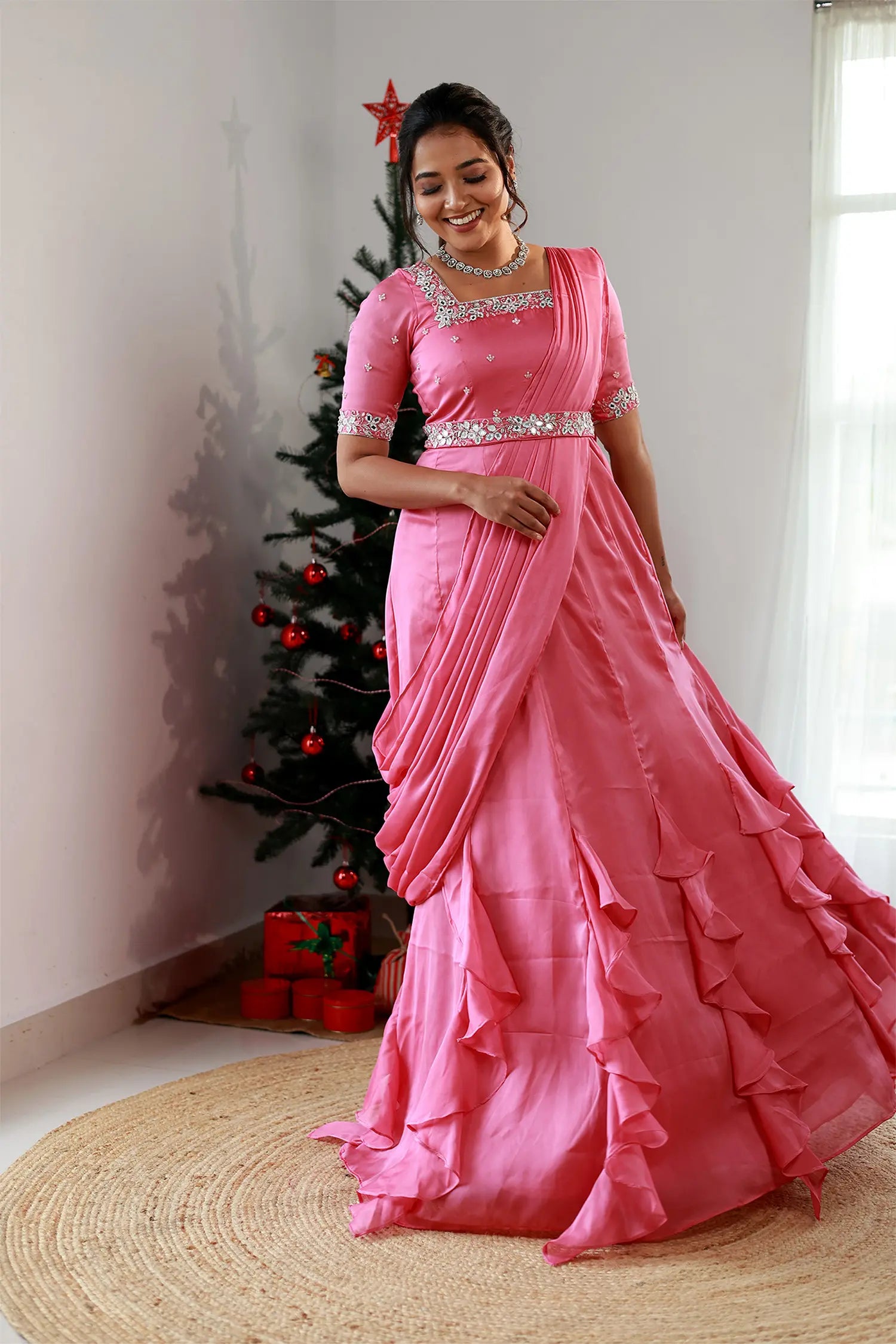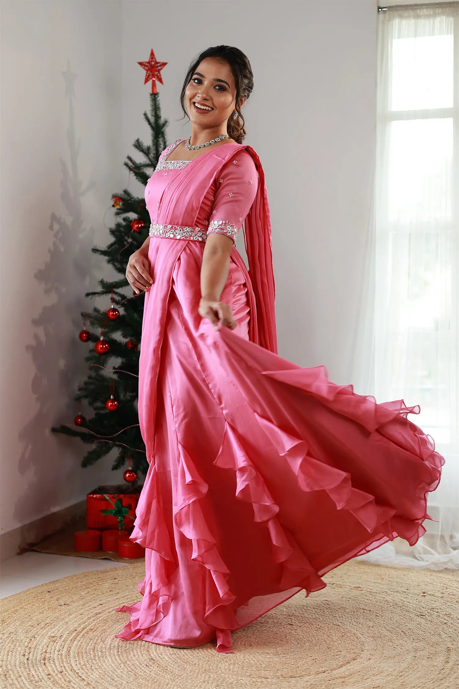 | Style | Top and belt with mirror work, panel ruffle skirt, drape dupatta |