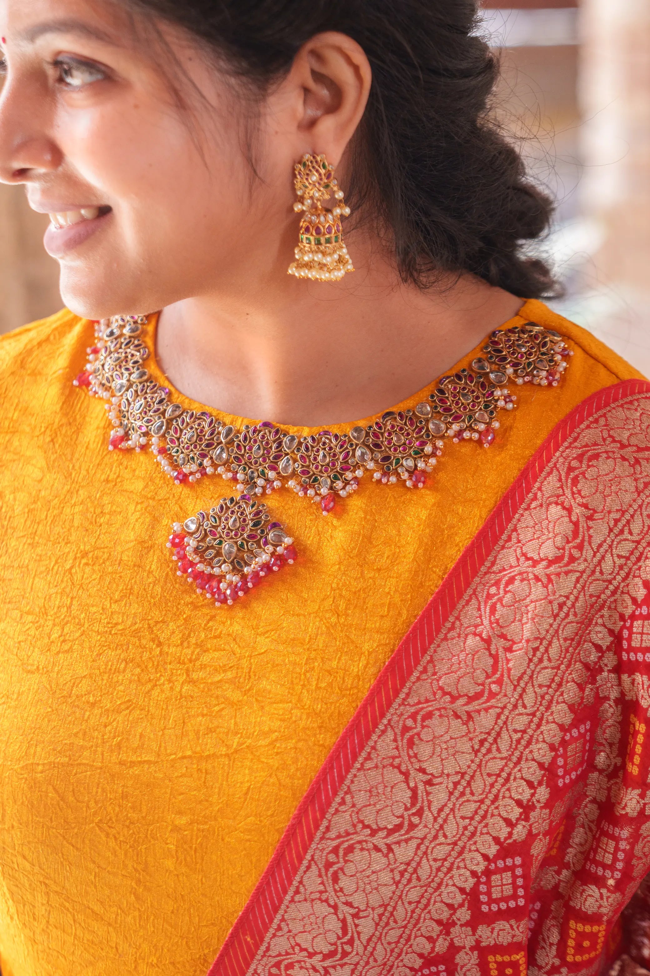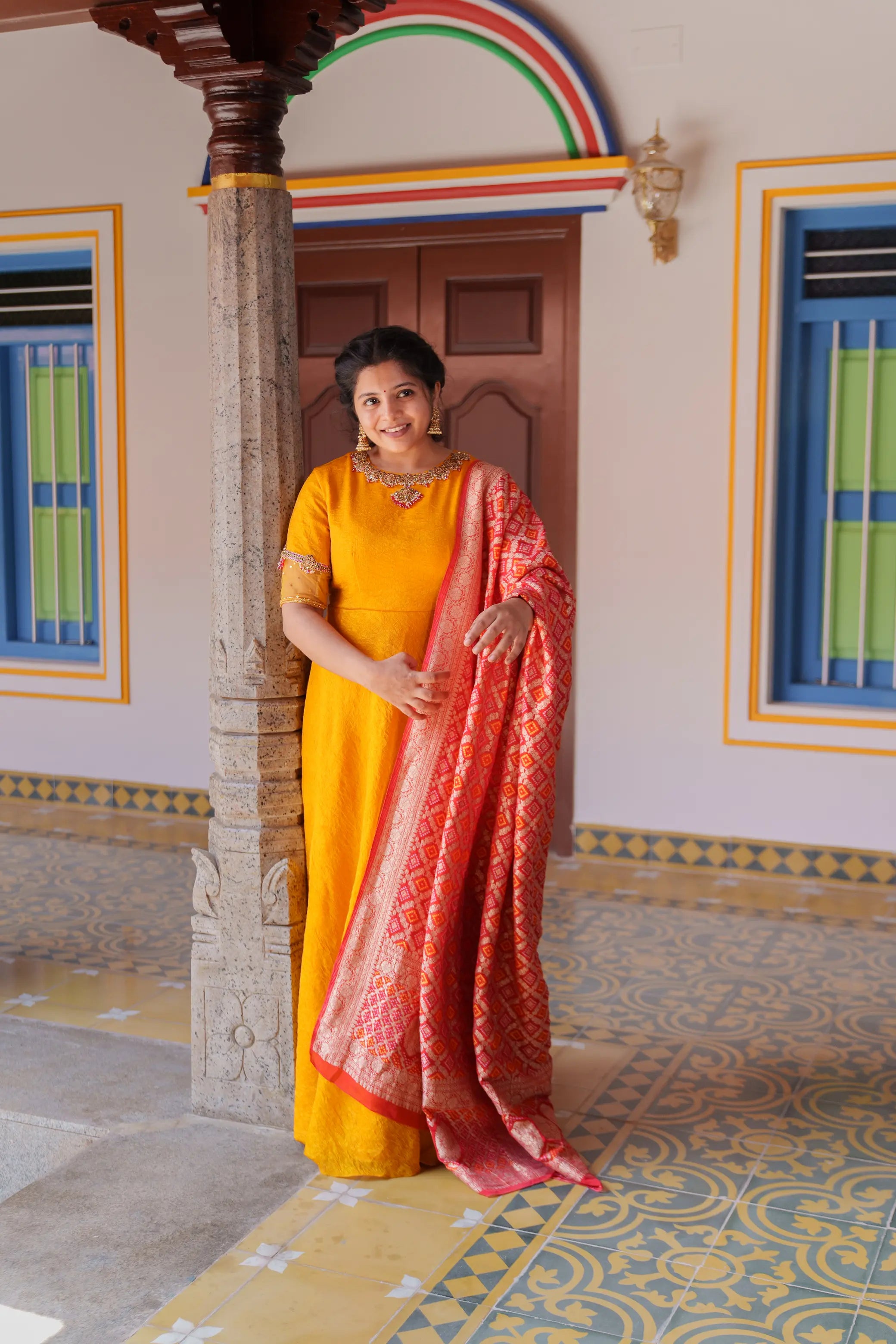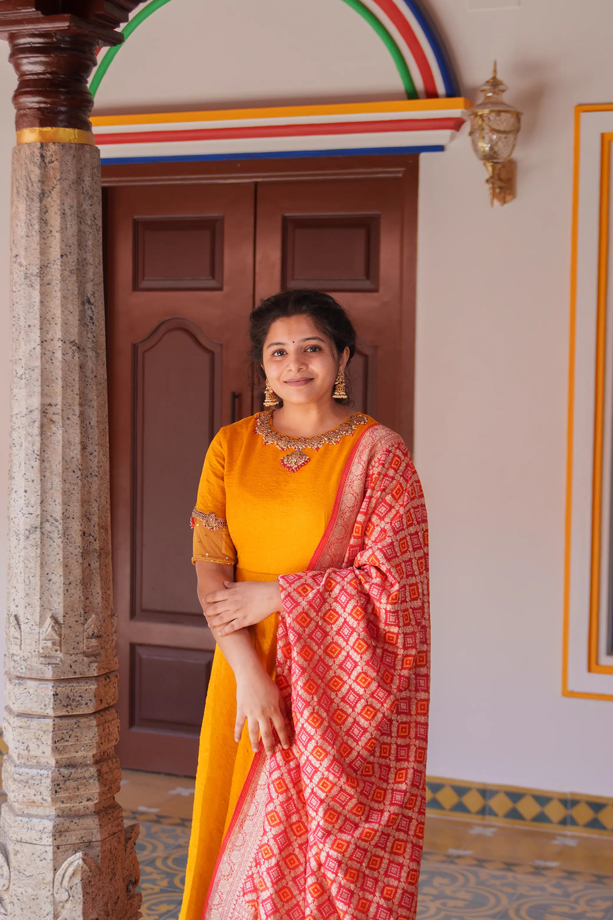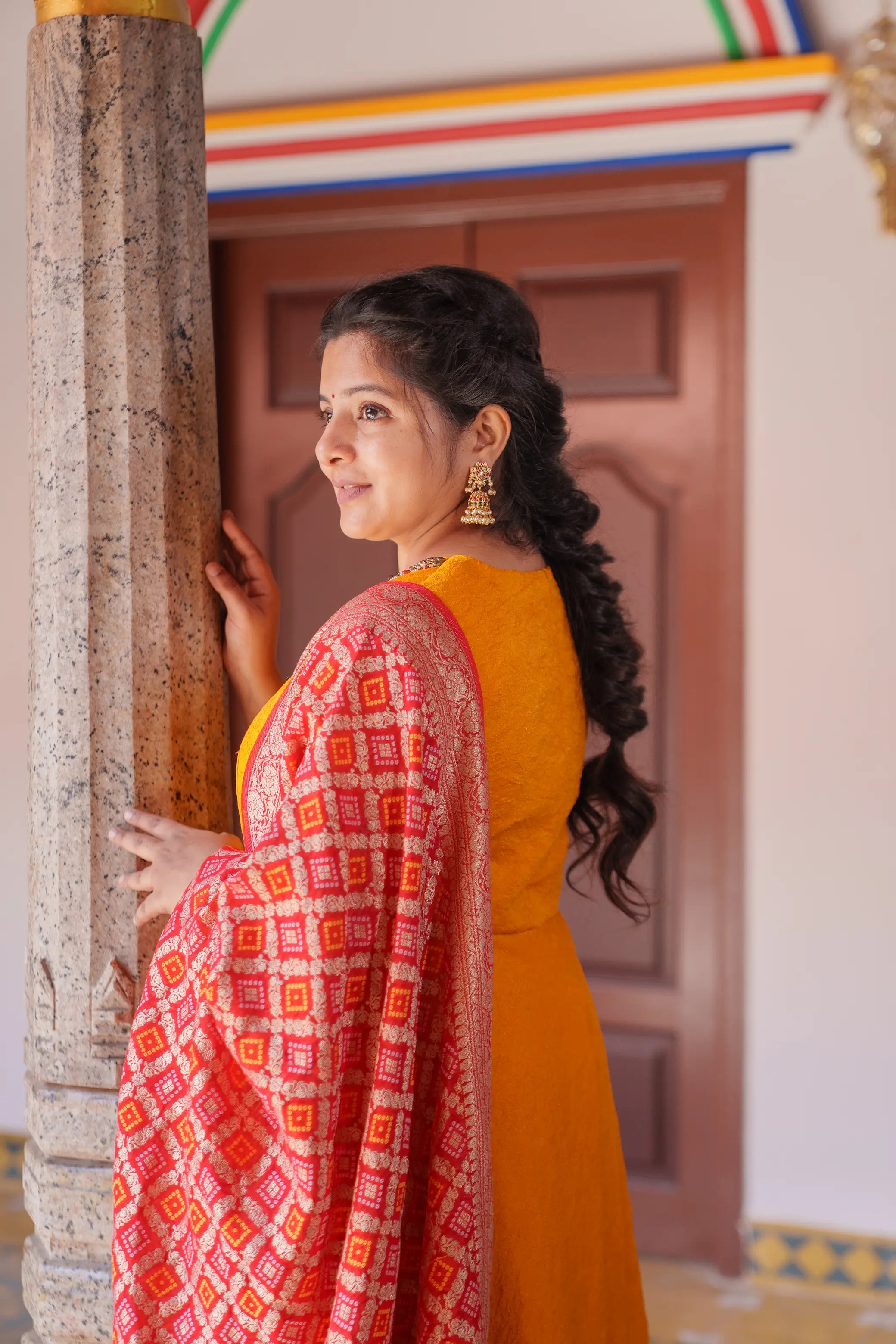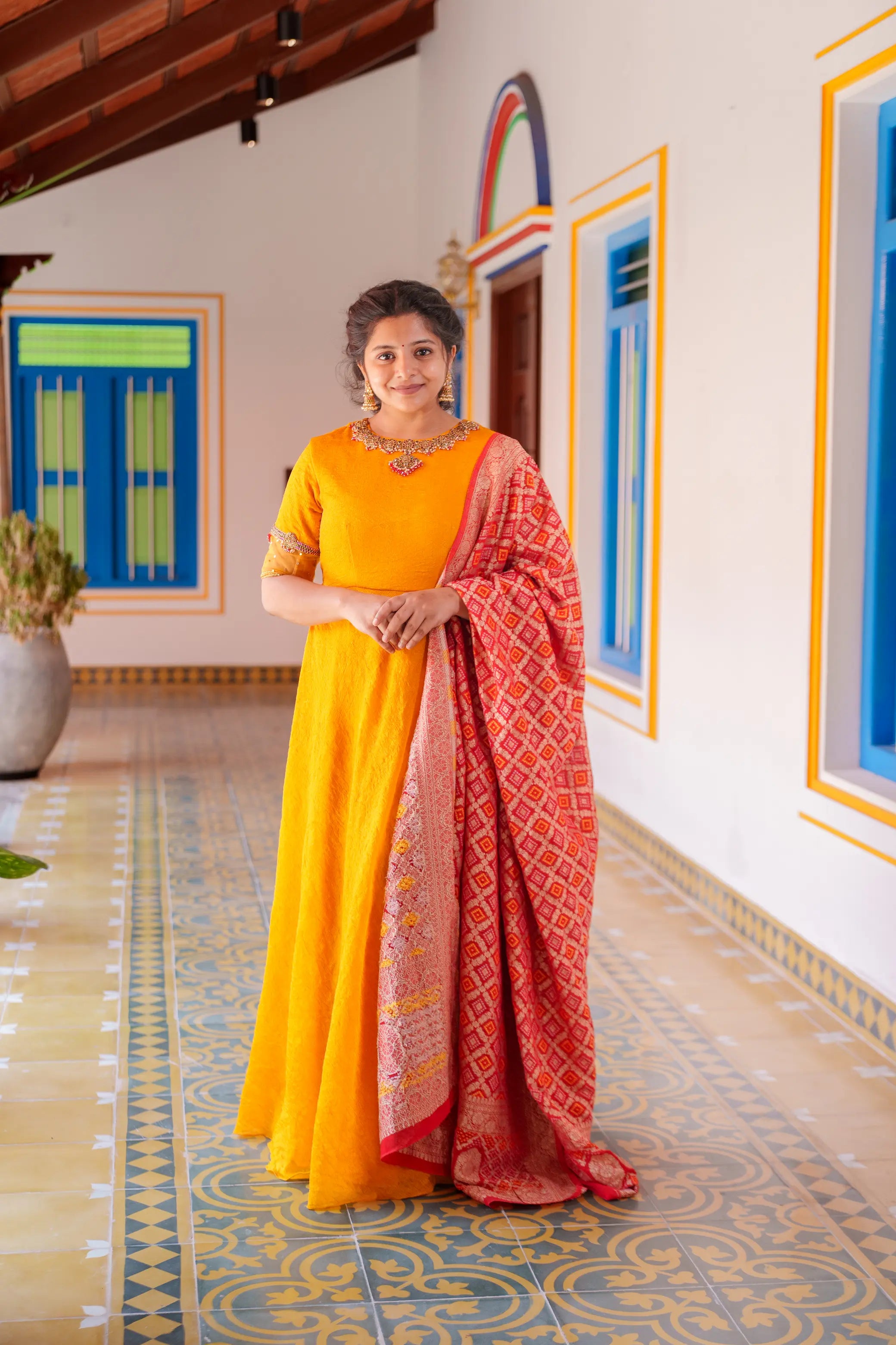 | Design | Anarkali with exquisite jewellery detailing on neckline and sleeves; paired with Bandhini dupatta |