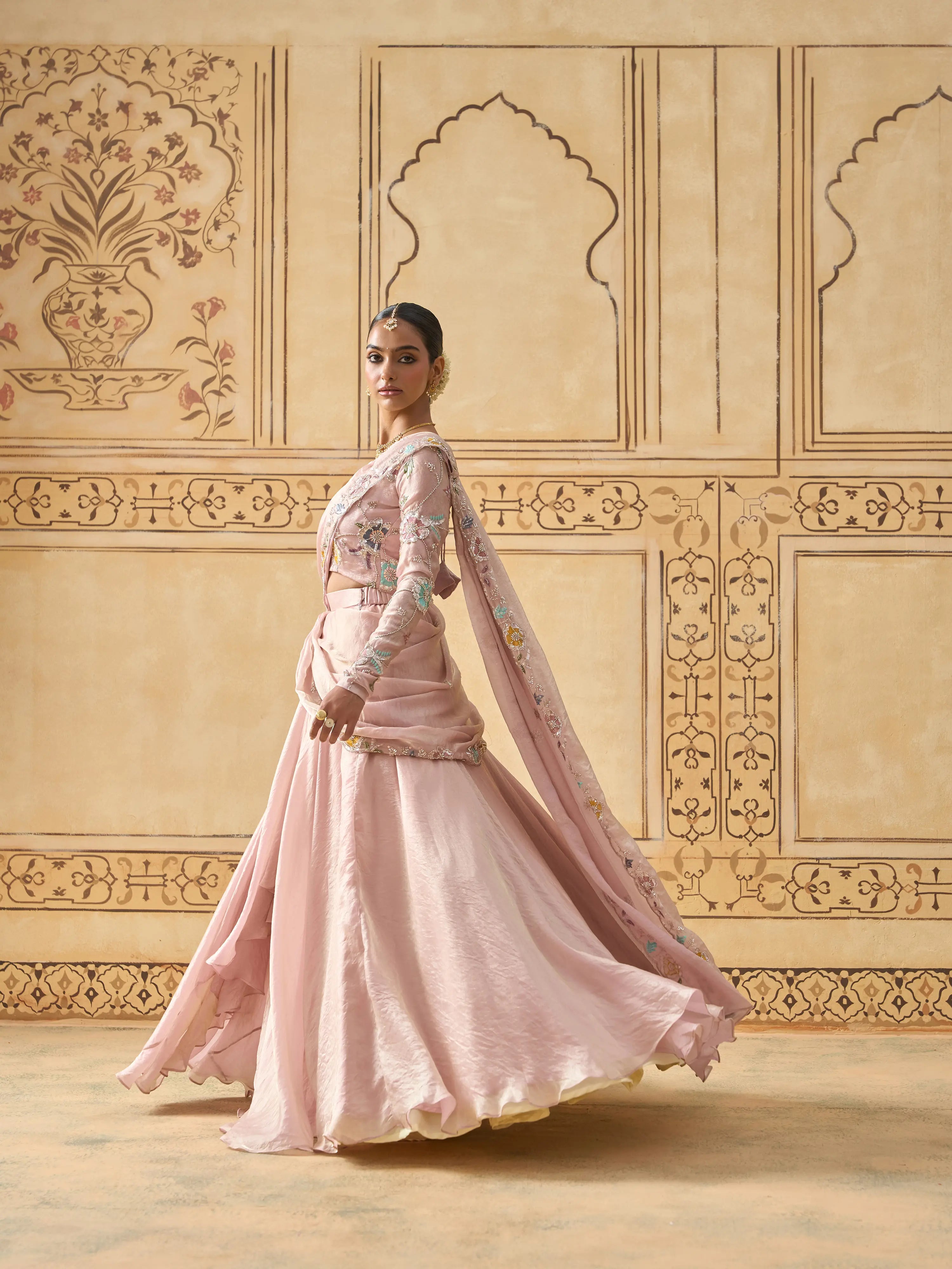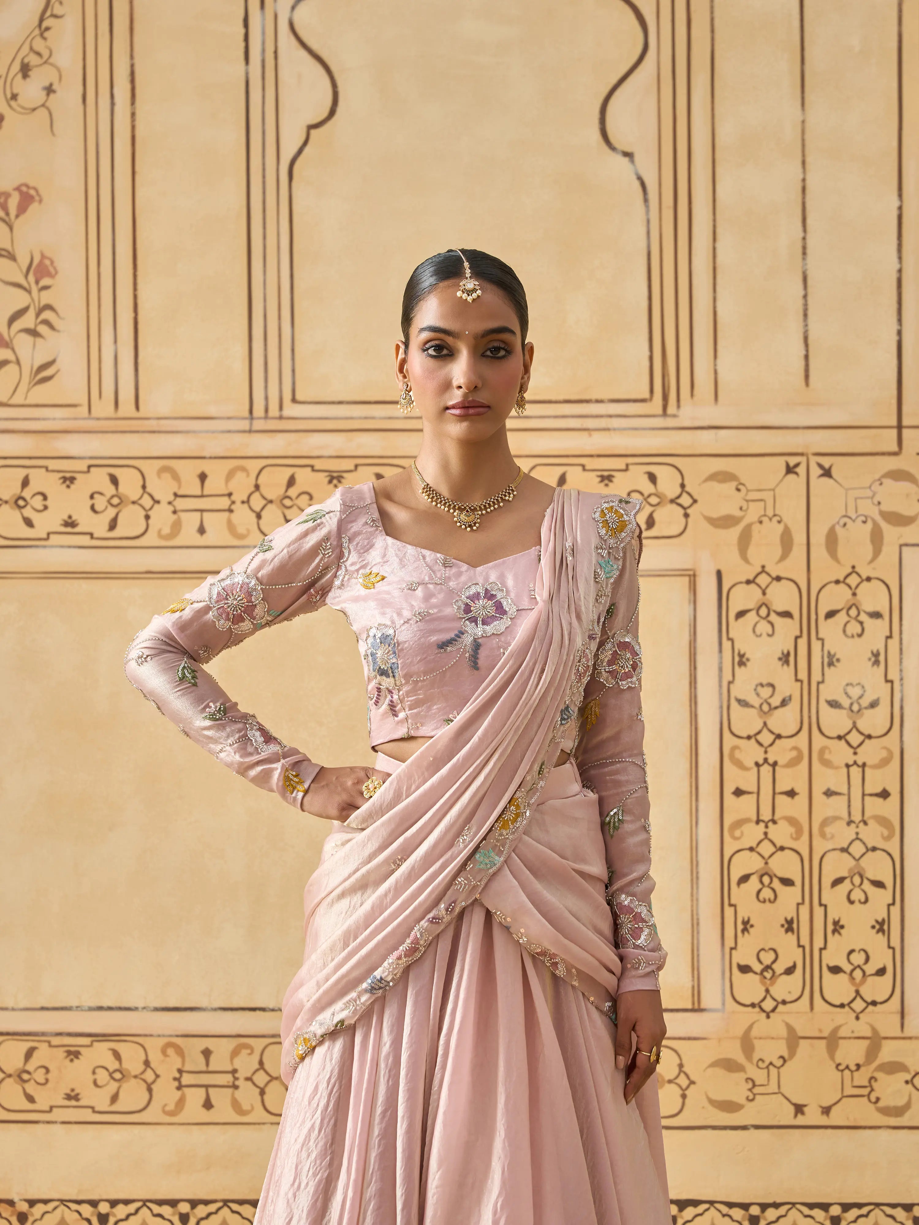 | Description | Ethereal and graceful, this half saree set is crafted from luxurious space silk, prized for its subtle sheen and fluid drape. The blouse and drape are embellished with delicate floral motifs in thread embroidery and cutdana work, paired with a flared skirt that enhances movement. Concealed zip closure. A refined choice for weddings, festive gatherings, or evening celebrations. |