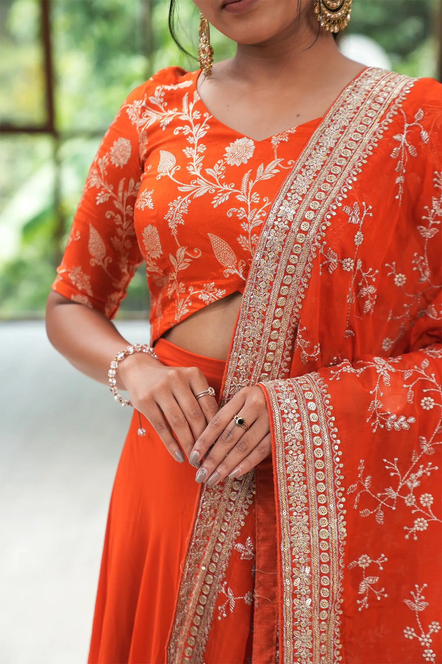| Fabric | Top: Orange brocade (Carnation Bloom Behnaaz), Skirt: Georgette |