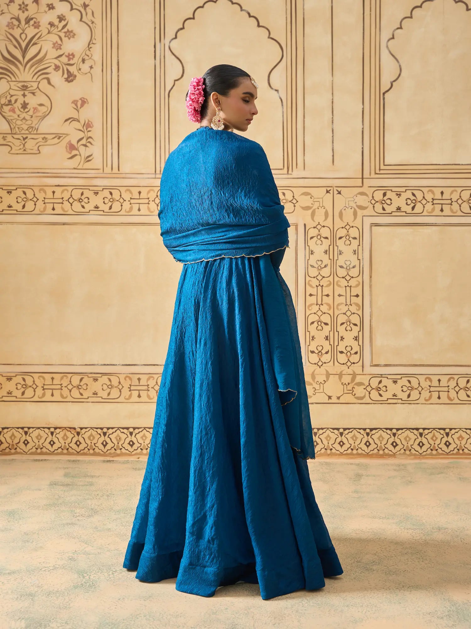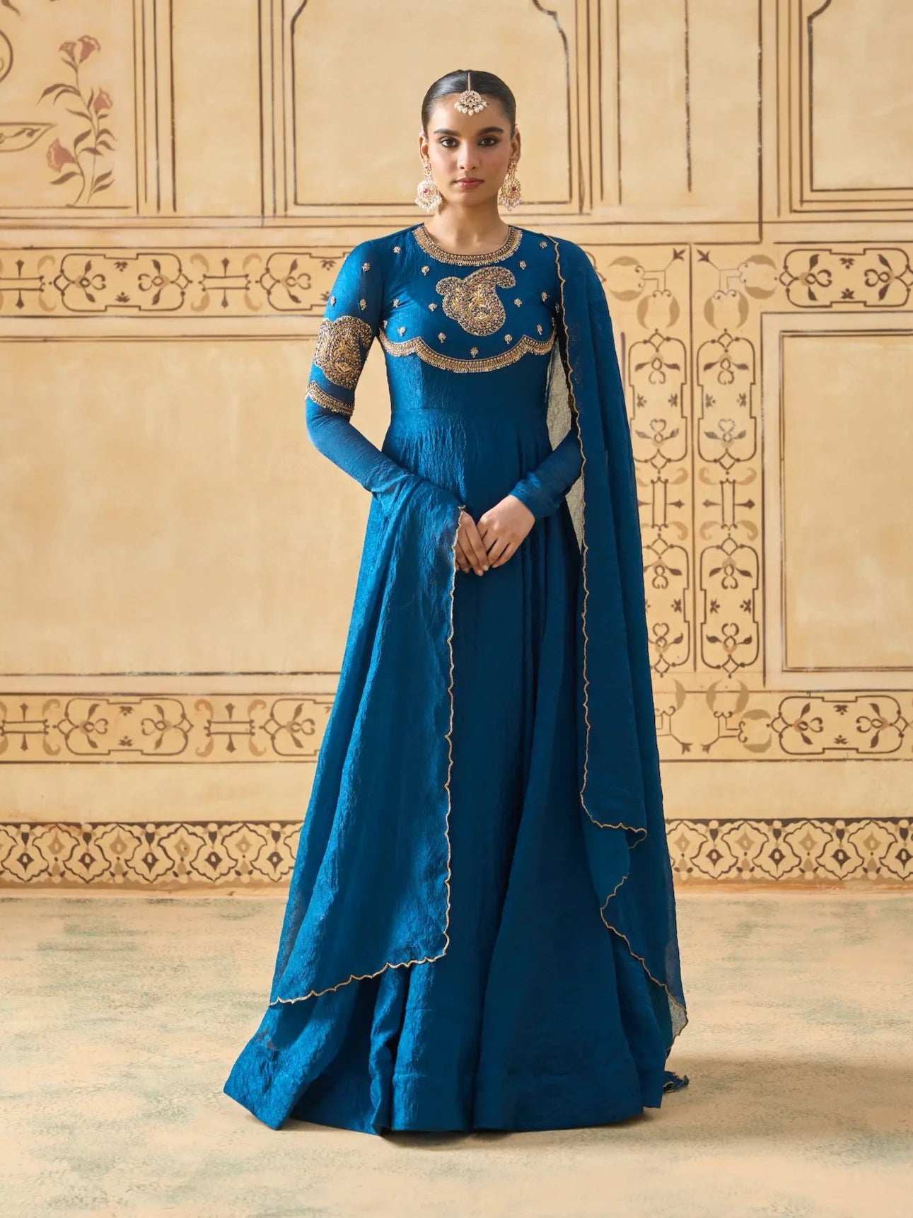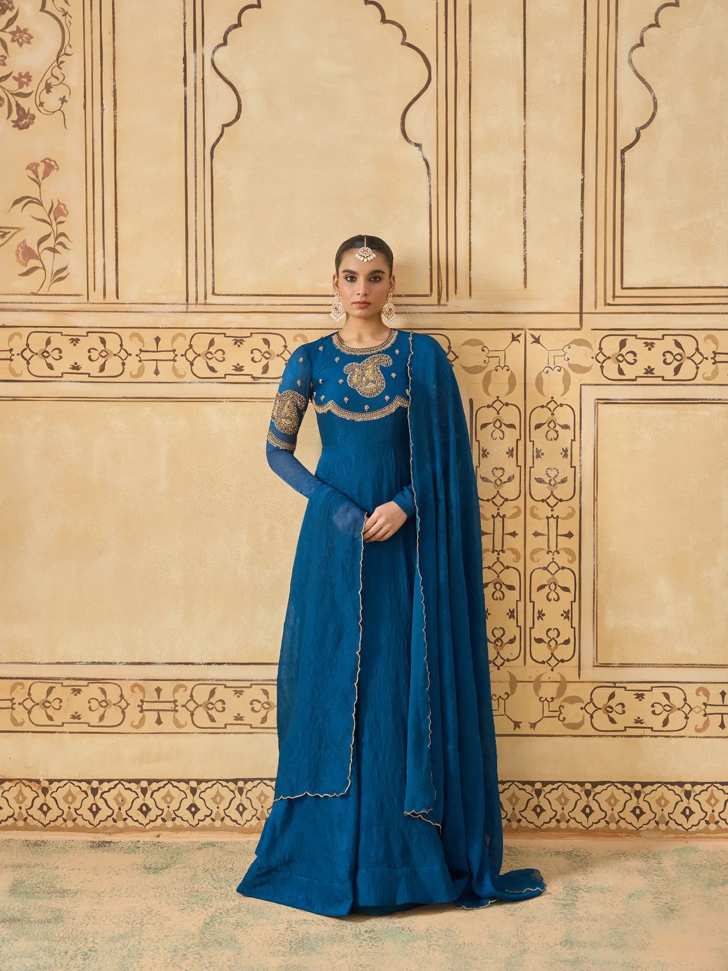 | Description | Regal and timeless, this teal blue Anarkali set is crafted from rich space silk fabric, known for its elegant drape and textured finish. The bodice and sleeves are adorned with intricate golden thread and cutdana embroidery, highlighted by traditional paisley motifs that lend a heritage-inspired charm. The flowing silhouette pairs effortlessly with a matching dupatta, finished with scalloped edging for subtle refinement. This ensemble captures the essence of classic grandeur, perfect for weddings, receptions, and festive soirées. |