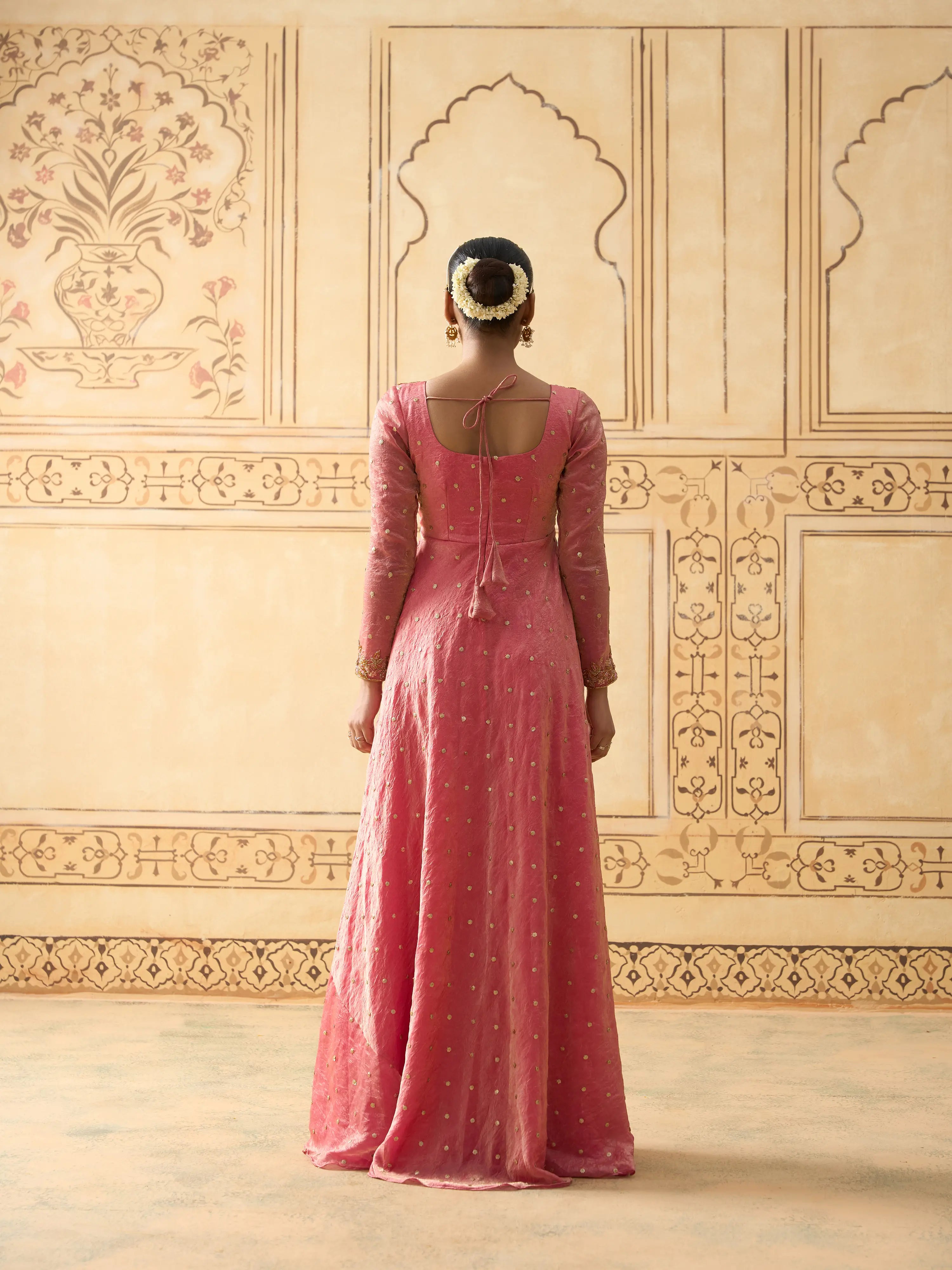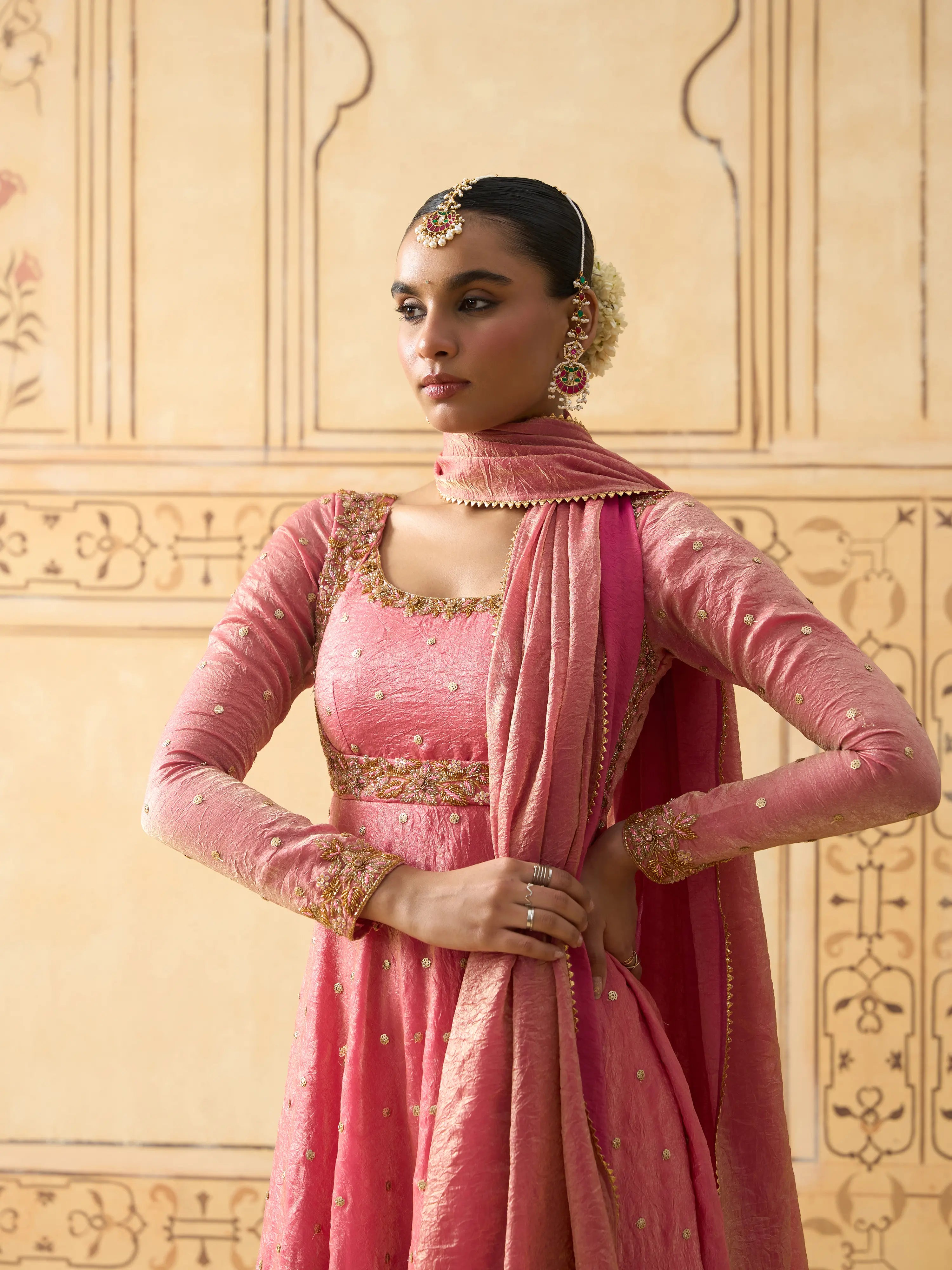 | Description | Drenched in the timeless charm of rose crush silk, this Anarkali features a delicately embroidered waistband that enhances the silhouette, with subtle sequin, zari, and resham embroidery across the bodice and sleeves. The flowy panels add graceful volume, paired with a coordinated dupatta finished with dainty edging. Back zipper with tie-up tassels completes the look. Perfect for festive occasions or weddings. Best styled with chandbalis and a maangtika. |