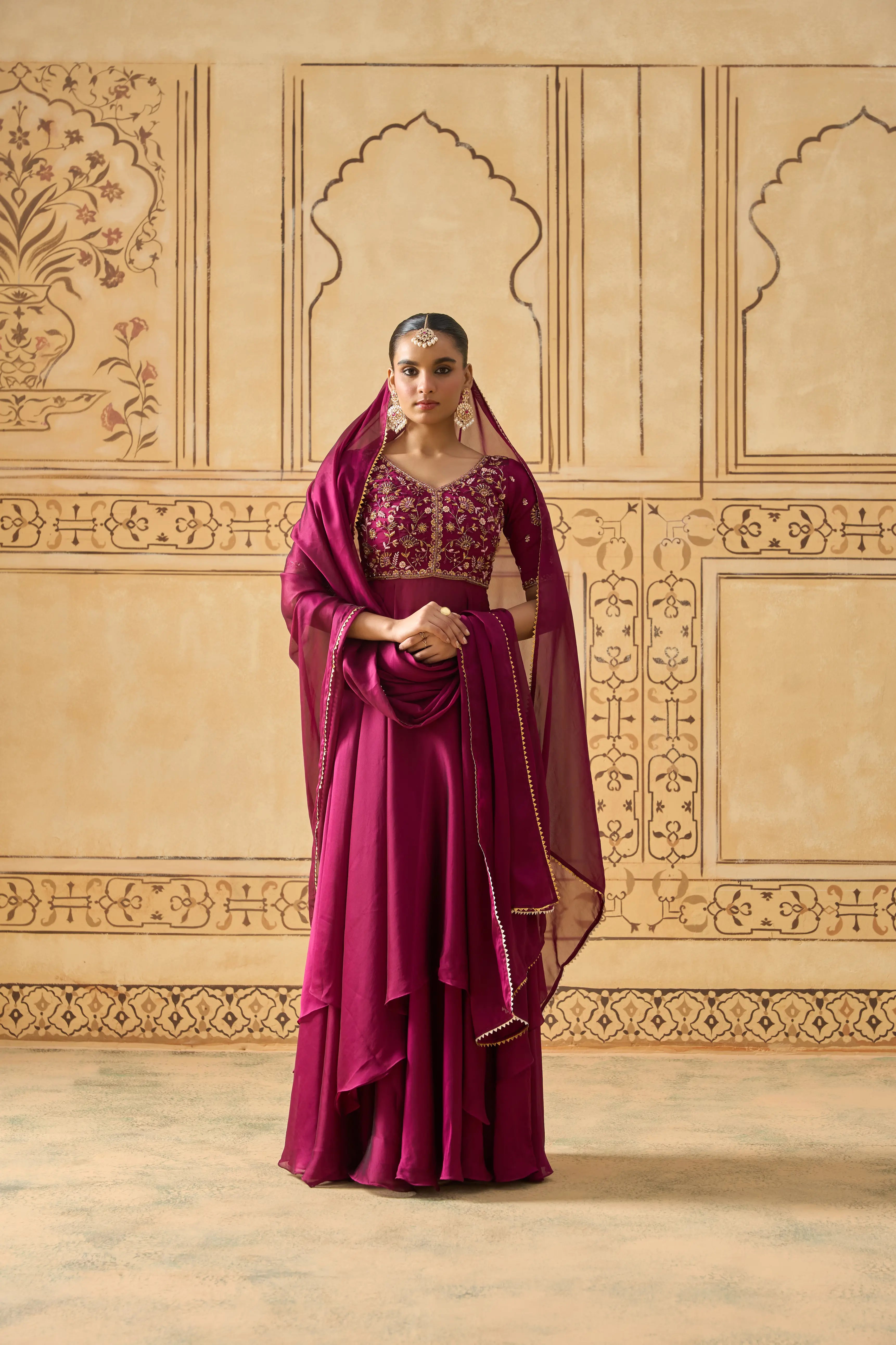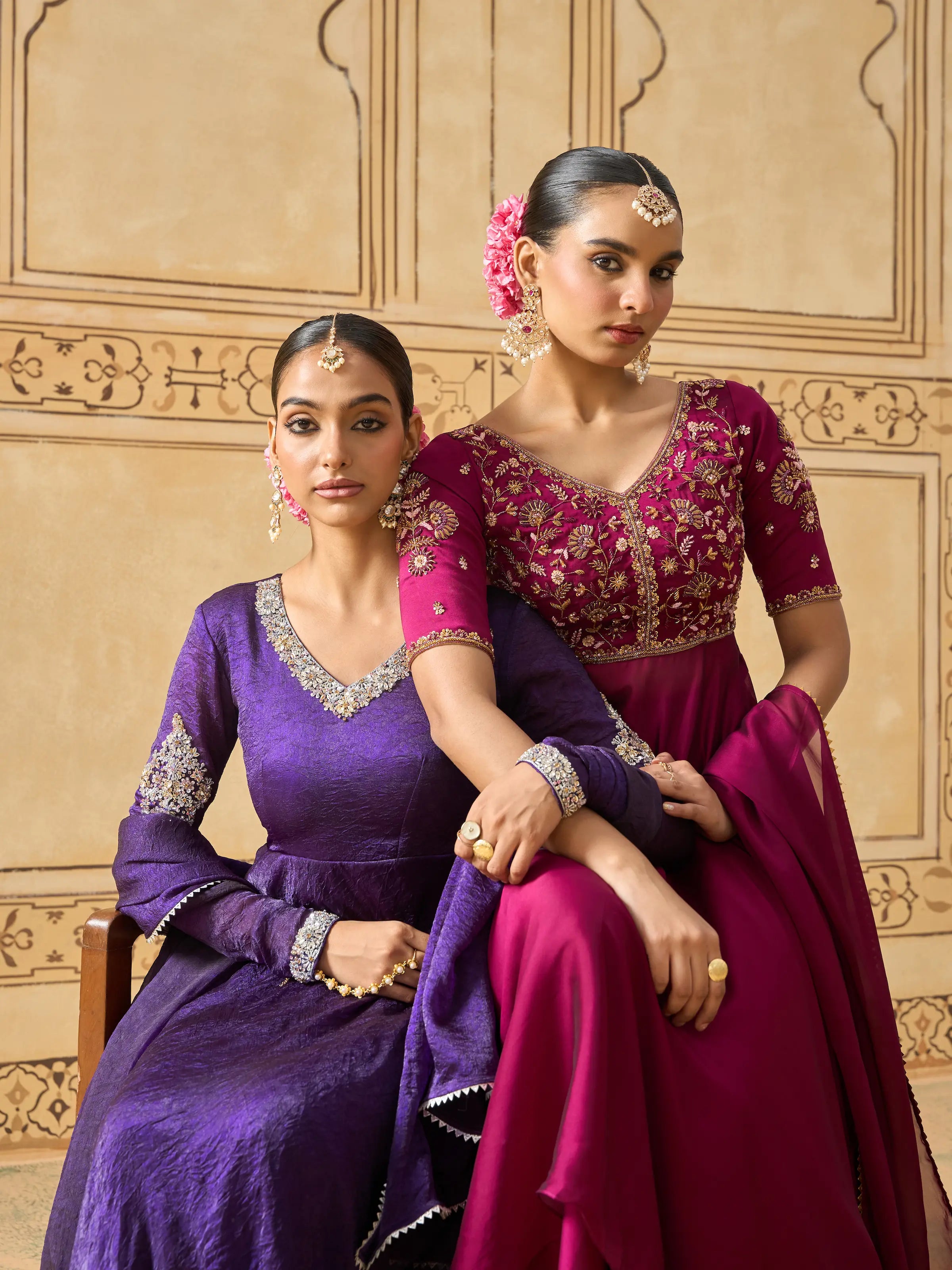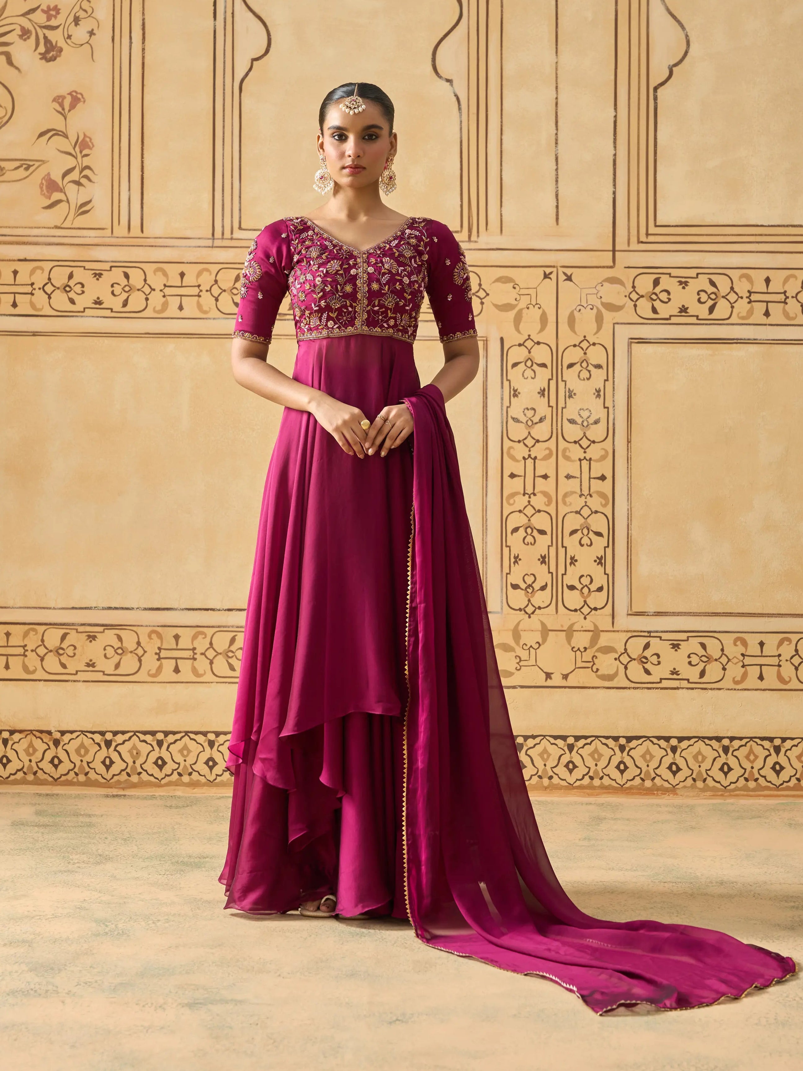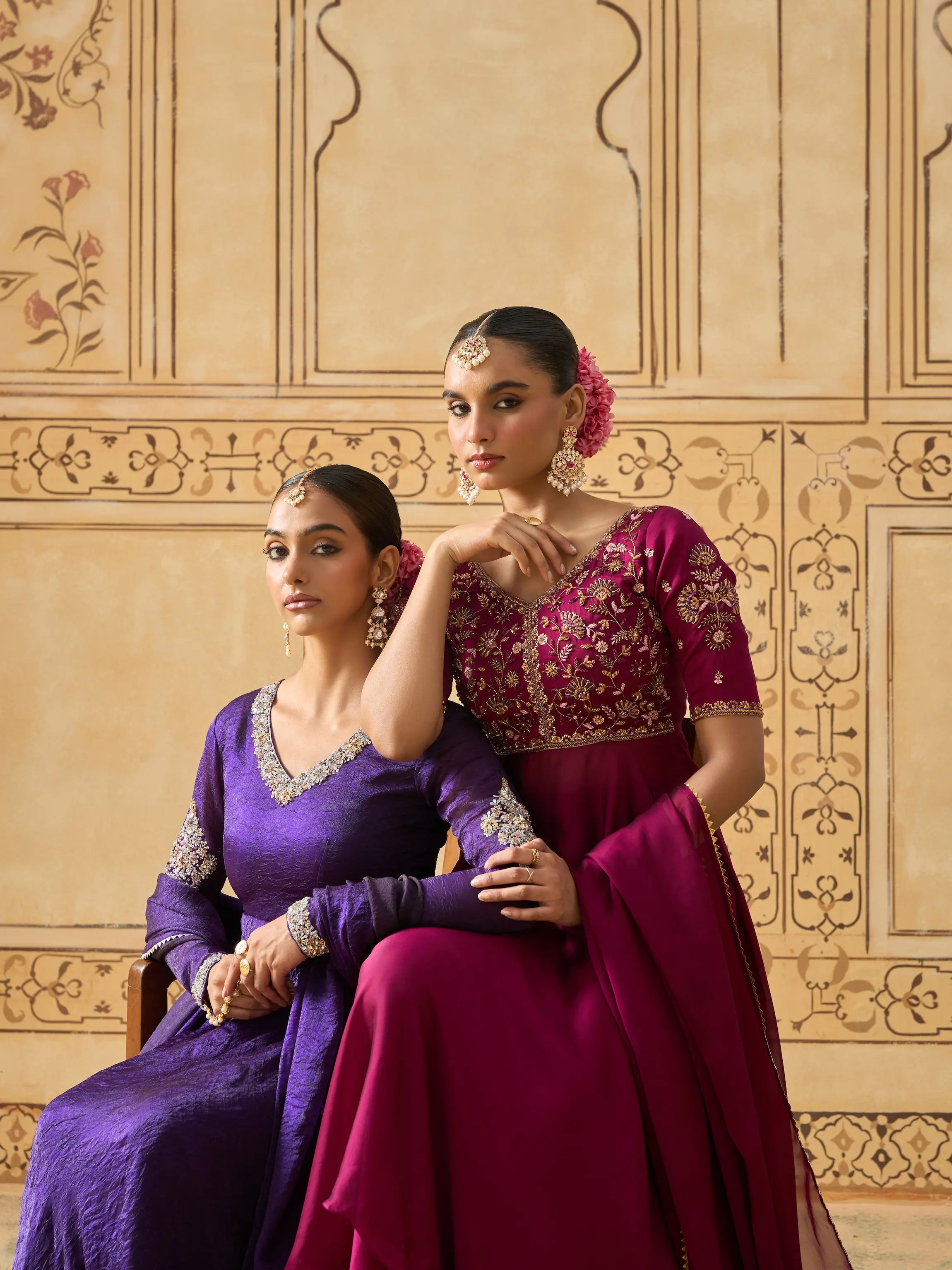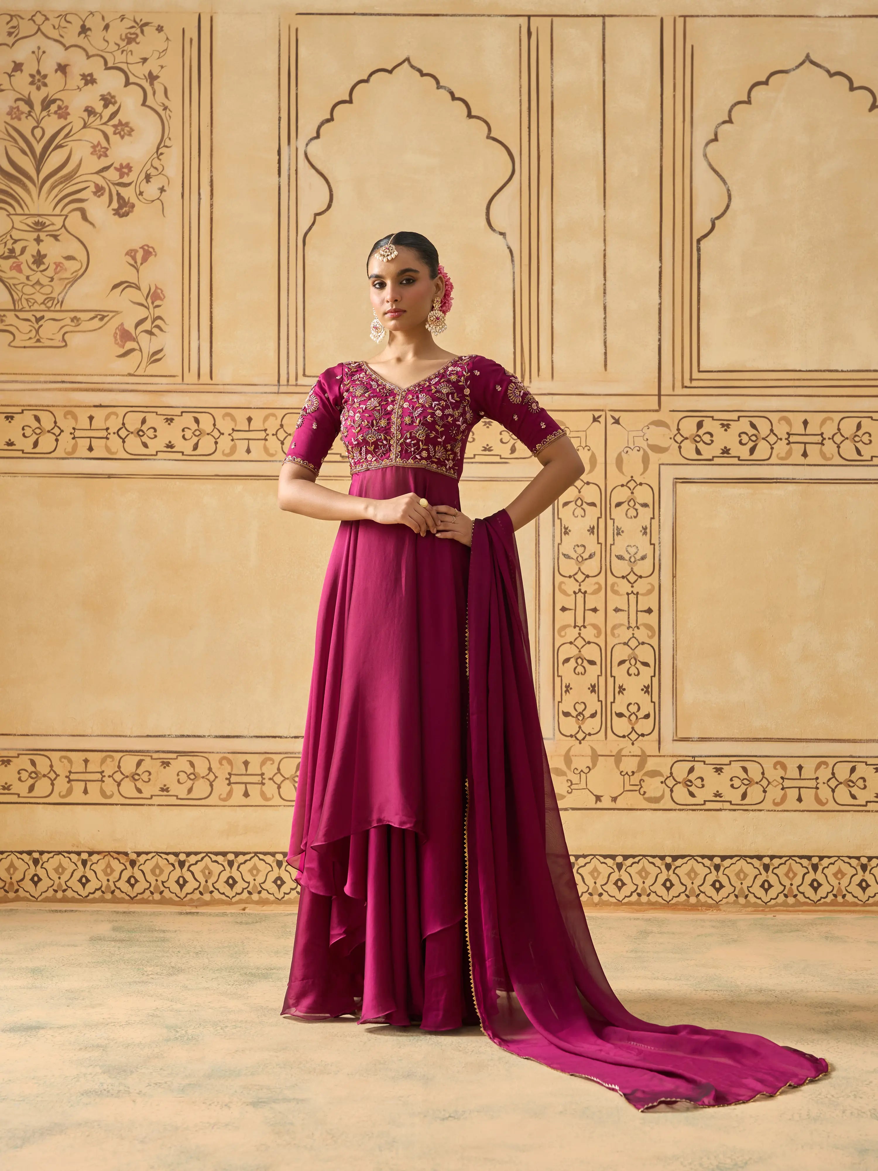 | Description | Exuding regal charm, this wine handkerchief Anarkali set is crafted in flowy American georgette, prized for its soft drape and lightweight elegance. The bodice and sleeves feature intricate zardosi embroidery with cutdana highlights, creating a rich interplay of traditional artistry and modern finesse. A layered handkerchief hemline adds graceful movement, complemented by a flared skirt and a matching dupatta with delicate finishing. Concealed zip closure. A timeless expression of luxury, perfect for weddings, receptions, and festive soirées. |