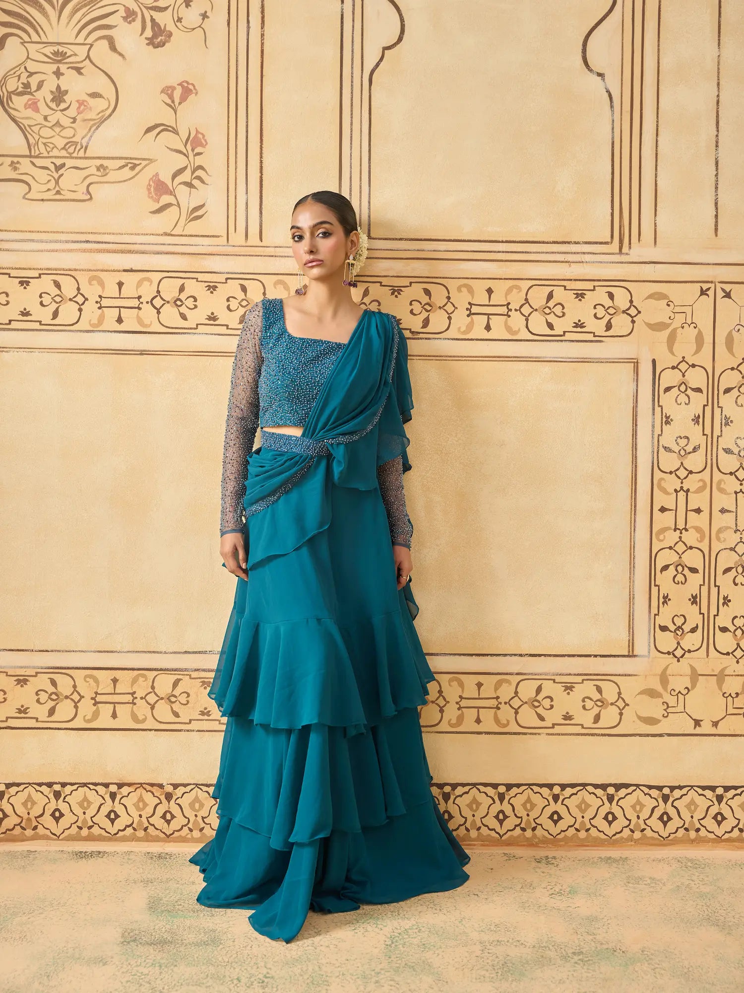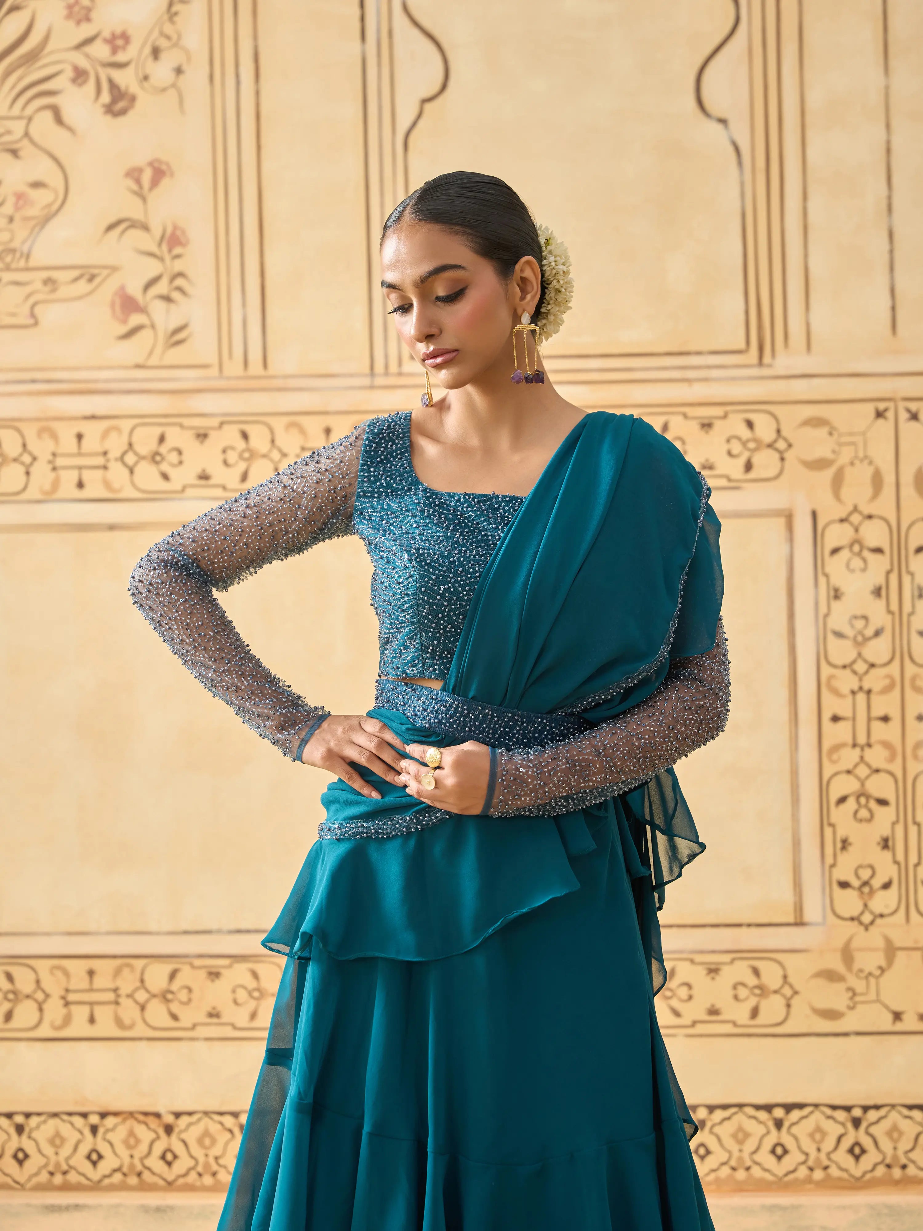 | Description | A striking fusion of glamour and grace, this ensemble is crafted in teal georgette with a three-layered draped lehenga that flows effortlessly with every step. The blouse, in delicate bead-embroidered net, features sheer full sleeves that sparkle with intricate detailing. A pre-stitched drape across the shoulder and waistline adds a modern twist, cinching the silhouette beautifully while keeping the elegance of a saree-inspired look. The tiered lehenga brings playful volume, making it perfect for twirls and celebrations. |