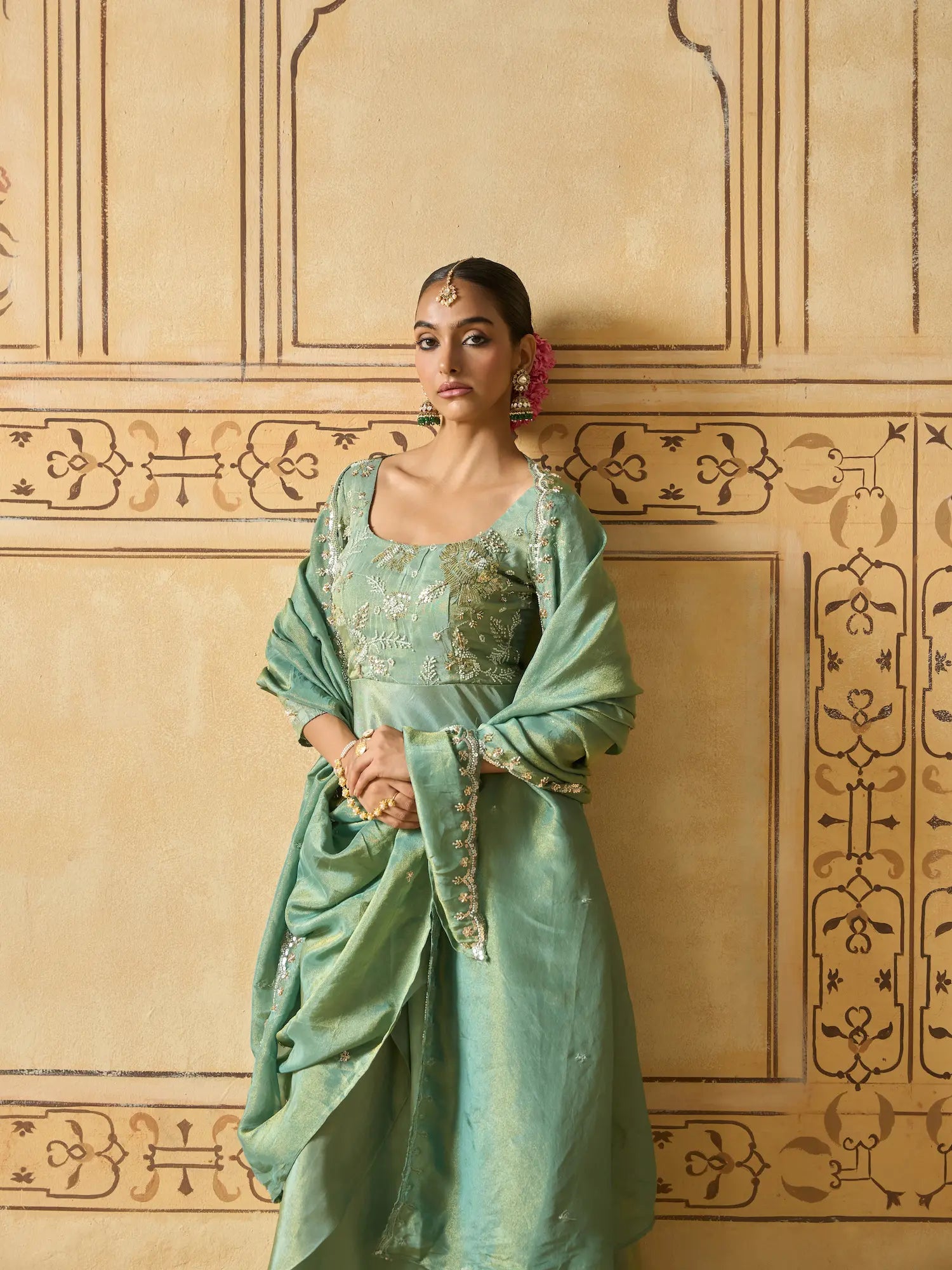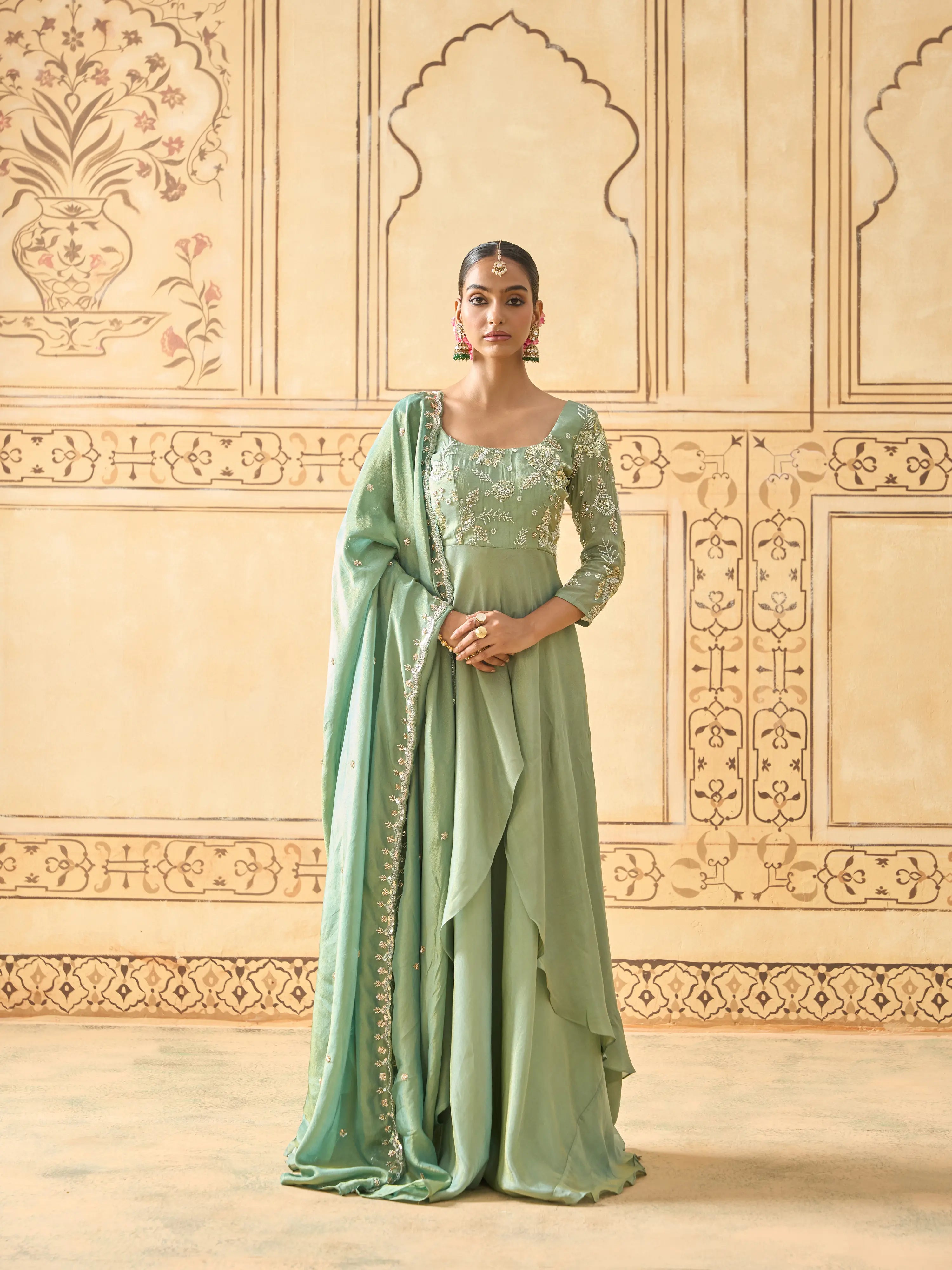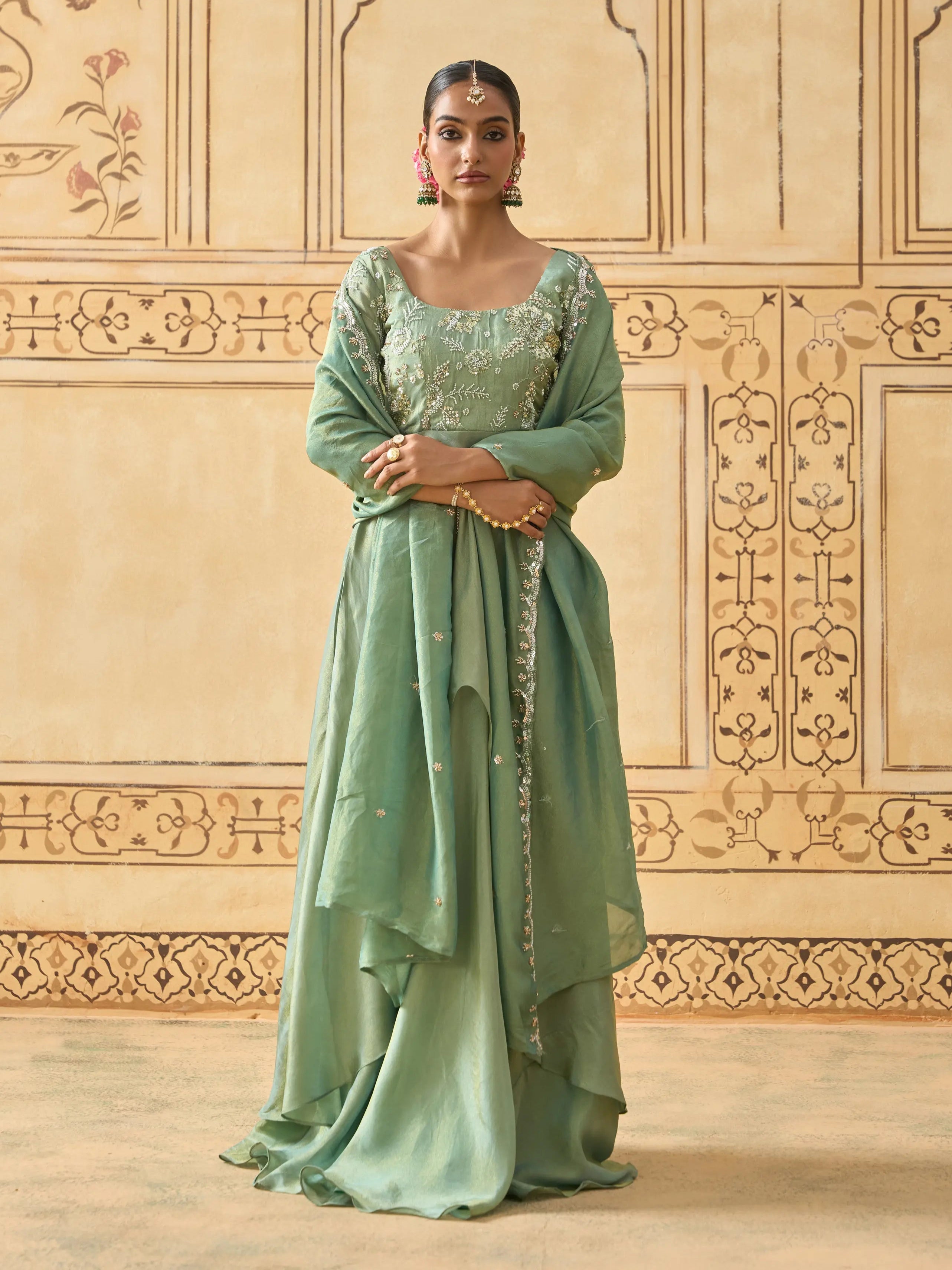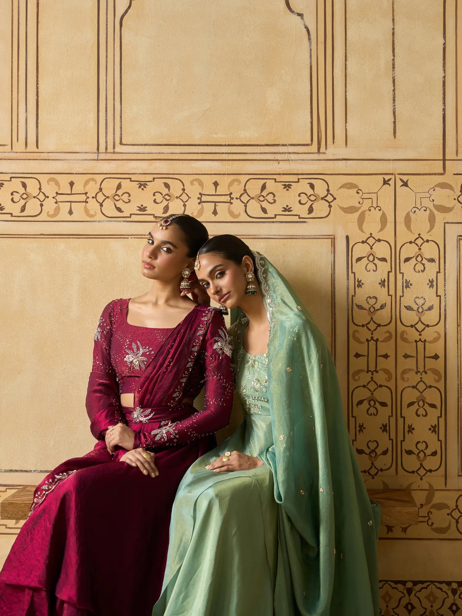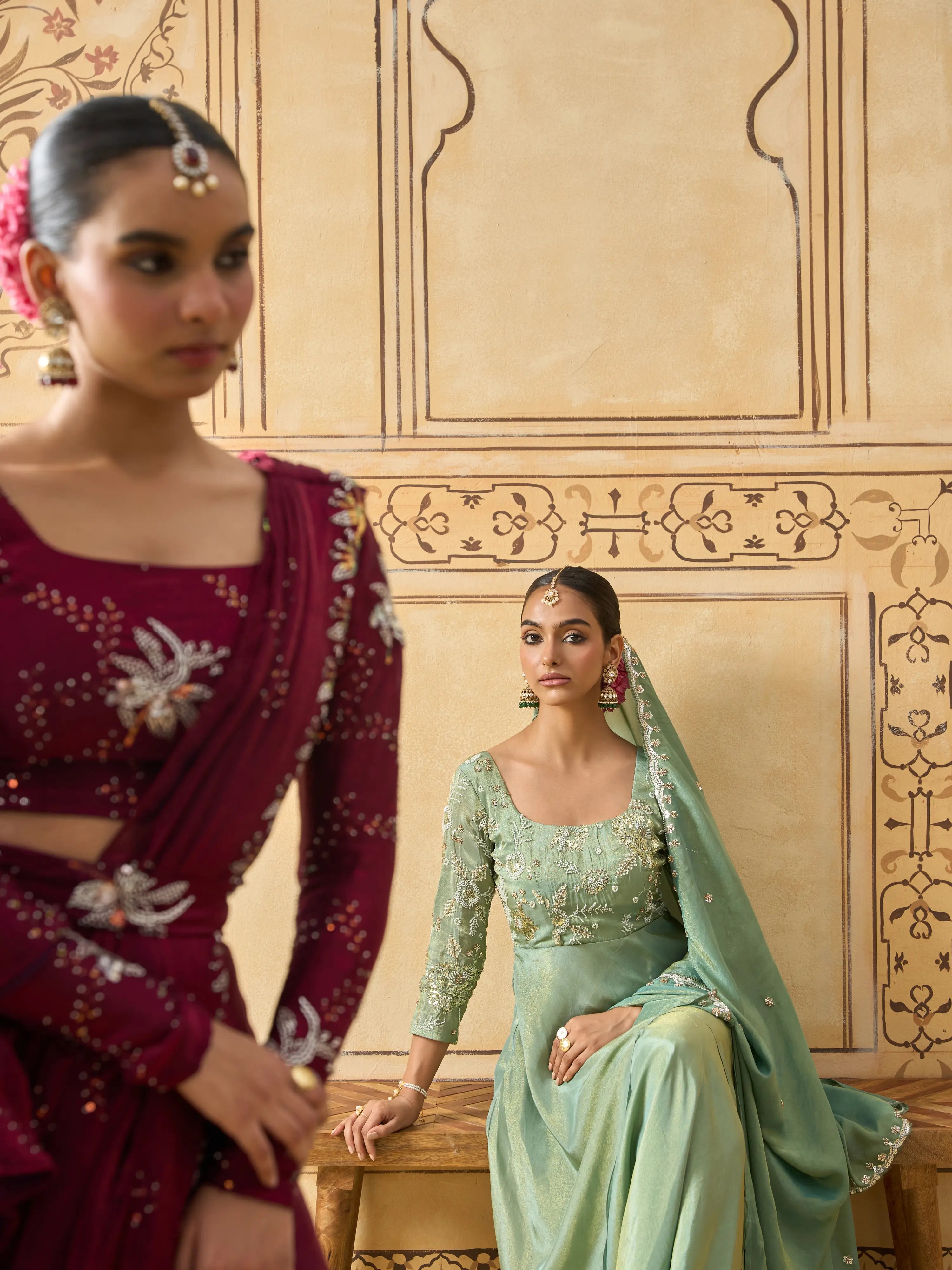 | Description | Graceful and fluid, this Anarkali set is crafted from luxurious cosmo silk, admired for its soft sheen and lightweight drape. The bodice and sleeves are embellished with delicate thread and sequin embroidery in floral vine patterns. A two-layered high-low hemline adds depth and movement, paired with a scallop-edged dupatta featuring matching embroidery and dainty accents. Concealed zip closure. Perfect for mehendi functions, daytime weddings, or festive celebrations. |