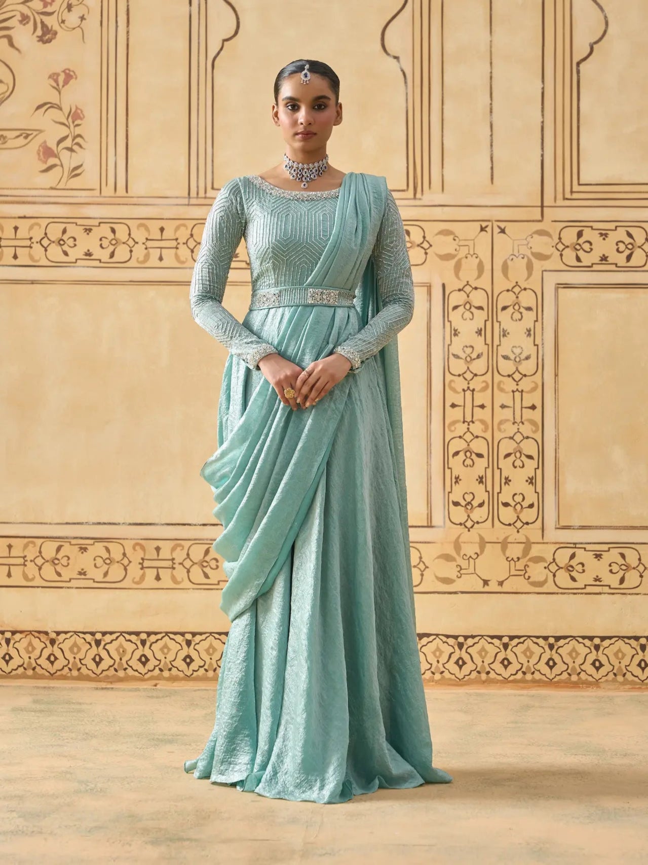 | Description | Step into sophistication with this metallic blue drape dress, crafted in luxurious Fendi Crush fabric. The ensemble features intricate zardosi, sequin, and cutdana work on the neckline and sleeves, adding regal charm and elegance. A statement embellished belt cinches the waist to enhance your silhouette, while the graceful drape flows effortlessly for a bold yet refined look. Note: Pants not included. |