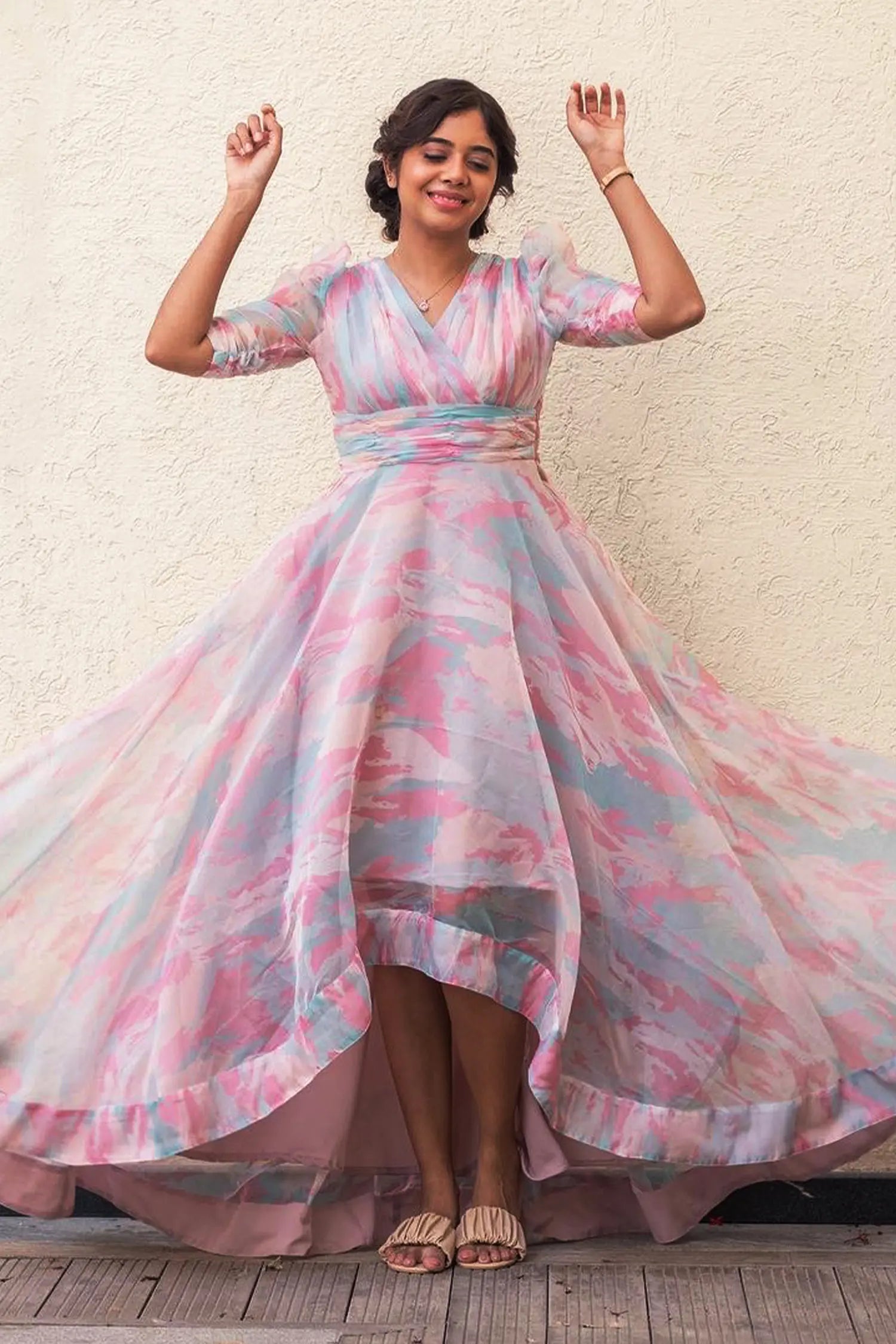 | Description | Floral print Banarasi high-collar neck organza kurti with dramatic sleeves, paired with a lavender brocade woven circular pattern straight pant. |