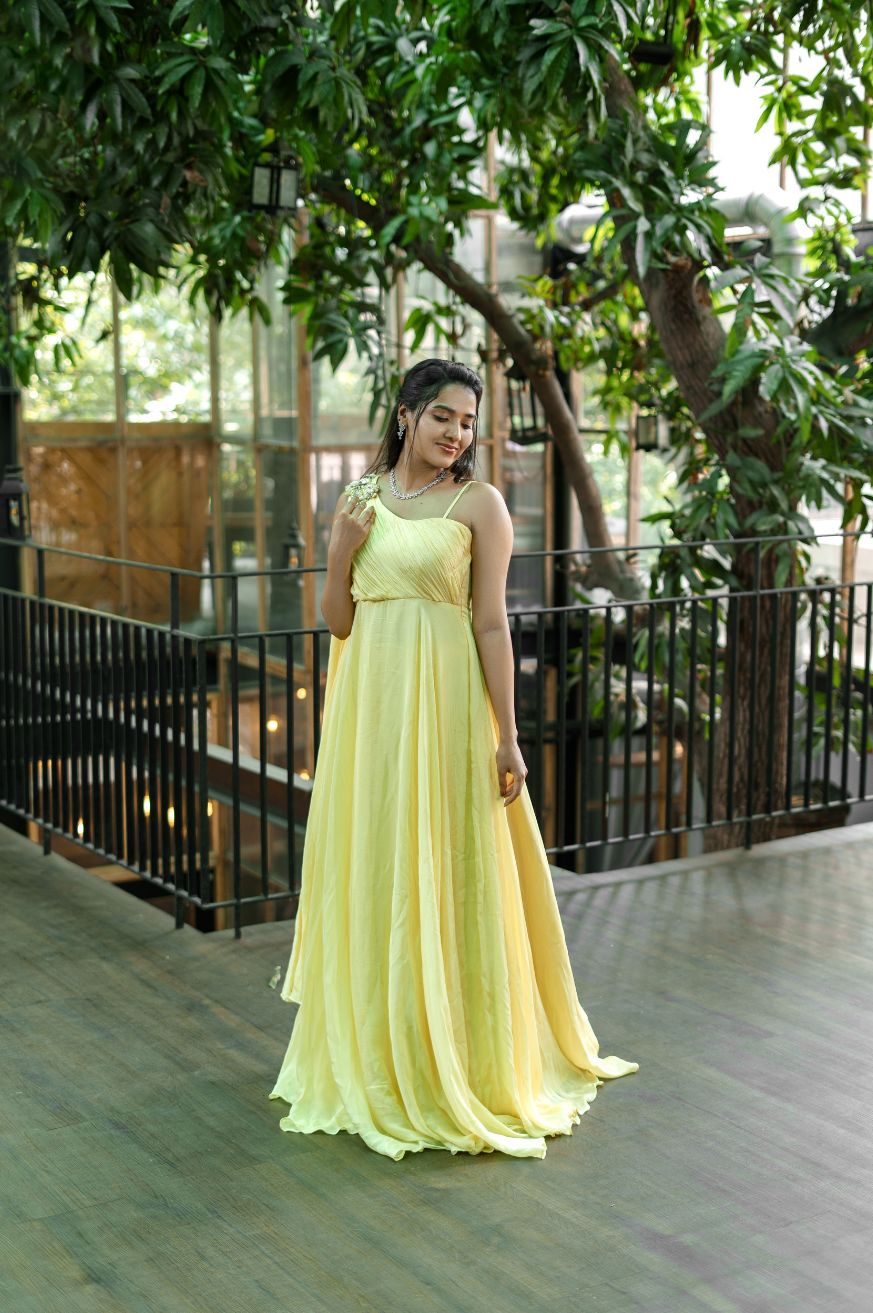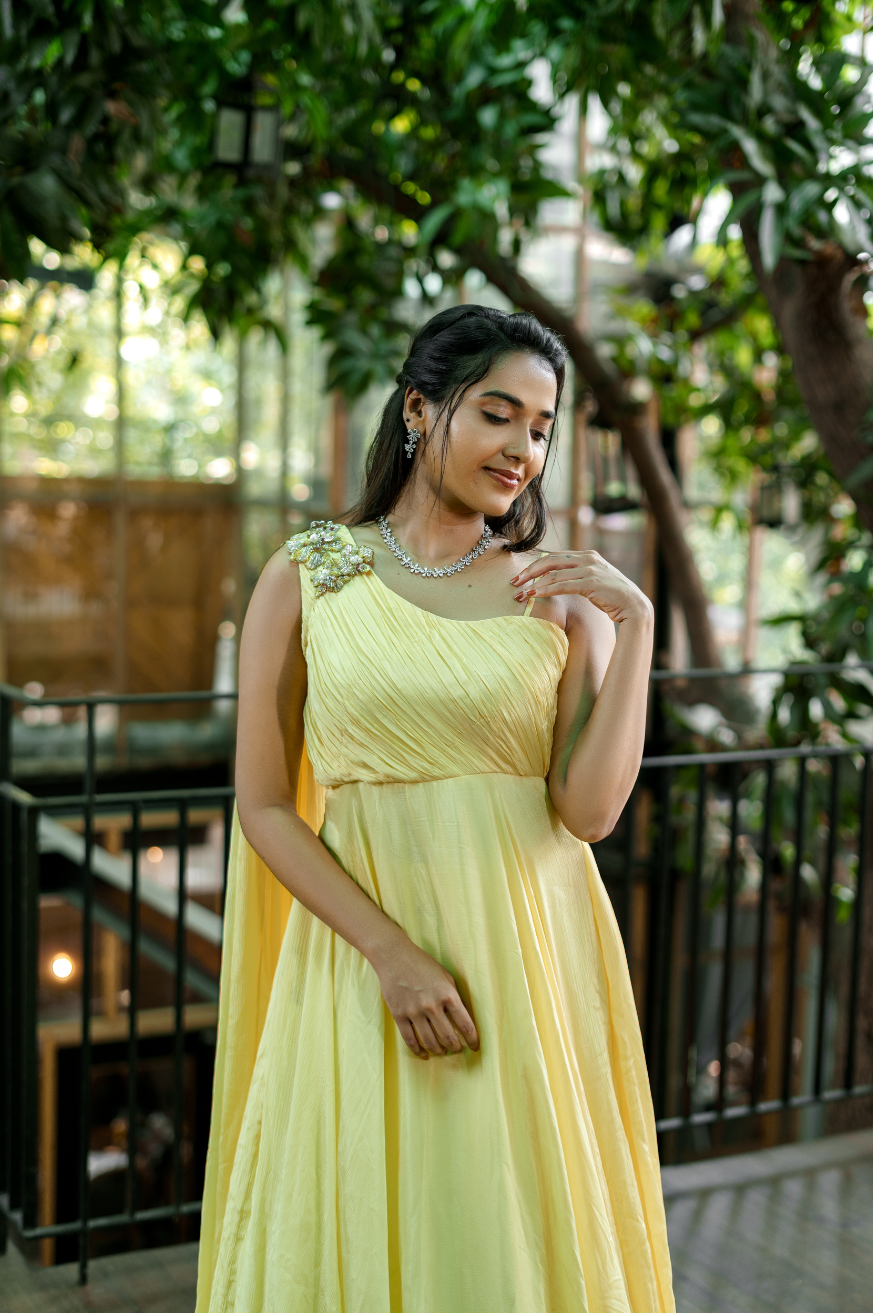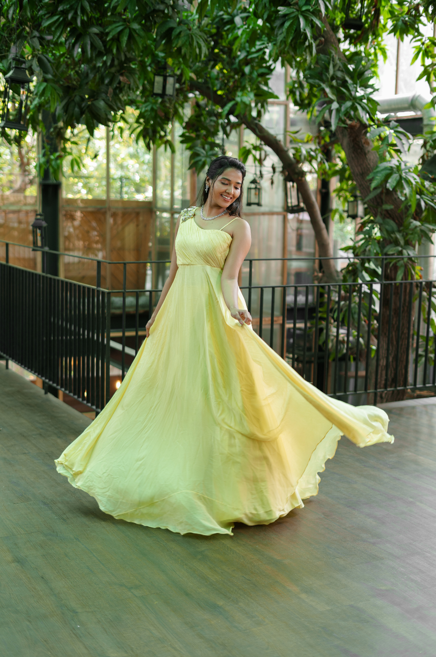 | Style | One shoulder super flare dress with attached floral embroidered patches on shoulder top (sleeves customizable) |