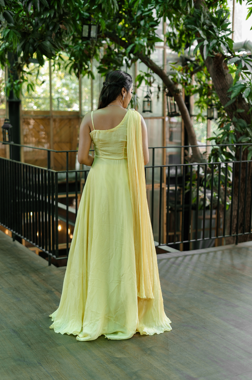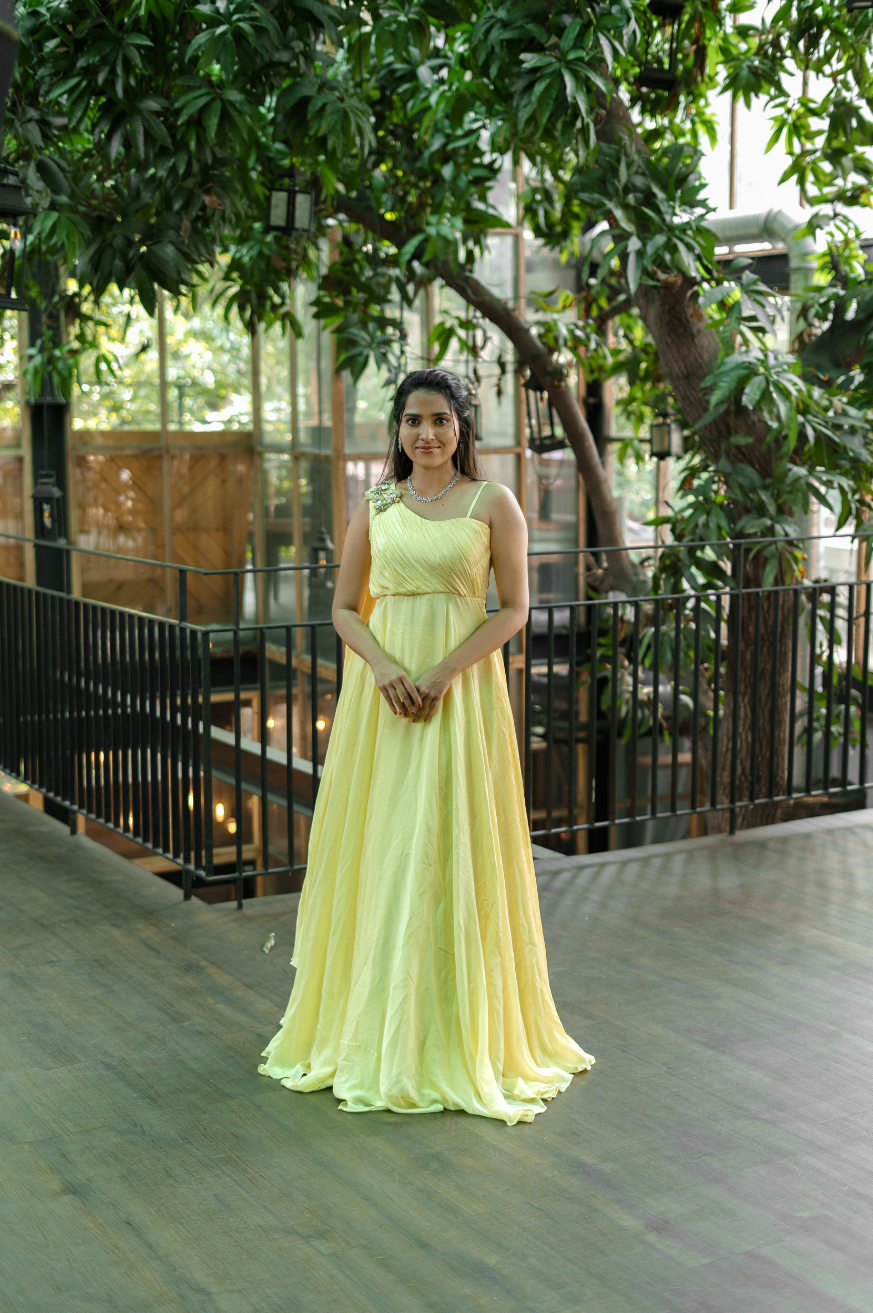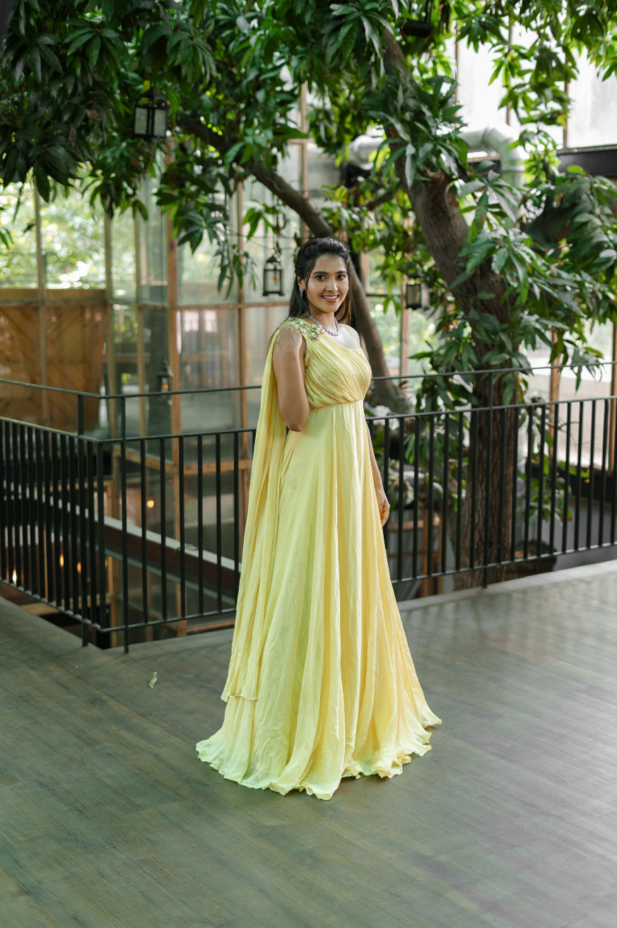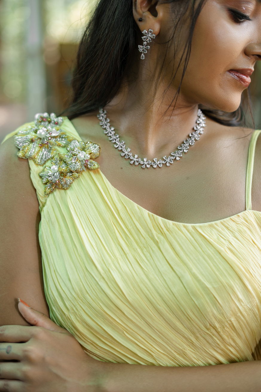 | Style | One shoulder super flare dress with attached floral embroidered patches on shoulder top (sleeves customizable) |