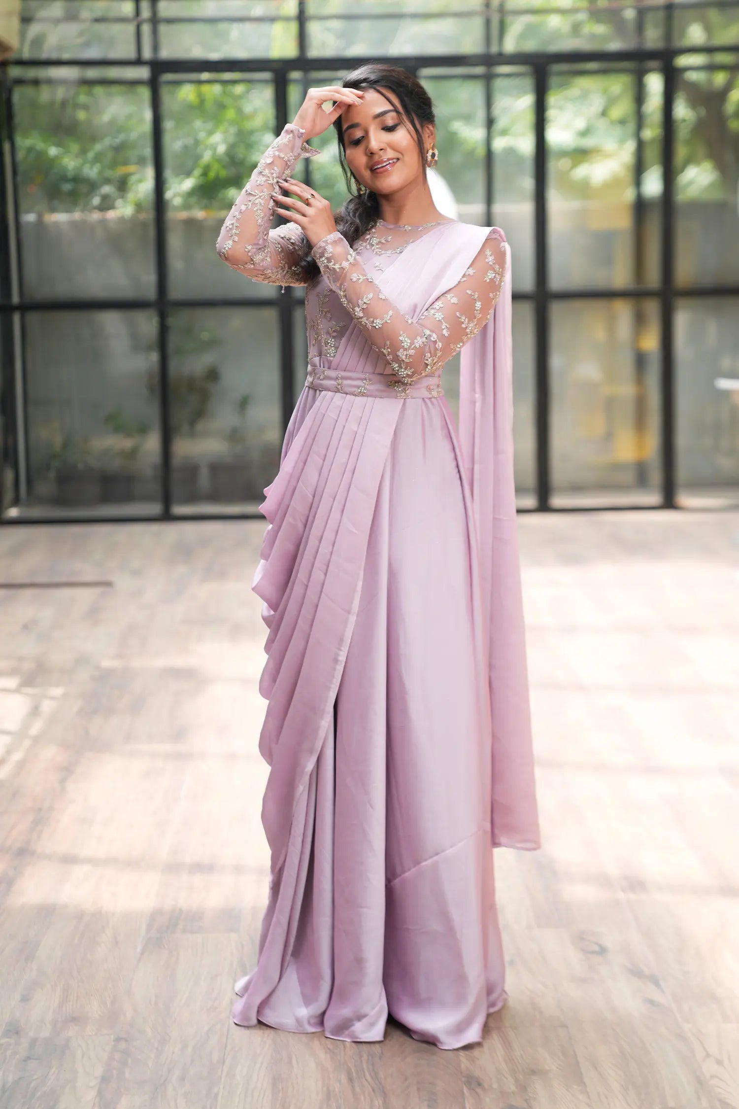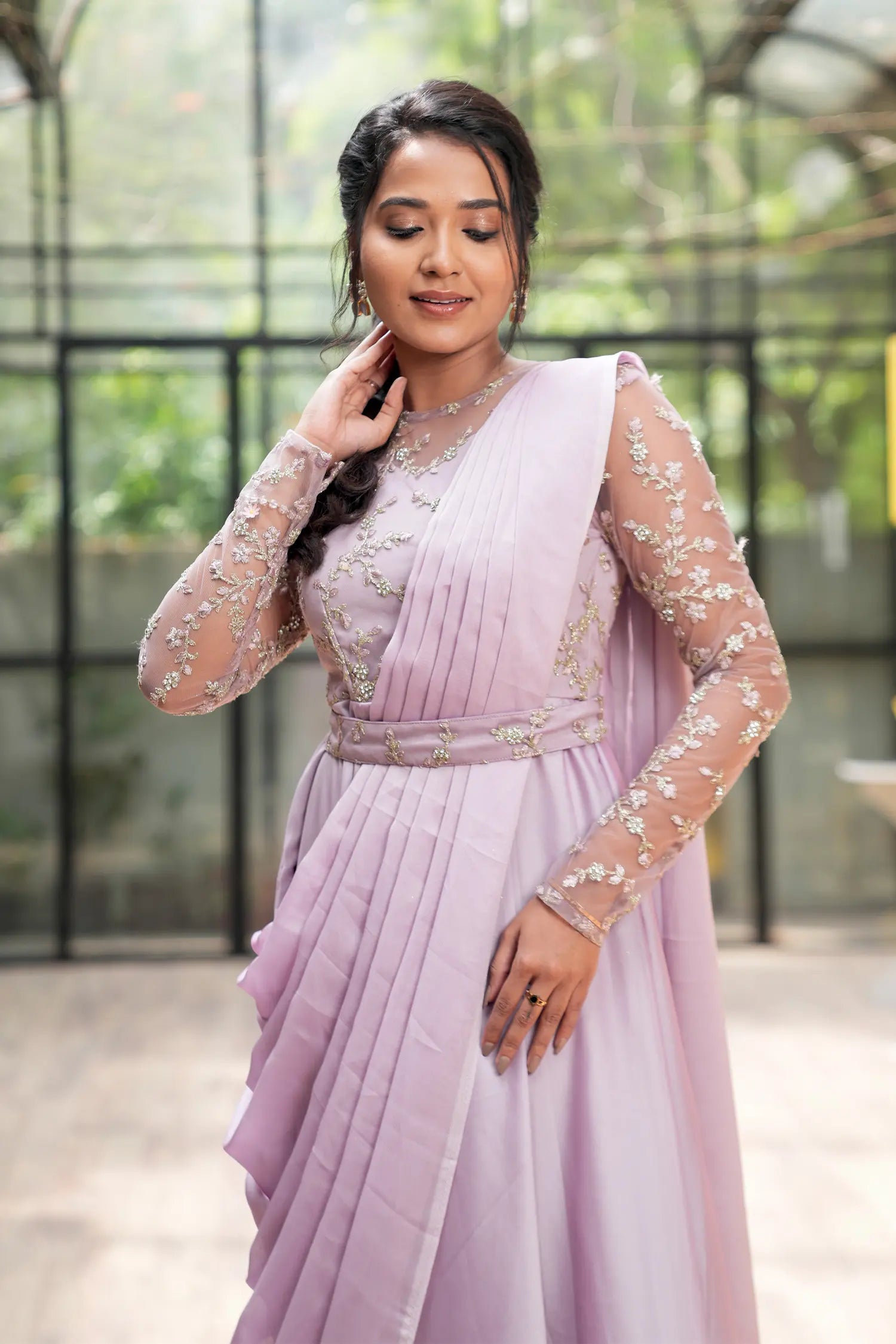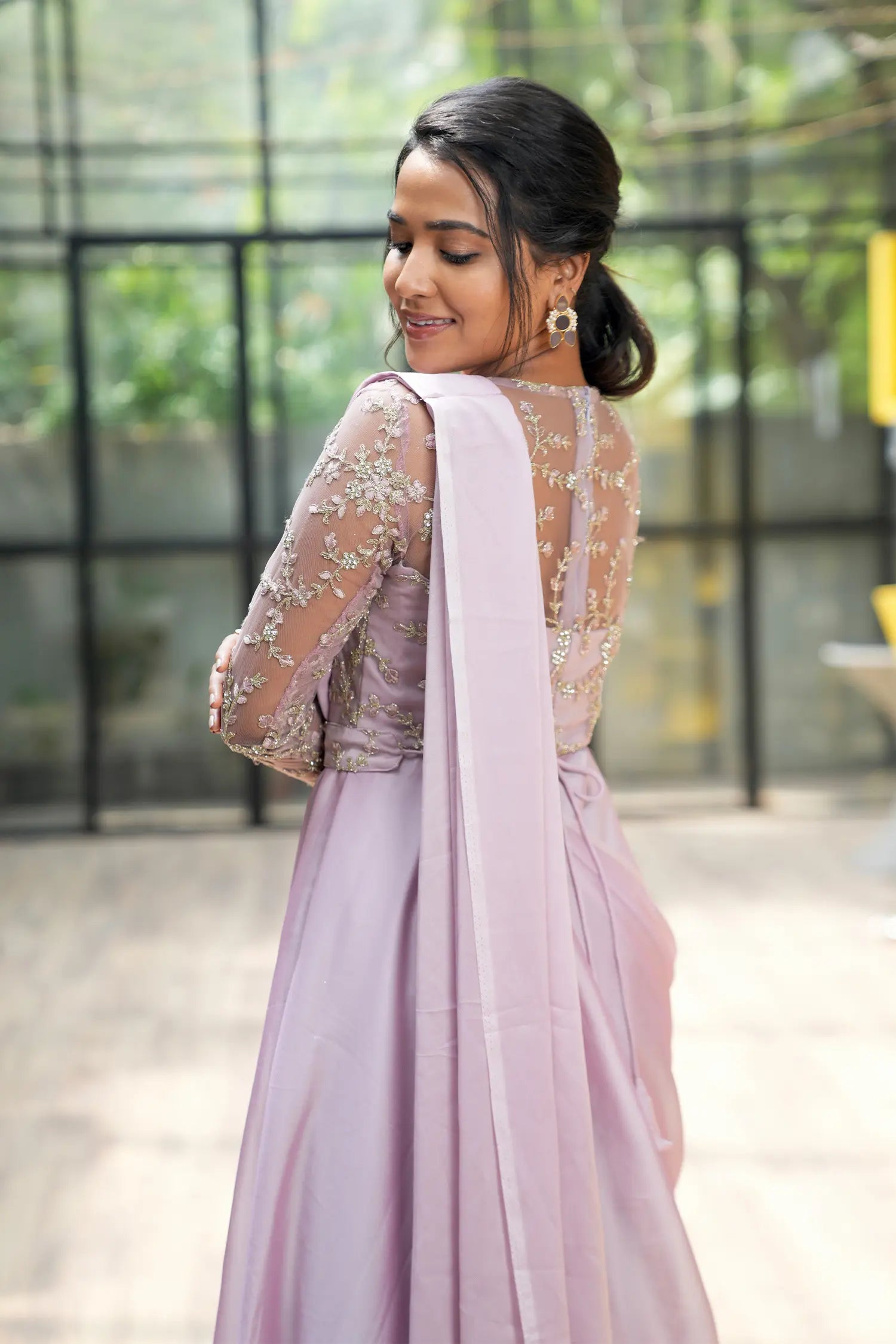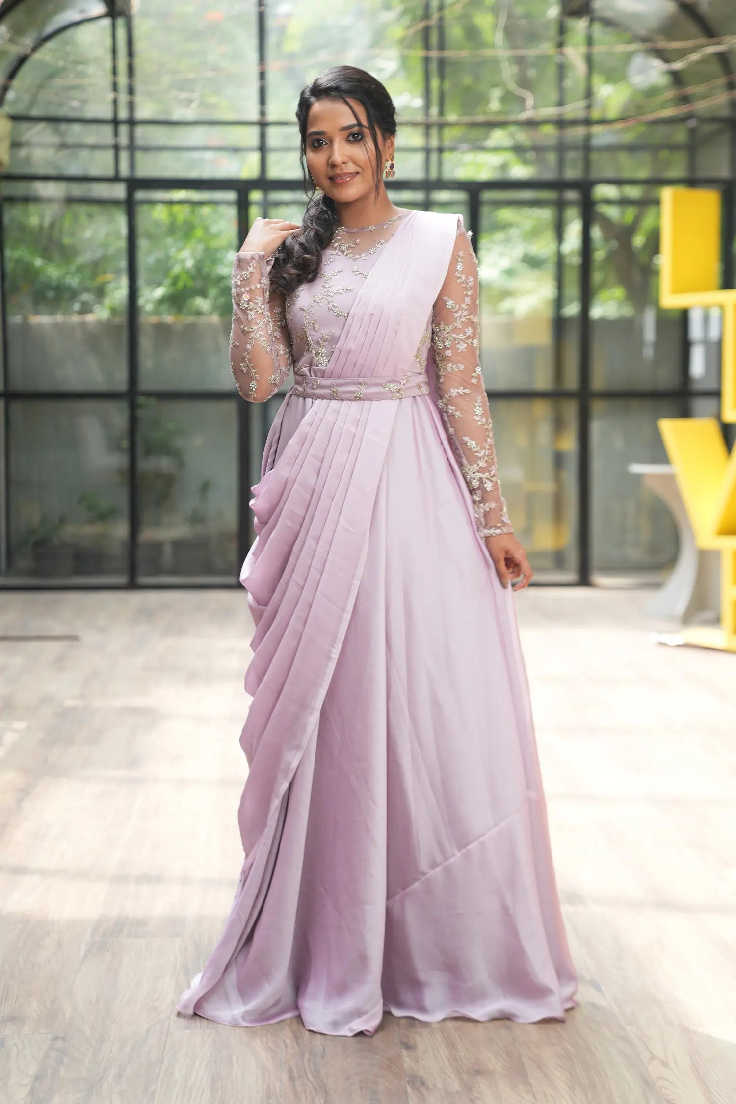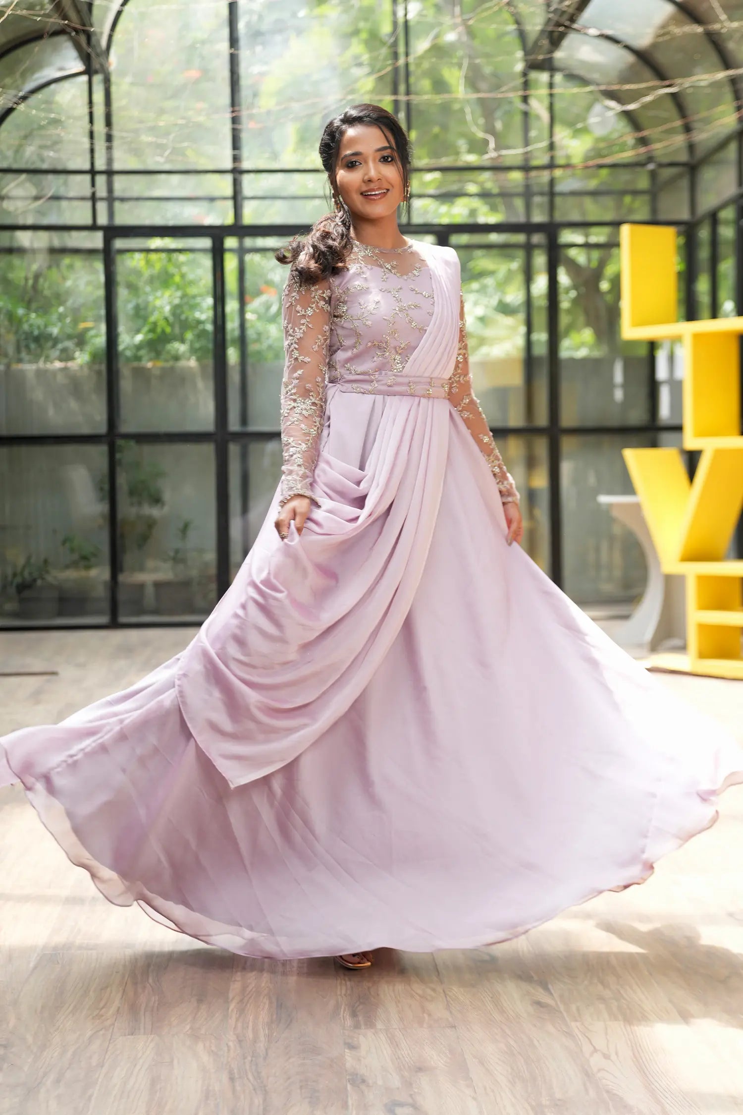| Description | Elegant lilac drape gown in shiny georgette with intricate stone work on the yoke, paired with a draped dupatta. Pants not included. |