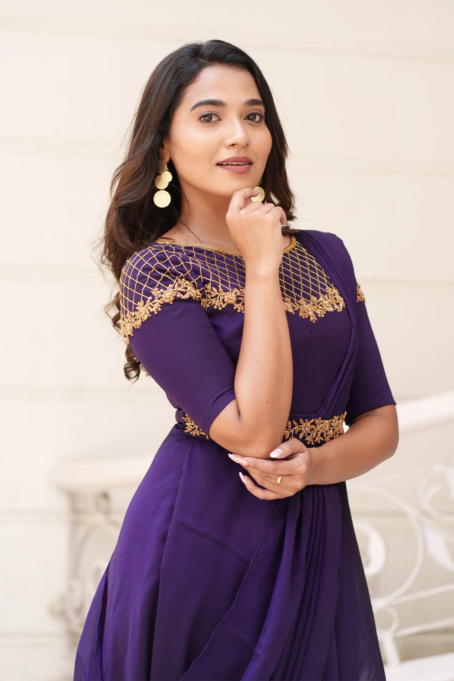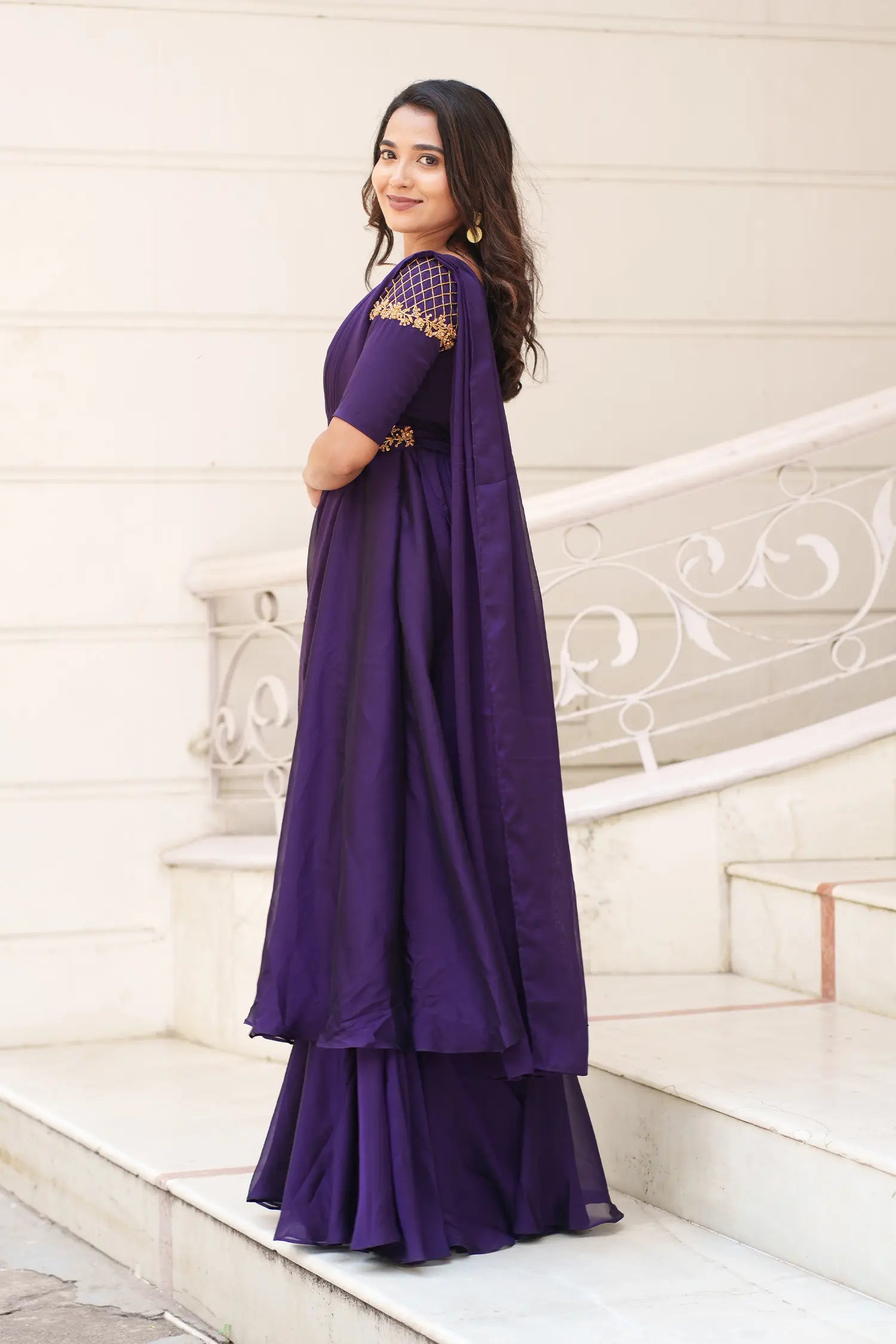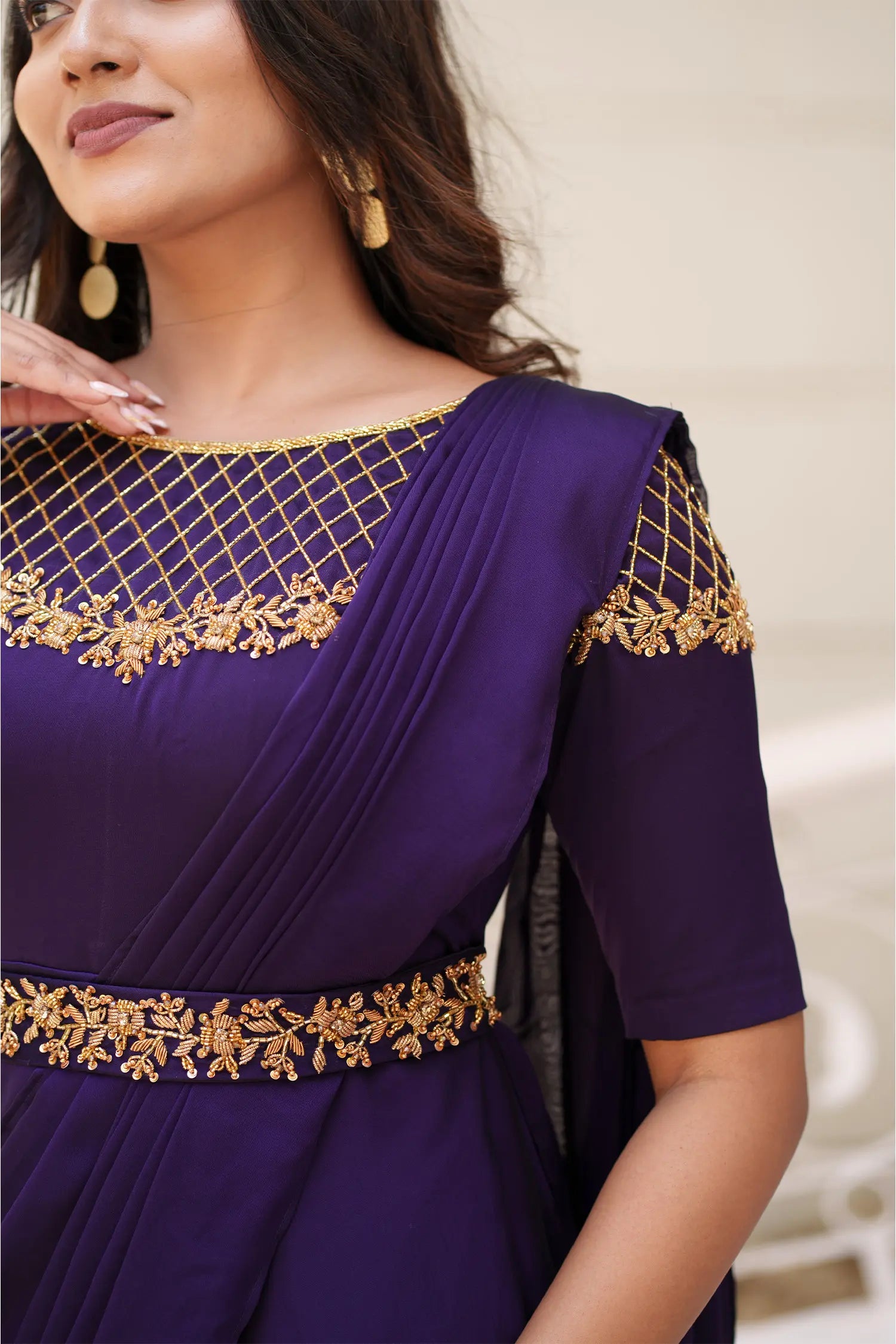 | Description | Drape dress in deep violet, embellished with zardosi on the neckline and sleeves, paired with a handwork belt. Pants not included. Ideal for wedding parties and festive occasions. |