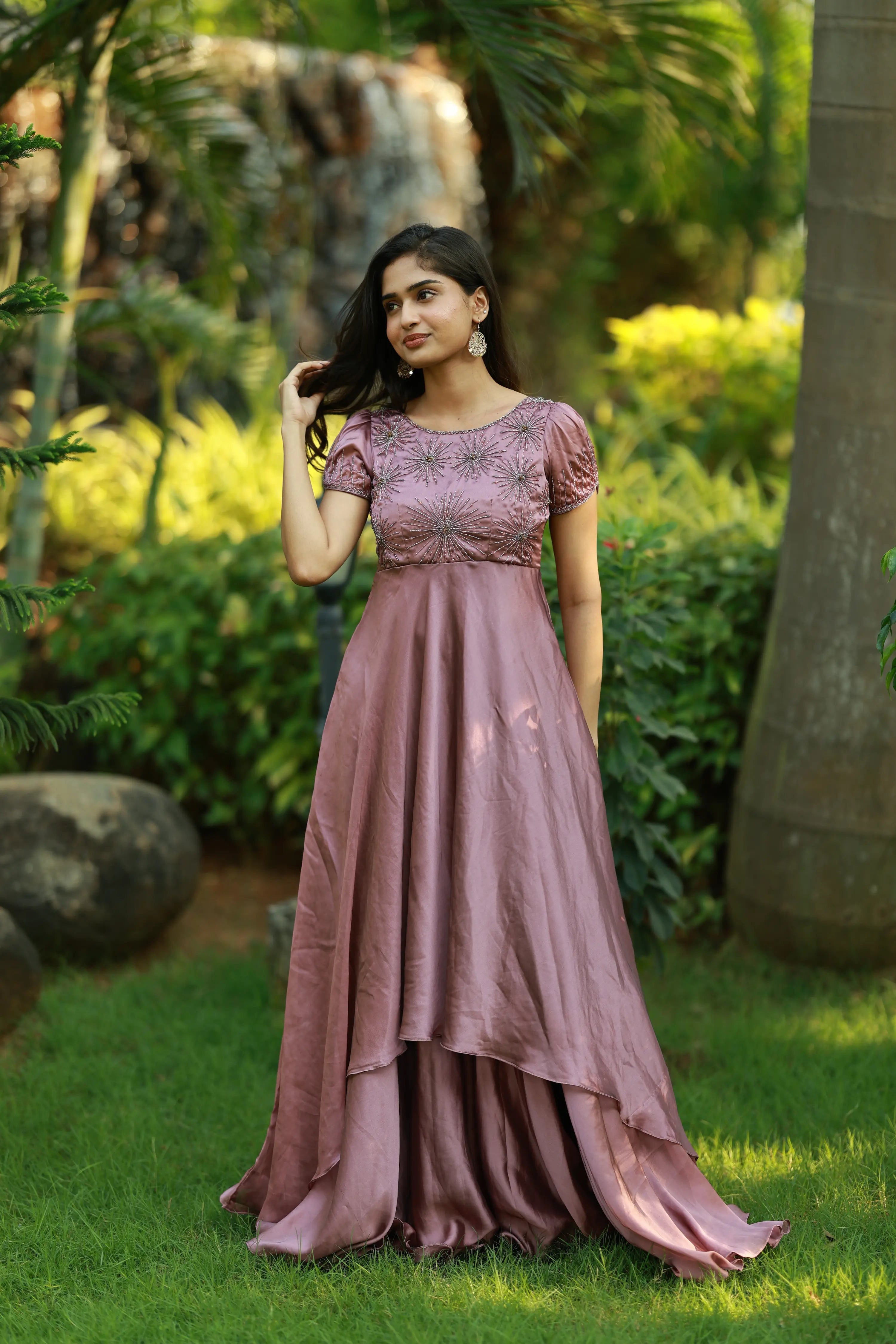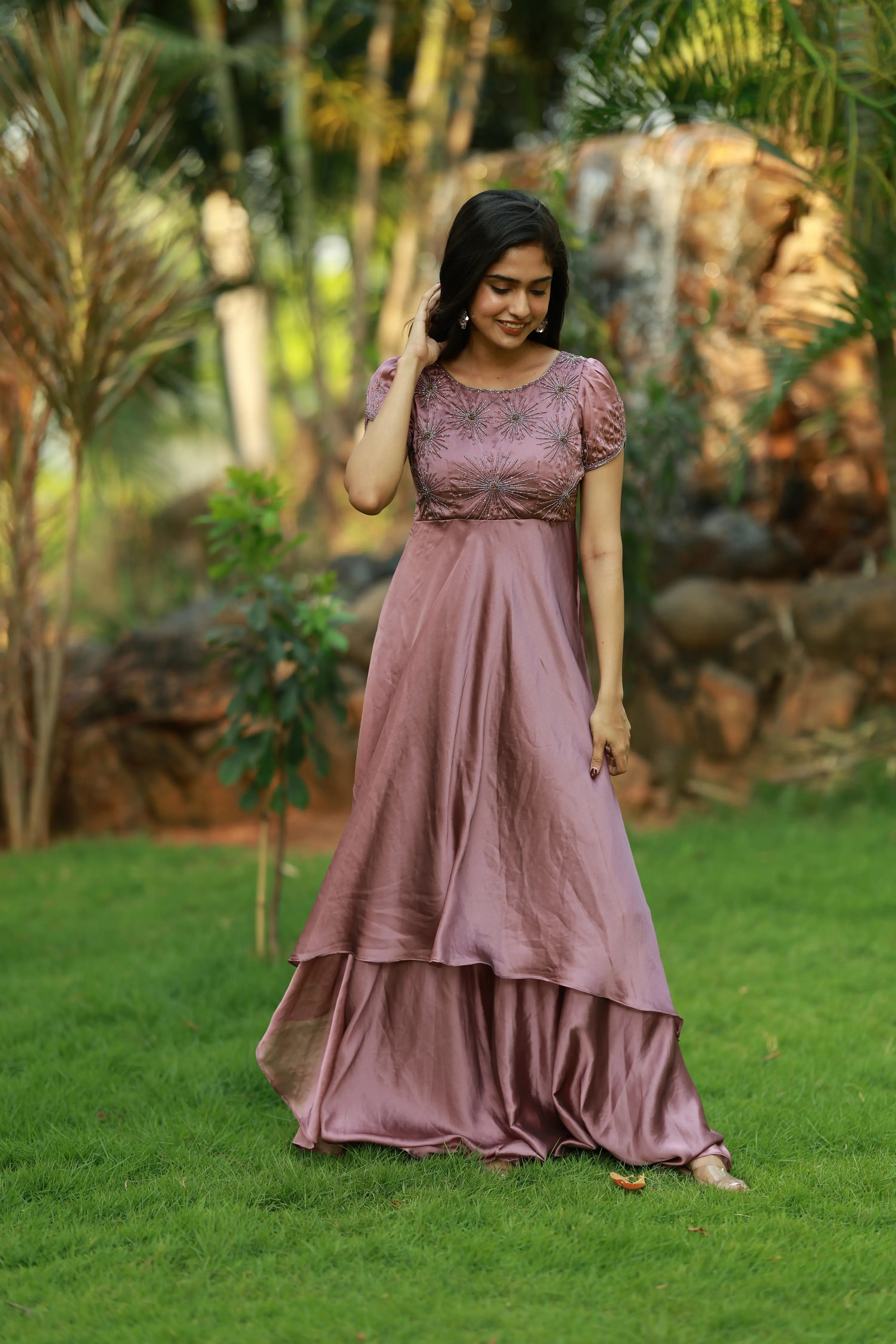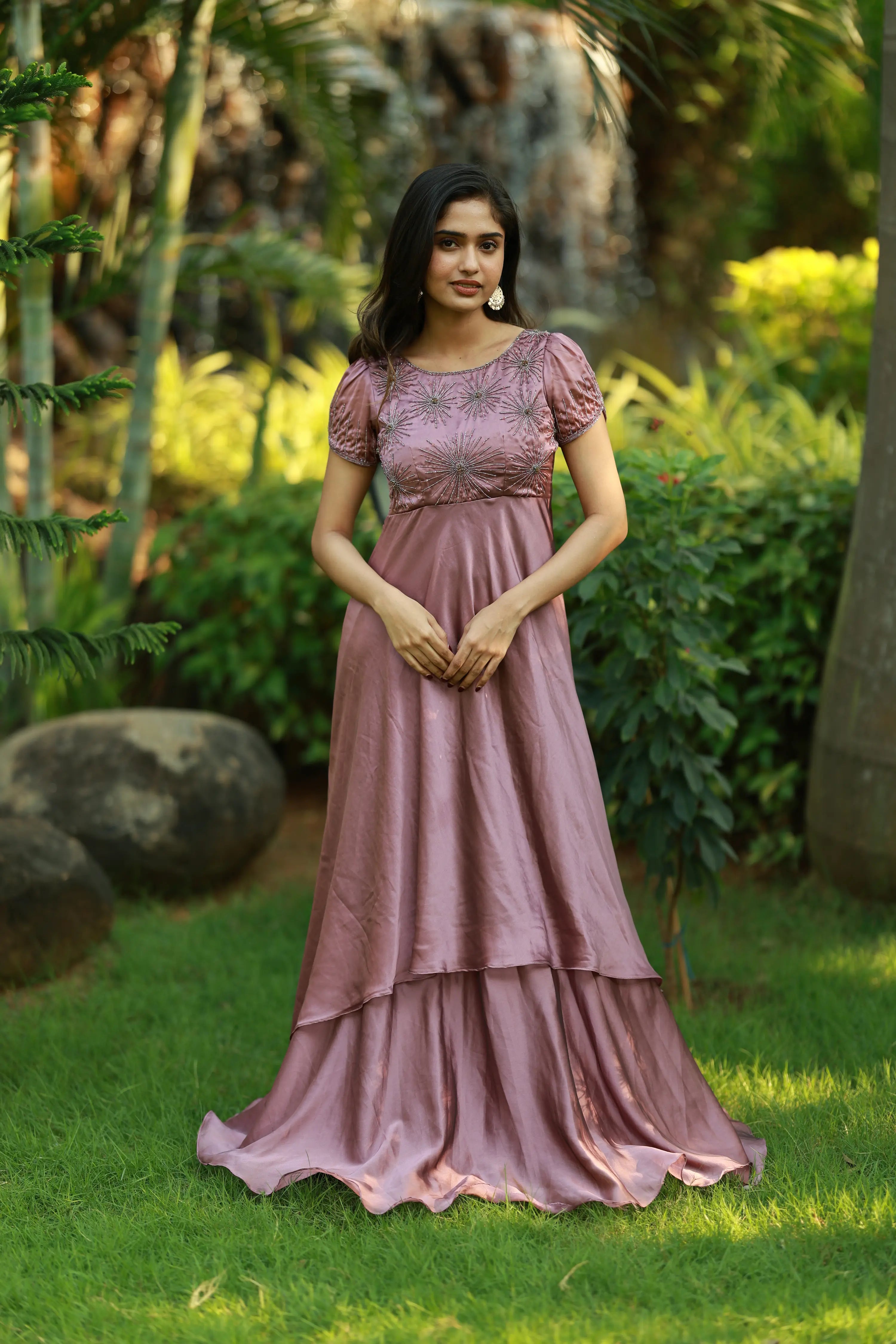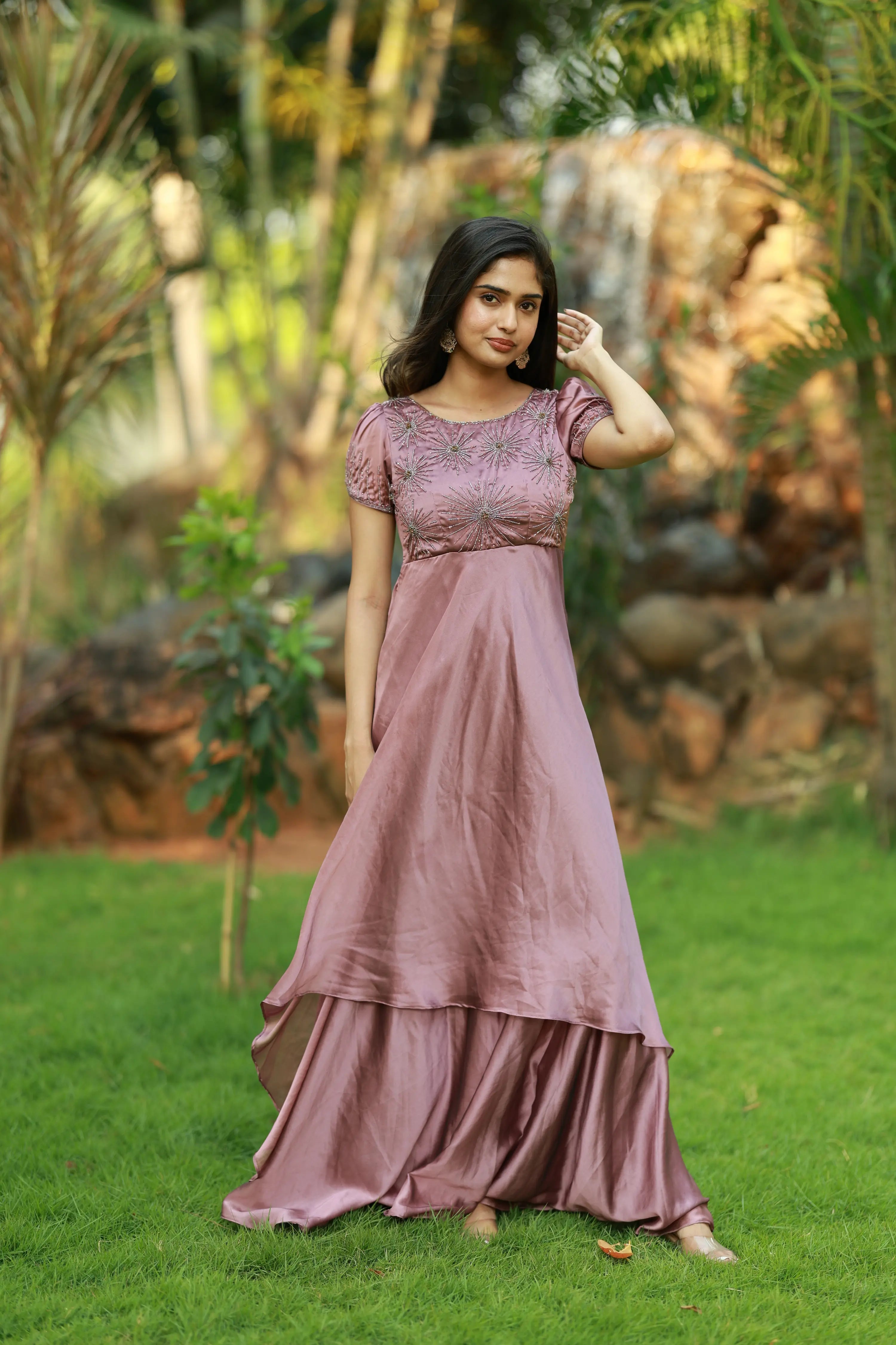 | Description | Two-layered gown featuring intricate handwork detailing on the yoke and sleeves. Designed for a graceful silhouette, this gown combines elegant craftsmanship with contemporary style. |