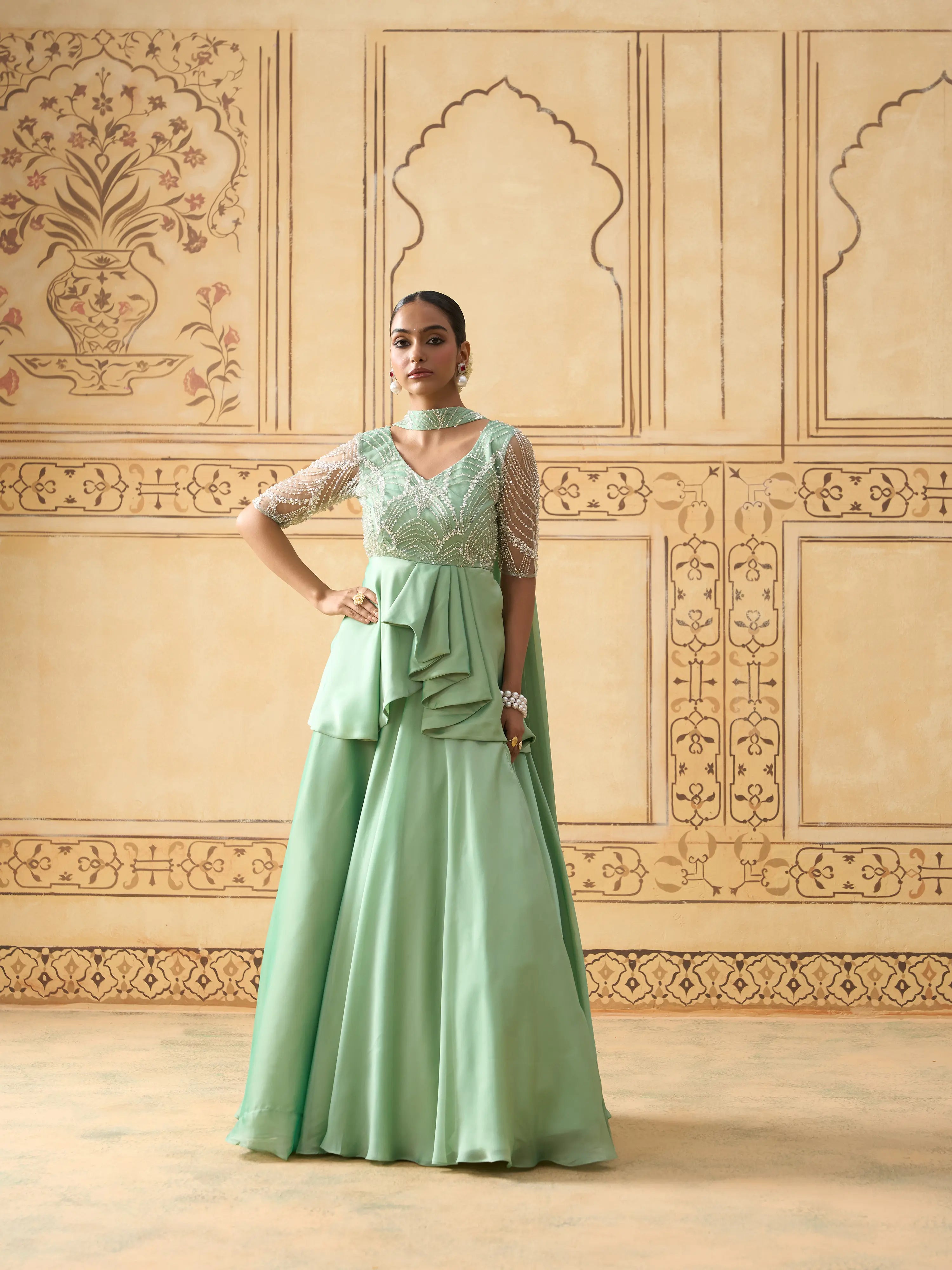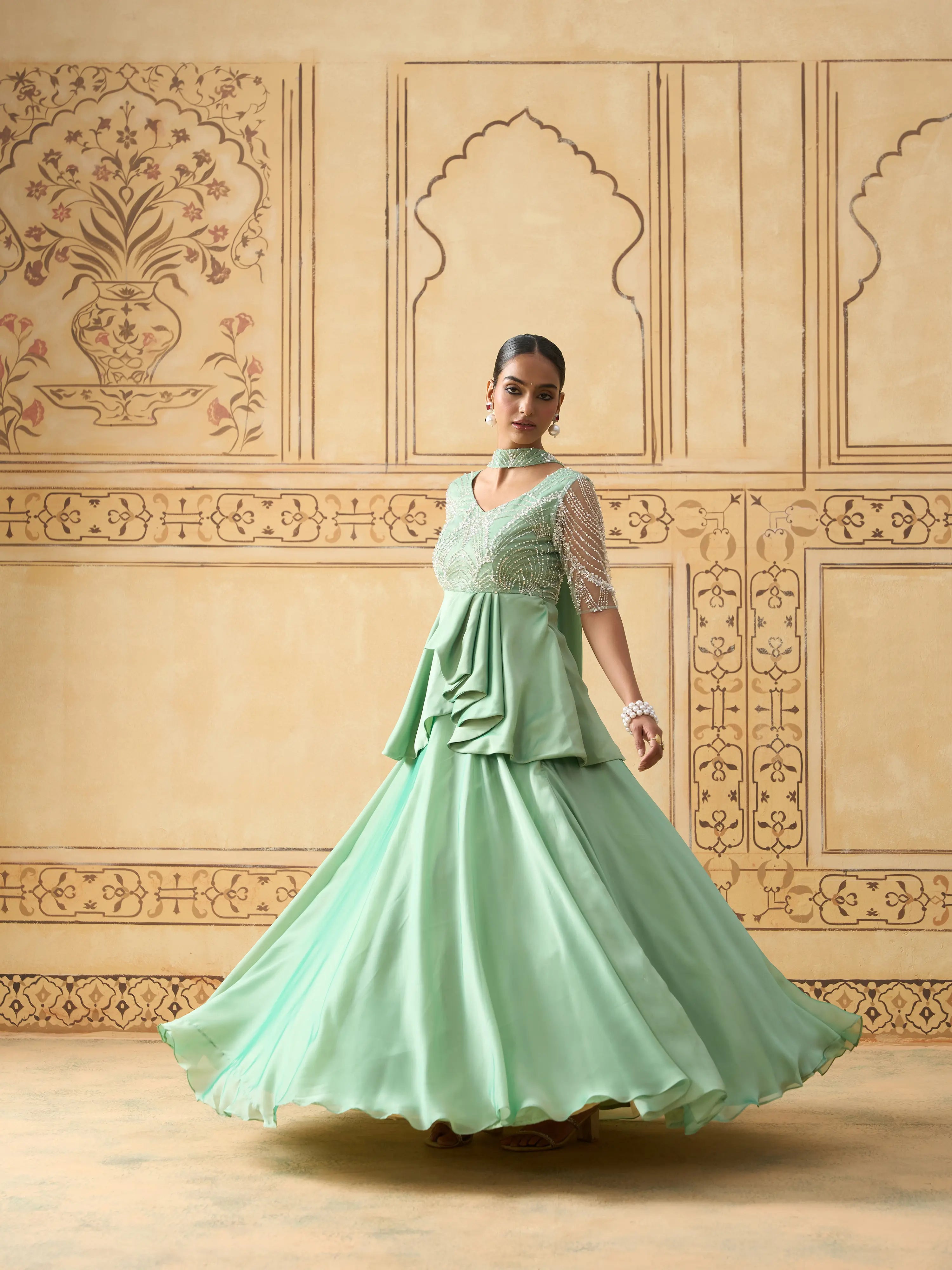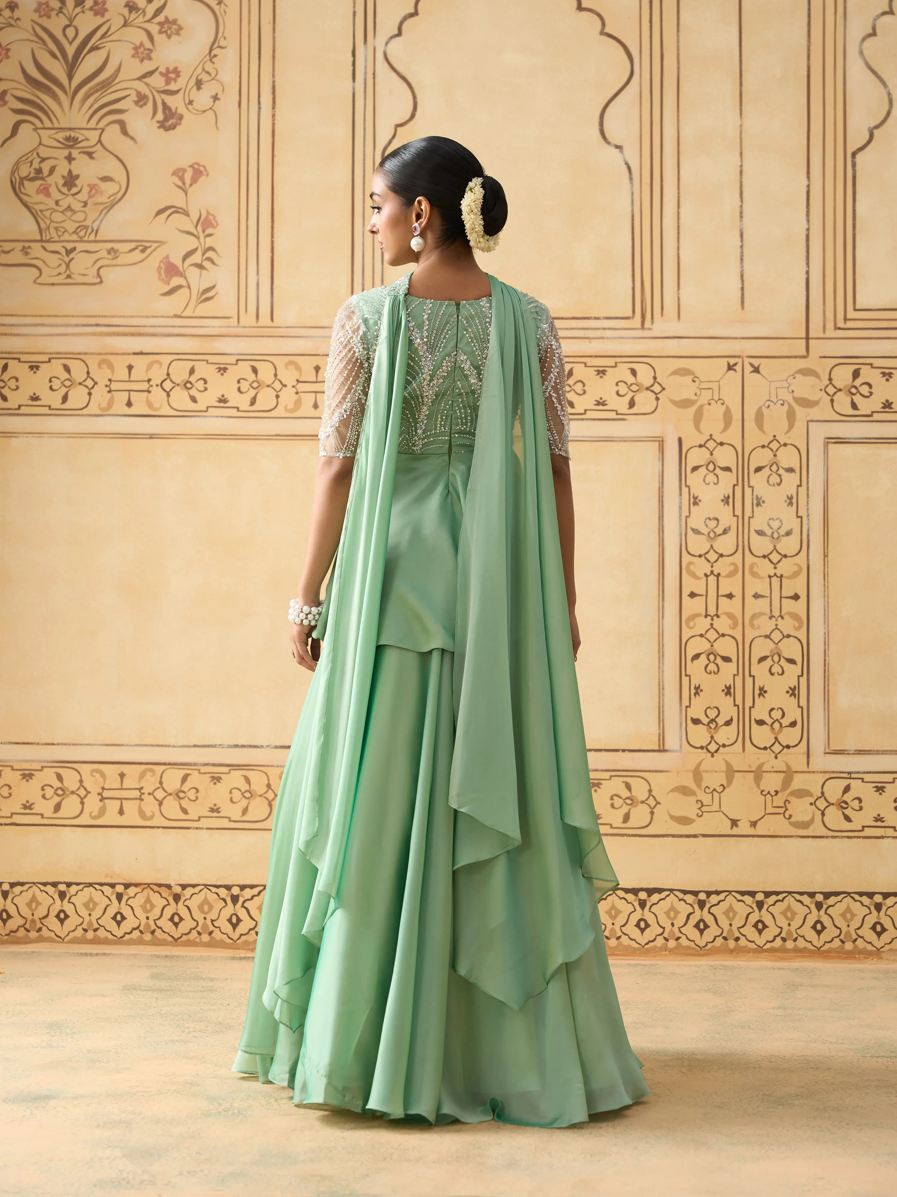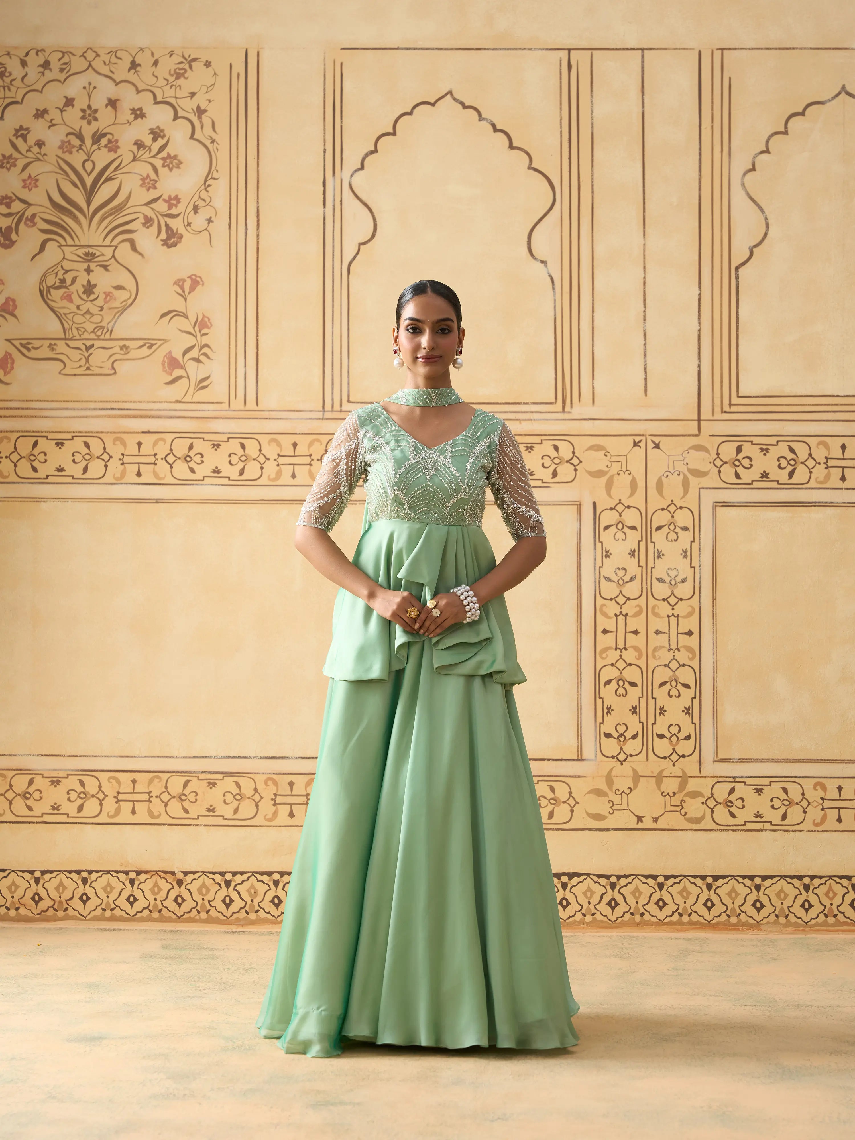 | Description | A contemporary take on festive elegance, this lehenga set features a mint green pleated peplum top with a yoke in pearl-work embellished fabric for a subtle shimmer. The structured peplum flows into cascading satin georgette layers, paired with a voluminous skirt. A sheer lightweight dupatta completes the ensemble. Back zip closure. Ideal for daytime celebrations, sangeet nights, or receptions. Best styled with statement pearl jewelry or pastel-toned accessories. |
