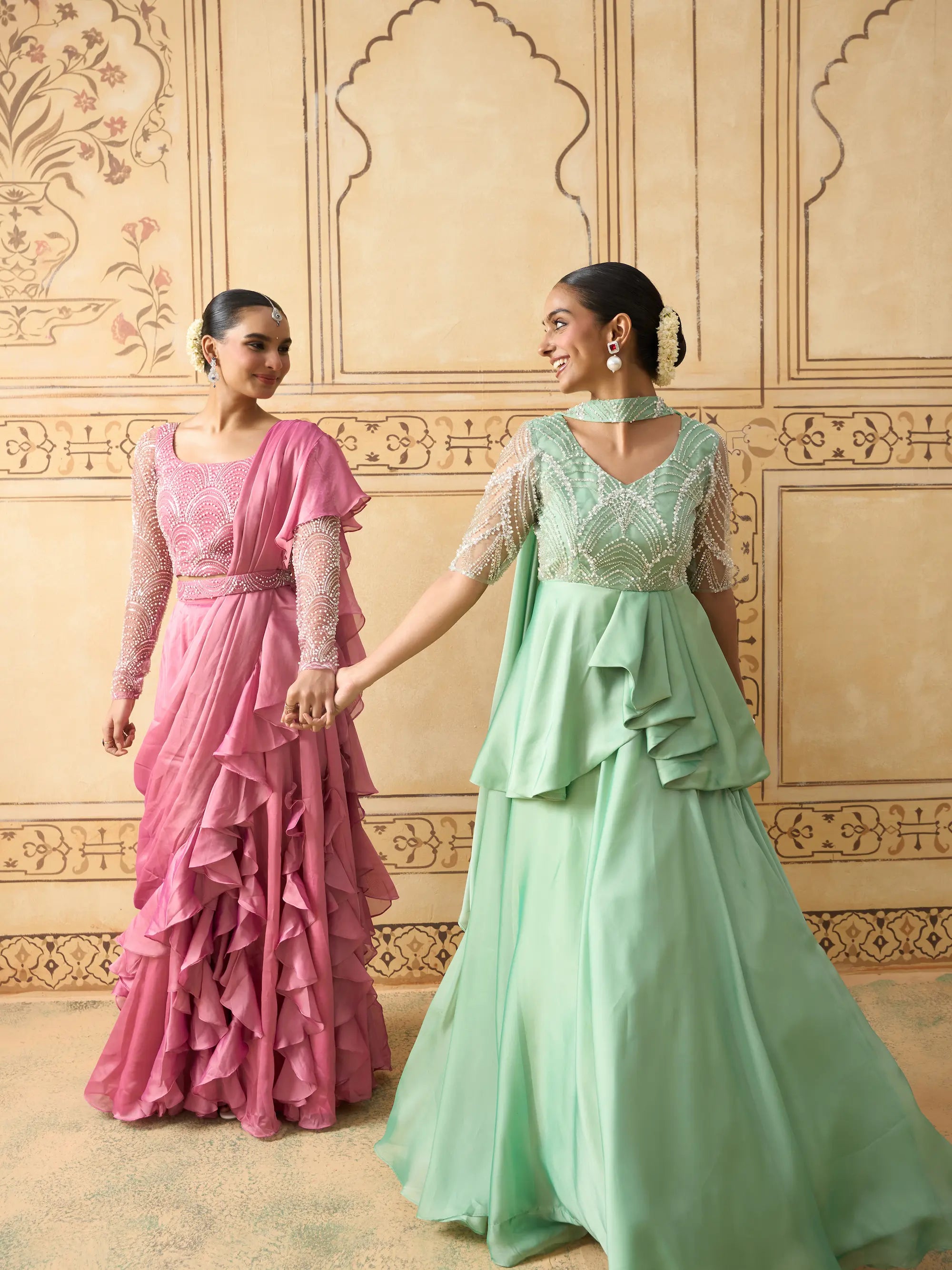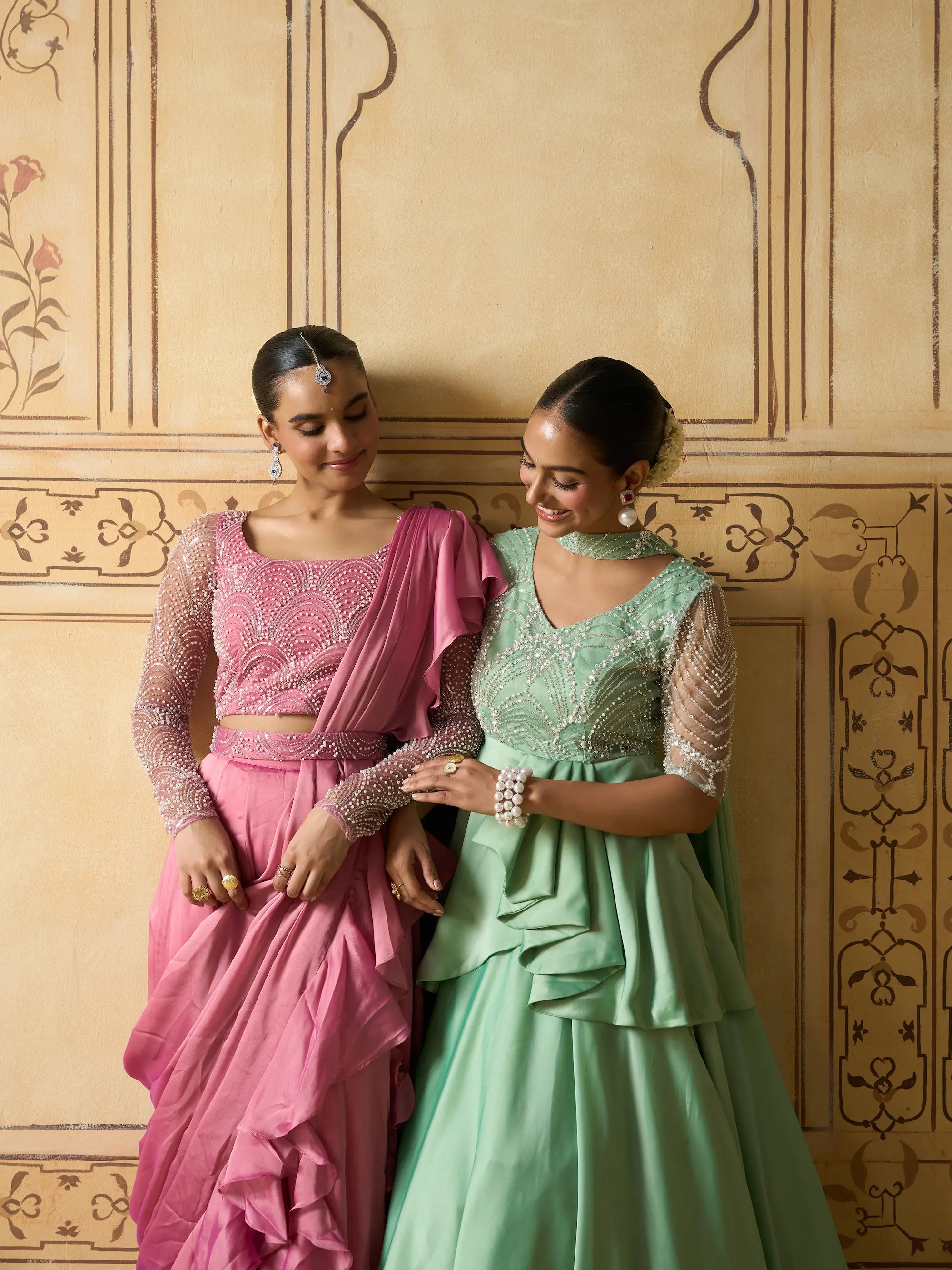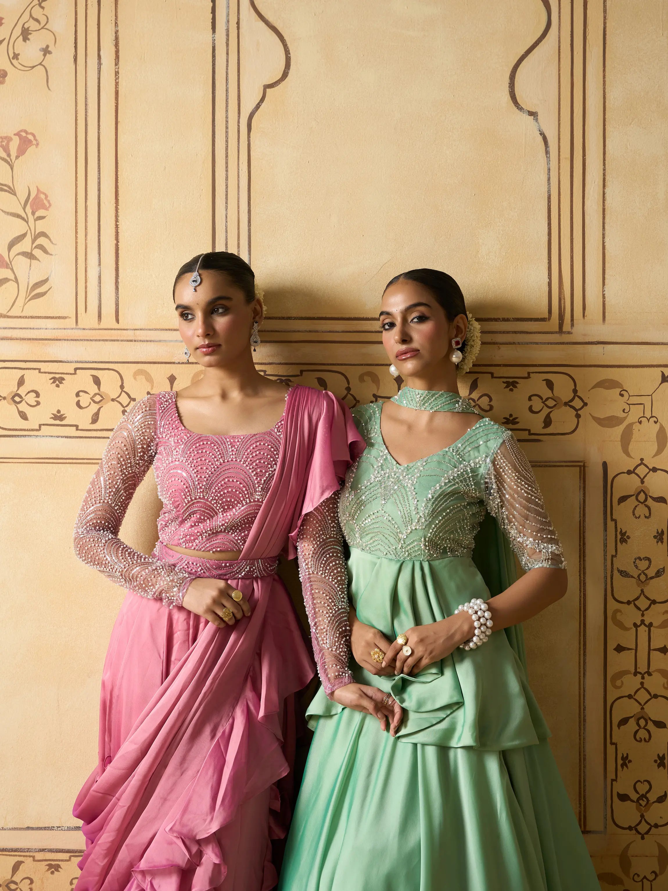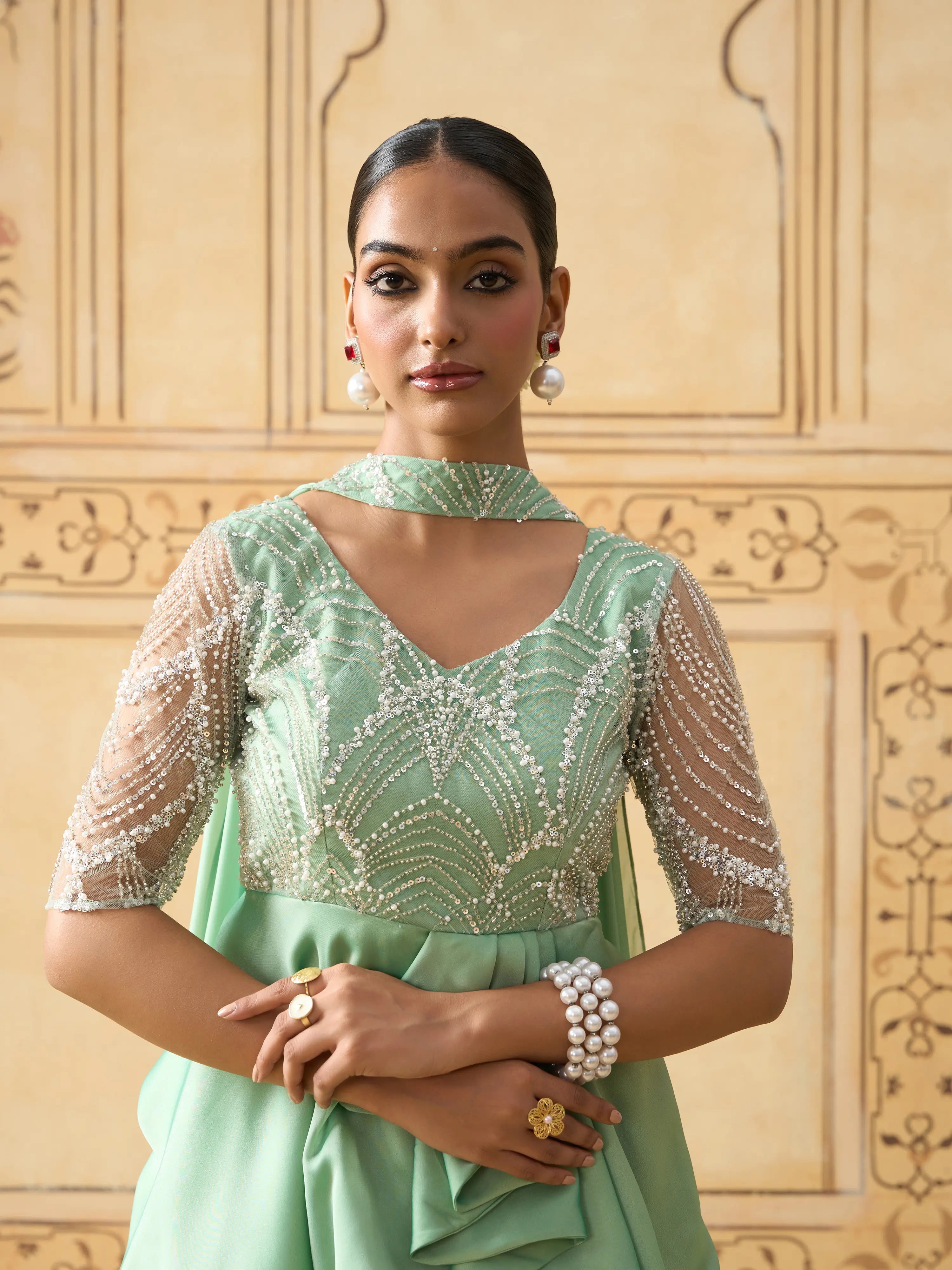 | Description | A contemporary take on festive elegance, this lehenga set features a mint green pleated peplum top with a yoke in pearl-work embellished fabric for a subtle shimmer. The structured peplum flows into cascading satin georgette layers, paired with a voluminous skirt. A sheer lightweight dupatta completes the ensemble. Back zip closure. Ideal for daytime celebrations, sangeet nights, or receptions. Best styled with statement pearl jewelry or pastel-toned accessories. |