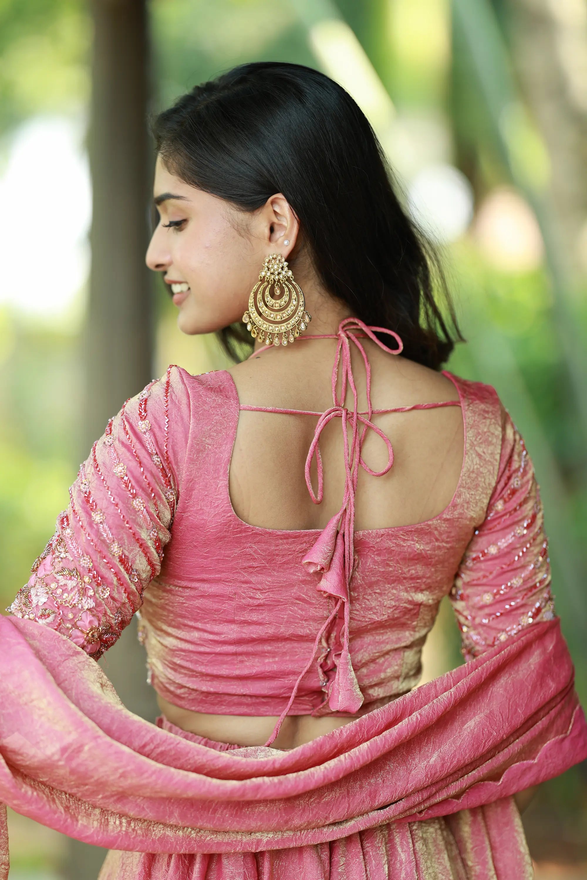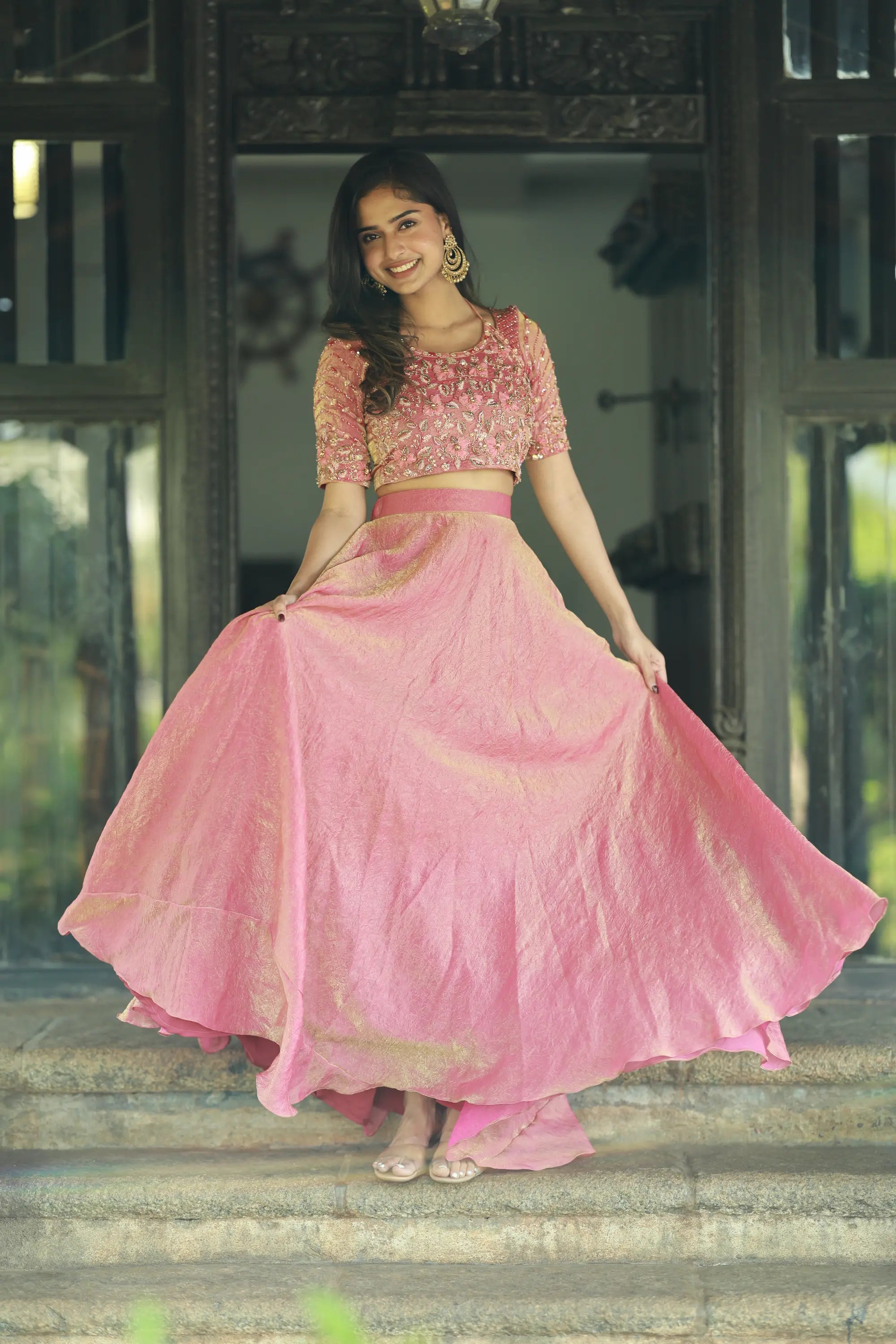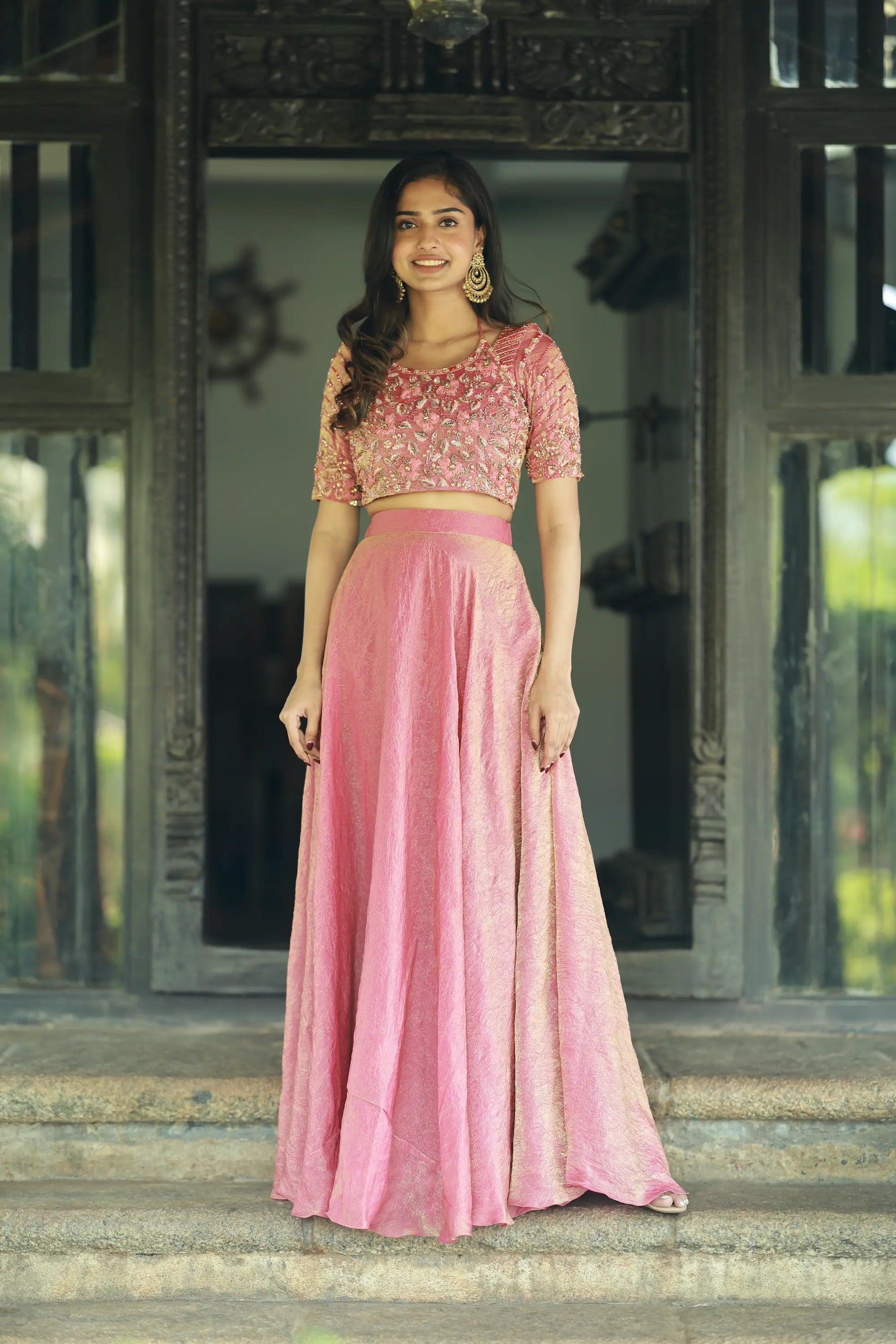 | Description | Fully handworked blouse with intricate zardosi designs, paired with a fully flared skirt and matching dupatta. This ensemble combines traditional craftsmanship with a graceful, flowing silhouette. |